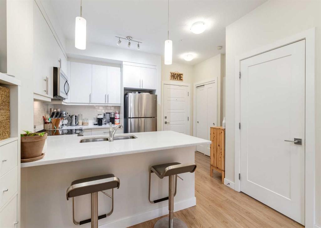 Step into the perfect hideaway, tailor-made for one or two lucky souls. This condo is like a Swiss Army knife of functionality and style, complete with an eating bar and a walk-through closet that's cooler than the other side of the pillow. And oh, the balcony! It's your front-row seat to soak in those sweet south-facing views of a lush, green paradise. Now, let's talk features. Picture yourself in a space with 9-foot ceilings, big windows that let the sunshine dance in, fancy luxury vinyl plank flooring, and cabinets that close so softly you'd think they're whispering sweet nothings. Plus, there's a gas line rough-in for your BBQ game. But wait, there's more! You'll also score a storage locker, a parking spot that's not underground, stainless steel appliances, a washer and dryer, and countertops so fancy they're made of quartz. And let's not forget the perks of the hood. You're just a hop, skip, and a jump away from the Brookfield YMCA, the South Health Campus, VIP Cineplex, and even a dog park! Public transit, restaurants, shopping, and schools? Yeah, they're all on the menu too. Did we mention this was a former showstopper of a suite? You could be moving in and making it your own cozy haven in as little as 20 days!