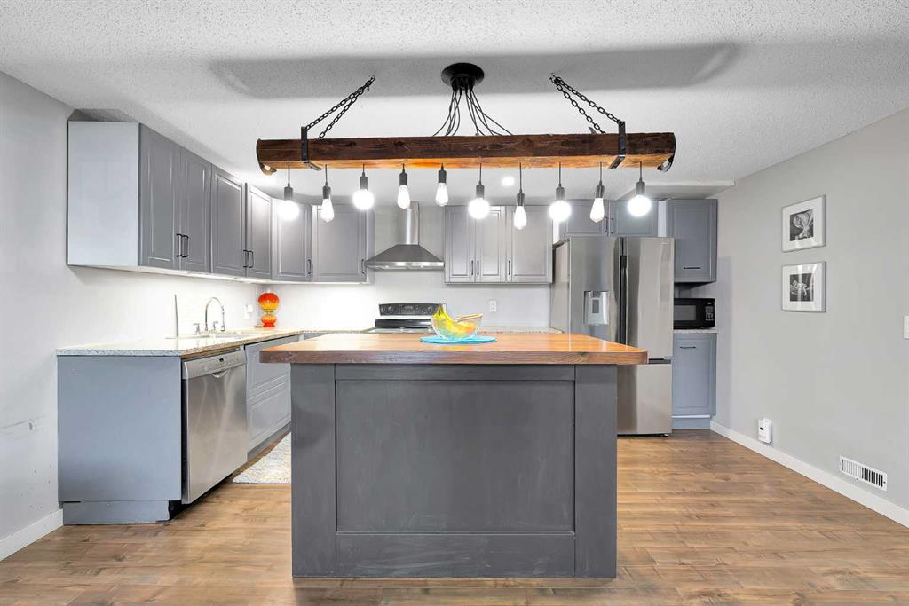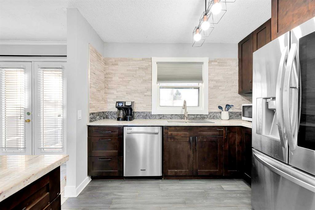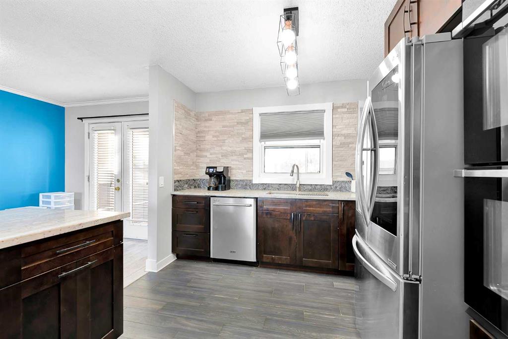 Fantastic opportunity in a great neighborhood . This bi-level home is located on a massive pie lot and has had substantial renovations which include both kitchens , all 3 bathrooms , newer lvp flooring , newer windows , newer garage ( almost 25 ft x 20 ft ) with oversized parking pad for additional parking , room for an RV . A newer fence encompasses the large lot . A total of 5 bedrooms ,3 on the main including a lovely primary suite with walk in closet and 5 piece luxury ensuite . The main level boasts an open plan with Island kitchen , newer appliances , larger windows , easy access to the enclosed , south facing sun room ( 20 ft x 10 ft ) large windows and a step down to ground level patio . The lower level is bright and inviting with 2 full bedrooms , an updated 4 piece bath , separate laundry room . The spacious open plan has an island kitchen and breakfast bar , offering plenty of counter space and cupboard space . A cozy living room caps off this well designed lower level . This is a great opportunity for a full rental ( up and Down ) or live up , rent down .
