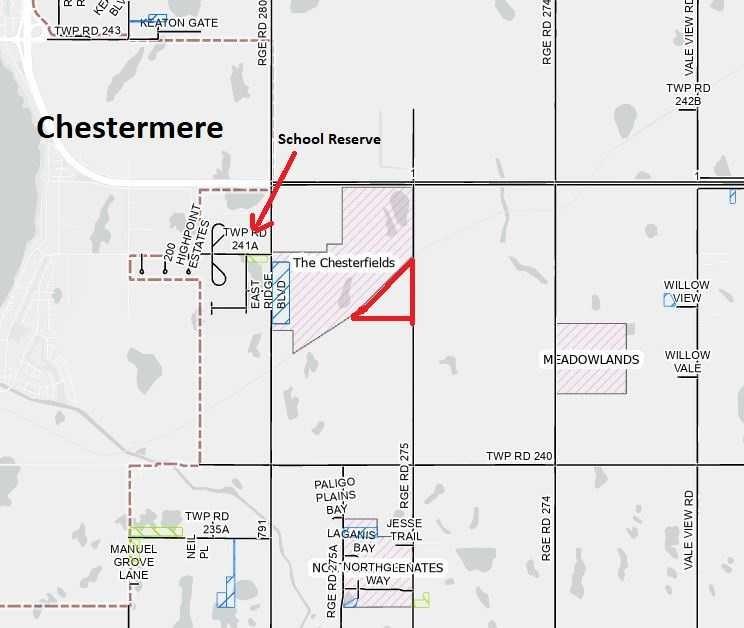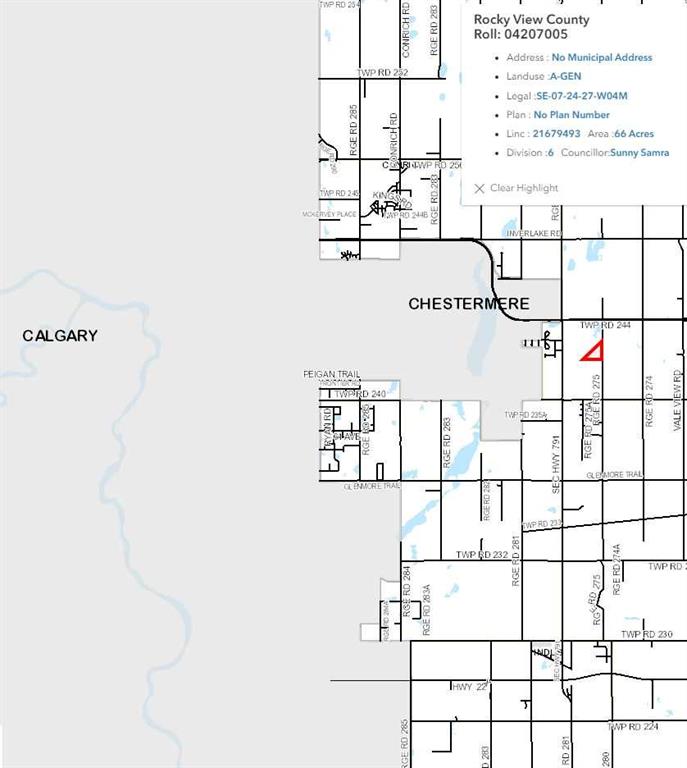 Exceptional PROPERTY FOR FUTURE DEVELOPMENT (subject to approvals) and with a view of the mountains. There is IDEAL ACCESS to this property, being 1 kilometer south of the TransCanada Highway, 2km from Chestermere Airport, and adjacent to a CN railway line. To the west 1 kilometer is Chestermere High School, the City of Chestermere is 3km, and Calgary is 11 km away. UTILITIES ARE CLOSE by as well. This slow-rolling land is cleared and being farmed. There are current and past development plans for the properties to the north and south. The Dehavilland Field airport property is just 11km east.