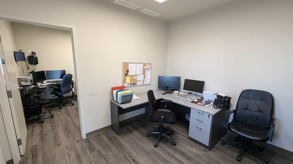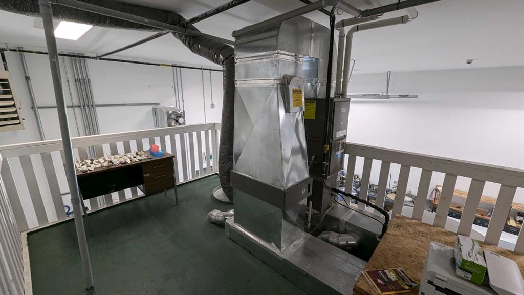 This flexible industrial condo has a lot to offer for its size. Features include a reception area and two private offices with exterior windows. There are two, 2-piece bathrooms one in the office and one in the shop space. There is also a mezzanine with storage below, as well as forced air and air conditioning for the office and unit heater for the shop. The shop offers 18’ ceilings, a drive-thru bay with two 14’ x 16’ overhead doors, trench floor drains, full-size makeup air unit, and 200 amp, 3-phase electrical service providing all the extra features that have become essential to modern industrial occupants, that are not available in most industrial bays of this size. The condo unit’s demising wall is a 2-hour fire rated wall.
