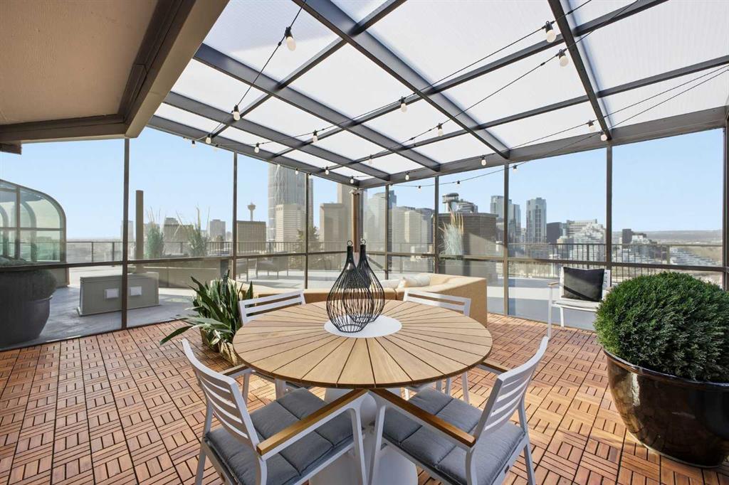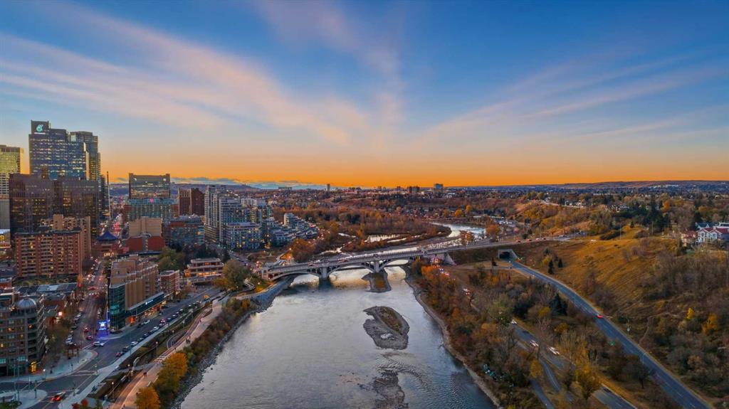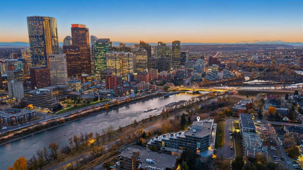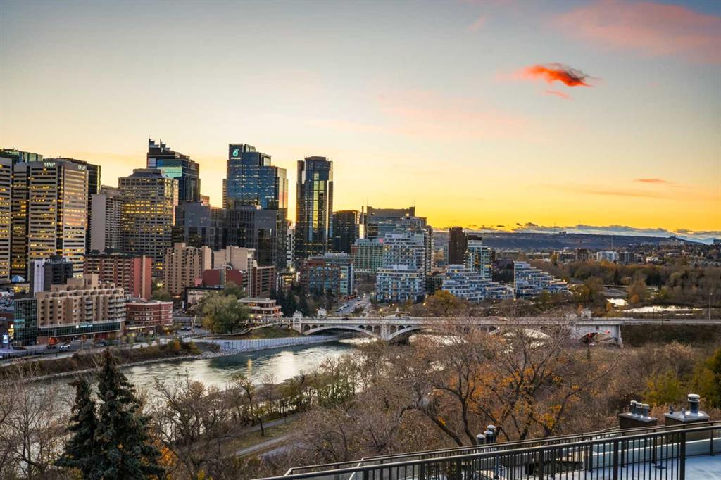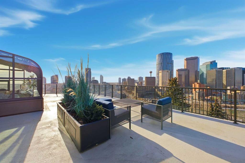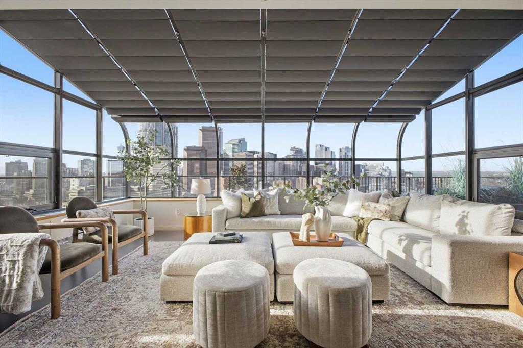 Overlooking the city skyline, mountains, and river valley — quietly extraordinary, a rare hidden gem. This architecturally distinctive 2 bedroom penthouse offers nearly 2,400 sq ft of refined interior living, a sprawling ~1,920 sq ft private terrace, and a 400+ sq ft screened outdoor retreat, all framed by breathtaking panoramic views. Set within a solid brick and concrete building from an era known for generous proportions and enduring construction, this residence offers exceptional space, privacy, and timeless design for those who appreciate quiet, understated luxury — a home you would never expect to find here. Organic Marmoleum flooring crafted from natural linseed oil and cork extends throughout the entire residence, featuring custom inlay detail that enhances the architectural flow of the home. The chef-inspired kitchen showcases Grey Elm veneer cabinetry with plenty of storage space, pull-out pantries, quartz countertops, and an expansive island with seating for up to 10 guests, alongside Wolf appliances and a more intimate dedicated dining space. A sculptural Stûv 360-degree rotating wood-burning fireplace anchors the interior and is visible from the kitchen, living area, and indoor sunroom, creating warmth and architectural presence across multiple spaces. The primary suite offers a private retreat with fireplace, remote blinds, extensive custom closets, and abundant integrated storage. A tucked-away office sits discreetly behind the closets, while the spa-inspired ensuite features heated Italian tile flooring, dual vanities, a deep soaker tub, and a steam shower with stunning city-light views. A spacious guest bedroom with its own ensuite, a well-appointed laundry room with Asko appliances, and a hidden-door powder room complete the thoughtfully designed interior. Four independent in-suite heating and cooling systems provide personalized year-round comfort. Over the past five years, significant building modernization — including roof systems, HVAC system replacement, deck membranes, balcony railings, and more — enhances long-term confidence while preserving the enduring strength of this concrete and brick construction. Residents enjoy amenities including a fitness centre, indoor pool, sauna, hot tub, racquet court, billiards room, and library. Two side-by-side indoor parking stalls with storage, a pet-friendly community welcoming pets up to 20 lbs, and a central location within walking distance to Blush Lane Market, Bridgeland and East Village dining, Prince’s Island Park, and the Bow River pathway system complete this rare offering.