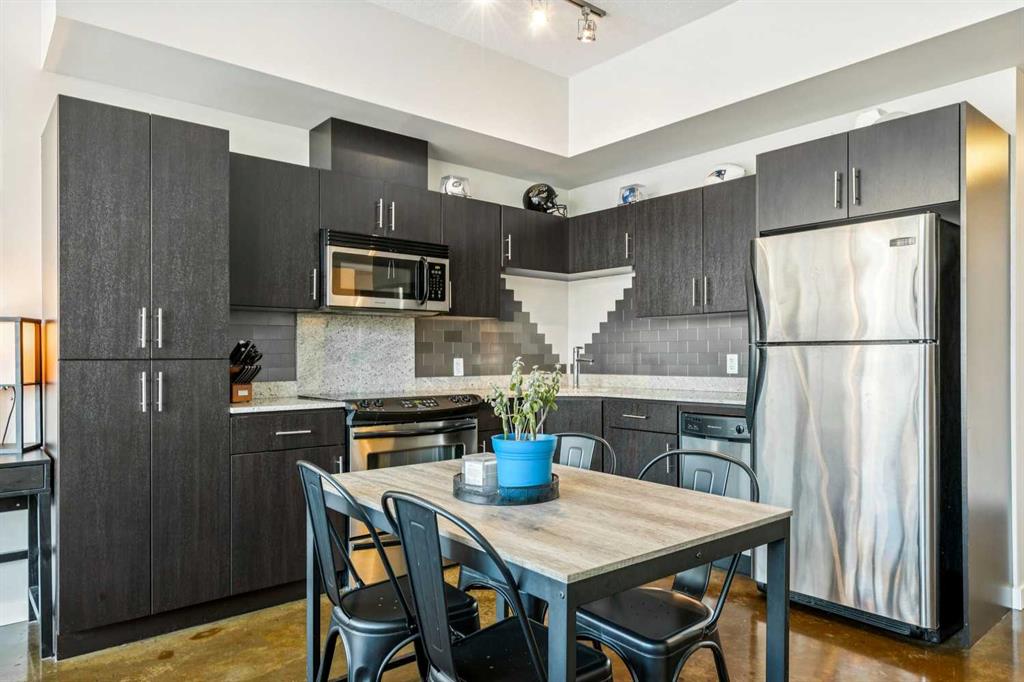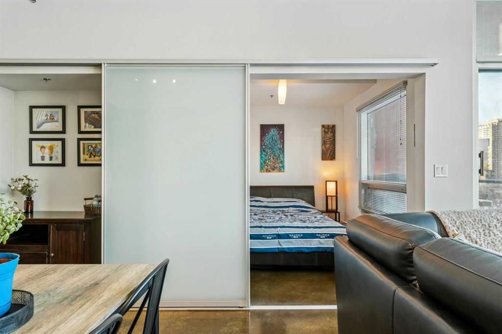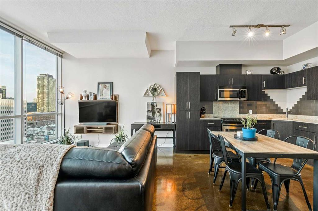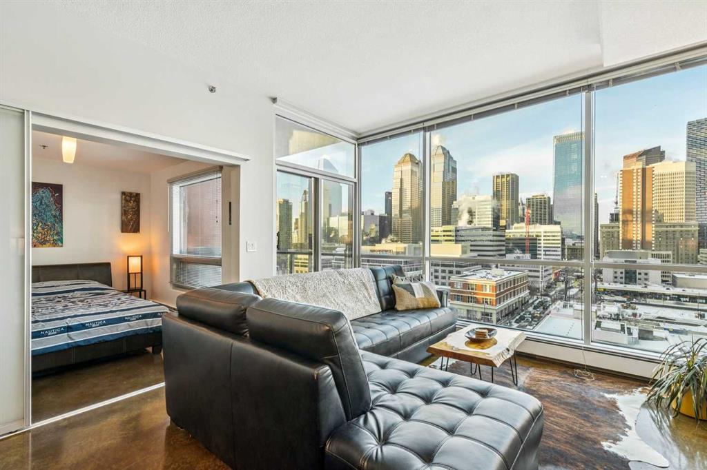 Wake up every day to postcard-worthy views of Calgary’s downtown skyline in the highly sought-after Colours building. This desirable two-bedroom floorplan showcases stunning floor-to-ceiling, north-facing windows that flood the space with natural light and frame incredible city views—an exceptional opportunity for buyers seeking both style and value. Upon entry, you’ll appreciate the polished concrete floors that add warmth and modern character throughout. The open-concept kitchen, dining and living areas offer seamless flow and flexible design possibilities for both everyday living and entertaining. The primary suite serves as a peaceful retreat with captivating downtown views, while the second bedroom easily adapts to your needs—whether as a guest room, work-from-home office, or creative studio. Step outside to your private balcony, complete with a natural gas hookup, perfect for evening barbecues and sunset lounging. Central air conditioning ensures year-round comfort, even on the hottest summer days. Residents of Colours enjoy communal bike storage, rentable private storage units, and a shared outdoor space. Downstairs, indulge in cocktails at the award-winning Proof, or pick up your favorite bottle from Vine Arts before settling in for a cozy night at home. You’re also just steps from First Street Market and acclaimed restaurants like Pat & Betty, Ten Foot Henry, and Calcutta Cricket Club. Enjoy walking access to the Stampede Grounds, the Scotiabank Saddledome, the upcoming Entertainment District, and everything the vibrant Beltline has to offer. Ideal for young professionals, first-time buyers, empty nesters, or investors, Colours is a short-term rental-friendly building—making this an exceptional lifestyle opportunity and a smart investment. This is downtown living at its finest!