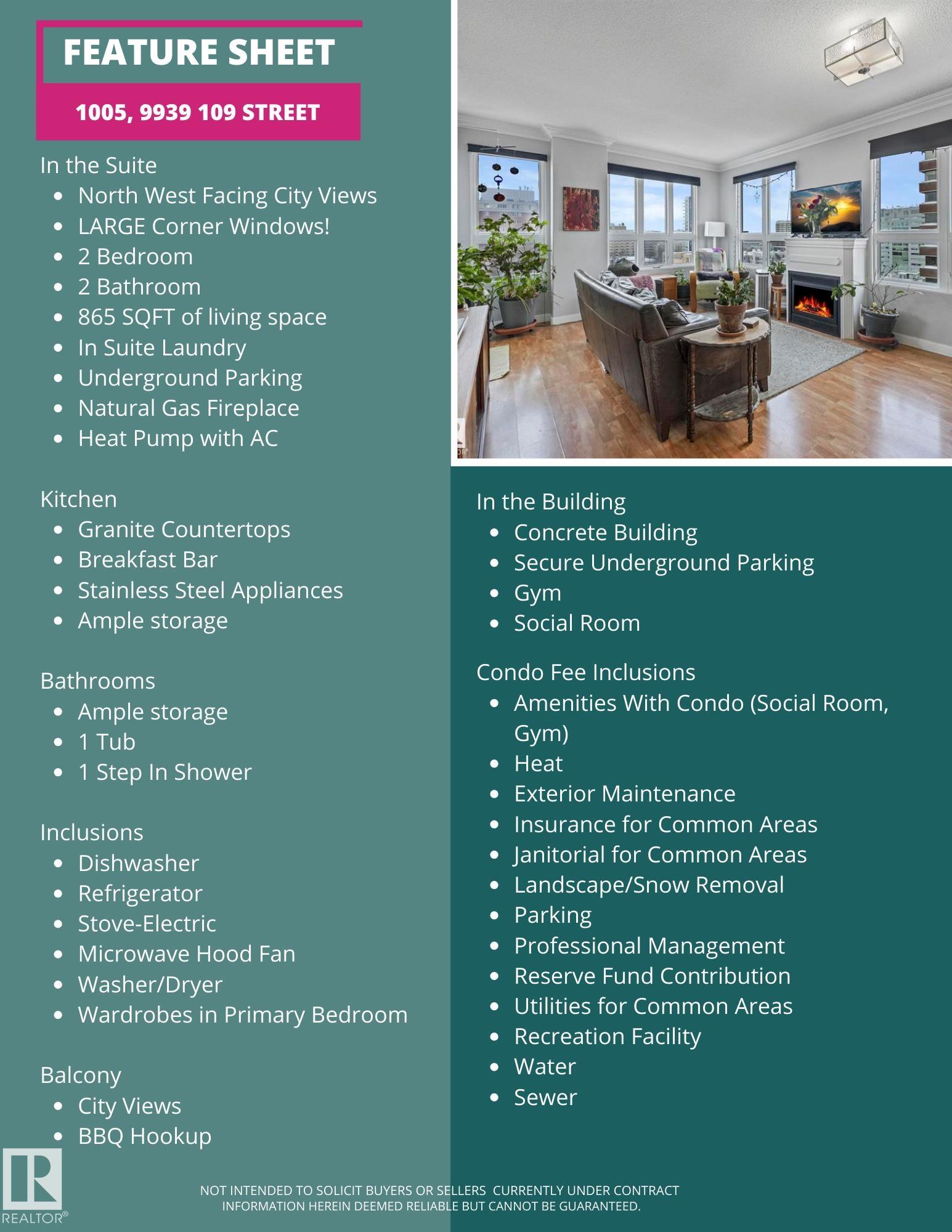 Located just one block from the Legislature grounds, this spacious and beautifully appointed 10th floor condo offers the perfect downtown lifestyle. This bright 2 bedroom + 2 full bath corner unit includes titled, secure & heated underground parking; is walking distance to the LRT, coffee shops, parks, restaurants & all the nightlife downtown has to offer. The open kitchen features granite countertops, breakfast bar & stainless steel appliances, ideal for both everyday living & entertaining. Cozy up by the natural gas fireplace or step outside to enjoy the natural gas BBQ hookup. The primary bedroom includes a wardrobe unit for added storage & full ensuite bath. With west & north exposure you can enjoy incredible views and stunning sunsets over the city skyline. The heat pump system provides both heating & air conditioning for year round comfort. The pet friendly building offers security doors, visitor parking, and a large on site gym. An exceptional opportunity in a prime downtown location.