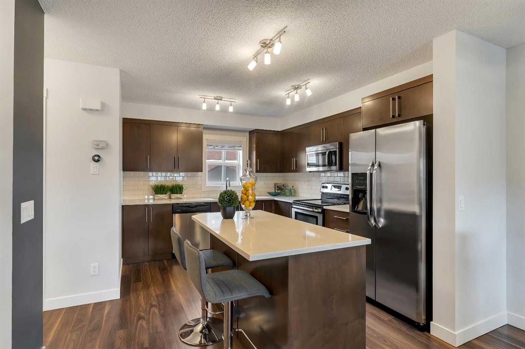 Immaculate END UNIT townhouse in the most DESIRABLE location of the complex! This stunning home offers a 30-foot-plus TANDEM GARAGE with sleek EPOXY flooring, giving you ample space for vehicles, storage, or a workshop area. Step inside to find FRESH PAINT throughout, durable and LAMINATE flooring spanning the space, NEW BLINDS & HOT WATER TANK in this well-cared-for property, you don't need to lift a finger! The main floor is designed for entertaining and everyday living, featuring an OPEN CONCEPT layout with a spacious living room, dining area, and a stylish kitchen with QUARTZ countertops, TIMELESS tile backsplash, sleek STAINLESS STEEL appliances and a CENTRAL ISLAND perfect for additional seating and food prep. A convenient powder room and EAST and WEST window exposure flood the home with NATURAL LIGHT, making the space feel airy and inviting. Upstairs, you'll find two generous bedrooms perfect for guests, roommates or a home office, a full four-piece bathroom, an upstairs laundry, and a SPACIOUS primary suite with its own en-suite bathroom, which is your perfect private retreat. As a STREETSIDE end unit, this home offers plenty of guest parking and enhanced PRIVACY. Located in Kings Heights, you're just minutes from shopping, pathways, schools, and have quick access to 40th Avenue for easy commuting in and out of the city. This is the perfect opportunity for first-time home buyers or investors to step into a meticulously maintained, MOVE-IN-READY home that truly stands out.