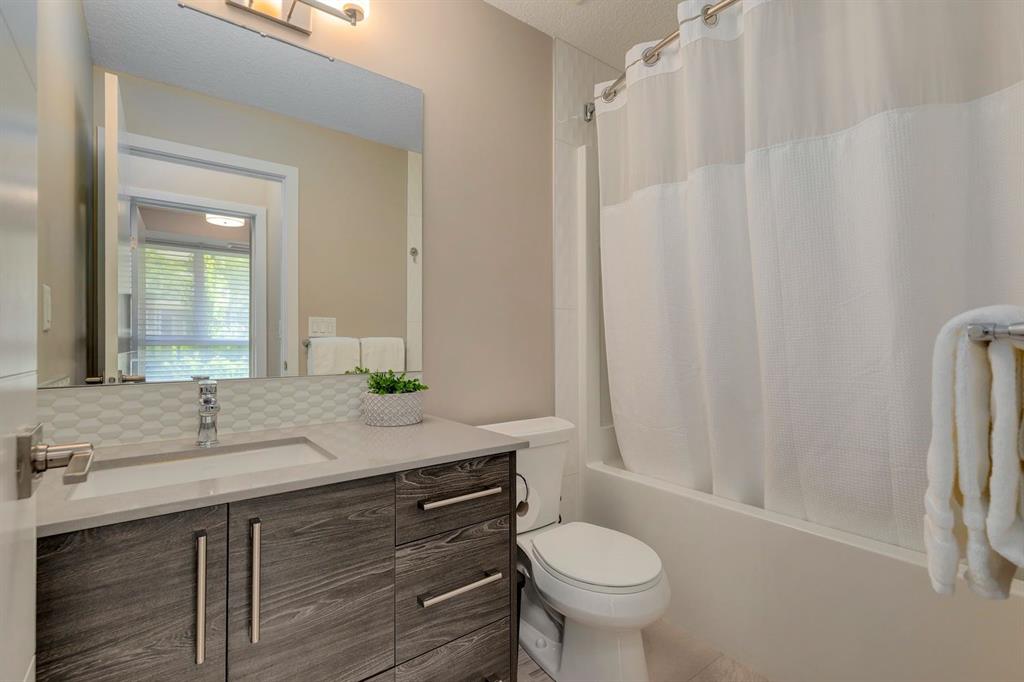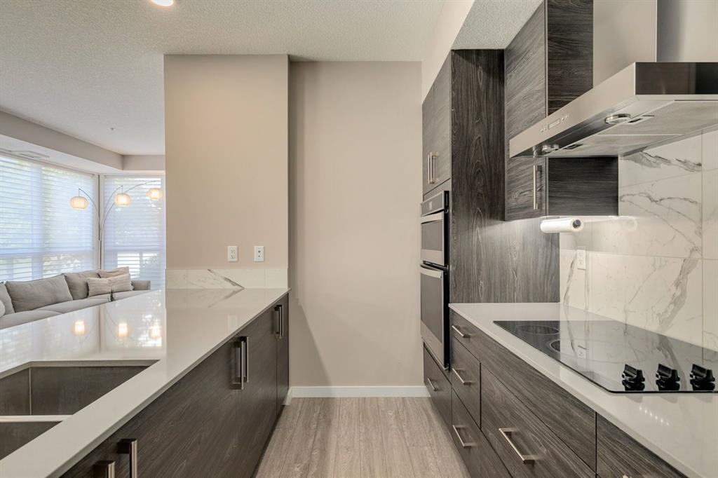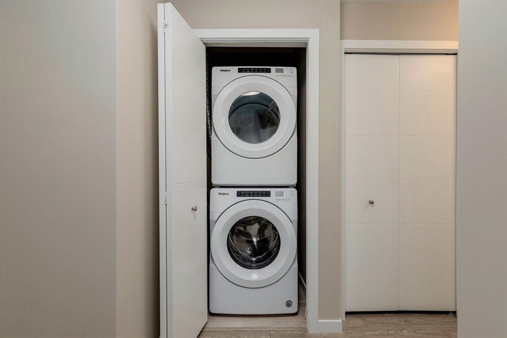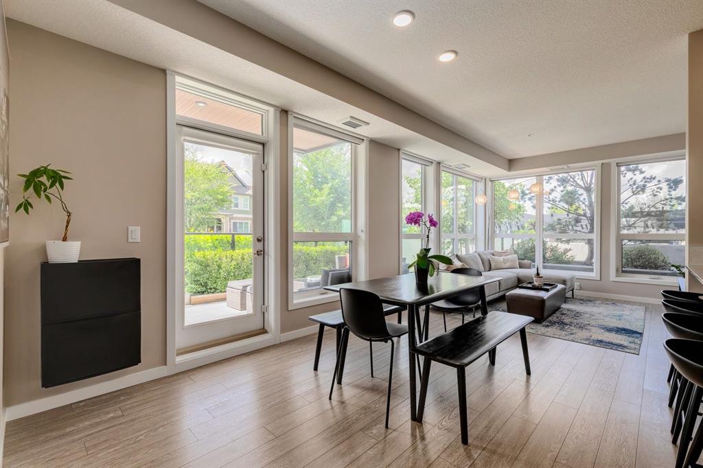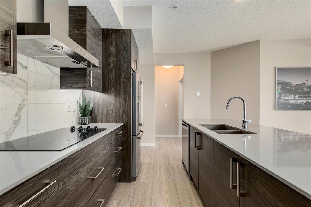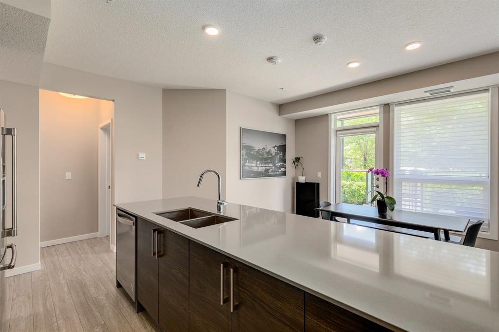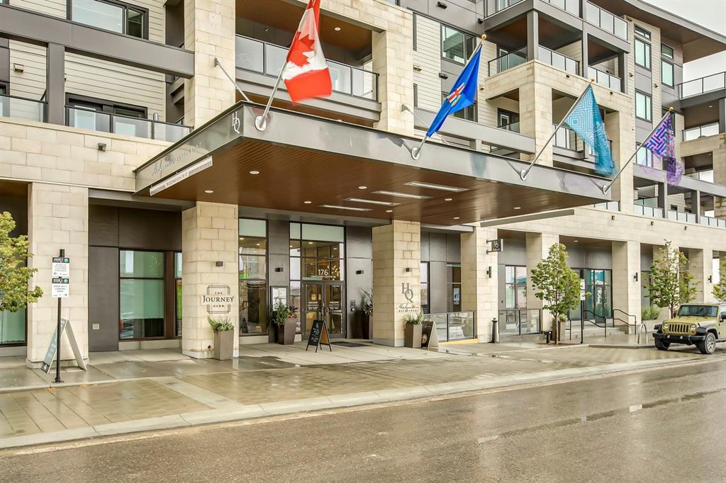 Lake Living in Mahogany is the dream but we kick it up a notch when living at Westman Village ~ Experience elevated, resort-style living in the heart of Westman Village with this beautifully appointed 2-bedroom, 2-bathroom main floor corner air conditioned unit. Perfectly positioned just steps from the adjacent West Beach and the Mahogany boardwalk, this rare offering blends luxury, comfort, and an unbeatable location within one of Calgary’s most amenity-rich lake communities. ~ Spanning 1040 sq ft, this air-conditioned home features 9-foot ceilings, wide-plank luxury vinyl flooring, and an abundance of natural light thanks to its corner-unit layout and additional windows throughout. The modern kitchen showcases sleek cabinetry, quartz countertops, and a stylish neutral colour palette that flows seamlessly into the bright and open living area. From both the living room and the expansive patio, enjoy subtle views of Mahogany Lake and beautifully landscaped courtyard gardens. The oversized, private patio is large and semi private — an ideal extension of your living space, complete with privacy glass and lush greenery, perfect for morning coffee, dining al fresco, or relaxing in the sun. The oversized primary suite is a true retreat, featuring ample space for a sitting area or workspace, custom closets with built-in organizers, and a private 3-piece ensuite with modern fixtures and finishes. The spacious second bedroom includes a walk-in closet and a large window, with easy access to the second full 4-piece bathroom—ideal for guests or flexible use. Additional conveniences include in-suite laundry and a large in-suite storage room. AND you have a separate Storage Locker (rare) purchased from developer. This home also includes a titled underground parking stall and access to Westman Village’s world-class amenities. The 40,000+ sq ft Village Centre offers a lifestyle unlike any other, including a fitness facility, indoor pool, walking track, golf simulator, gymnasium, wine room, library, art studio, and more. Residents also enjoy a dog wash, car wash bay, guest suites, and 24-hour on-site security. But what truly sets this location apart is its immediate proximity to West Beach—with sandy shores, lake access, and endless recreational opportunities just out your front door. Within the village, you’re steps from boutique retail, a full-service pharmacy, and some of Calgary’s best dining: enjoy brunch at Diner Deluxe, fine dining at Chairman’s Steakhouse, cocktails and live music at Alvin’s Jazz Club, or a casual night out at Mash. Start your mornings with Analog Coffee, located just around the corner. This is your opportunity to enjoy the best of lake living with all the benefits of a low-maintenance, lock-and-leave lifestyle. Book your private showing today and discover how life at Westman Village truly feels like a resort—every single day.