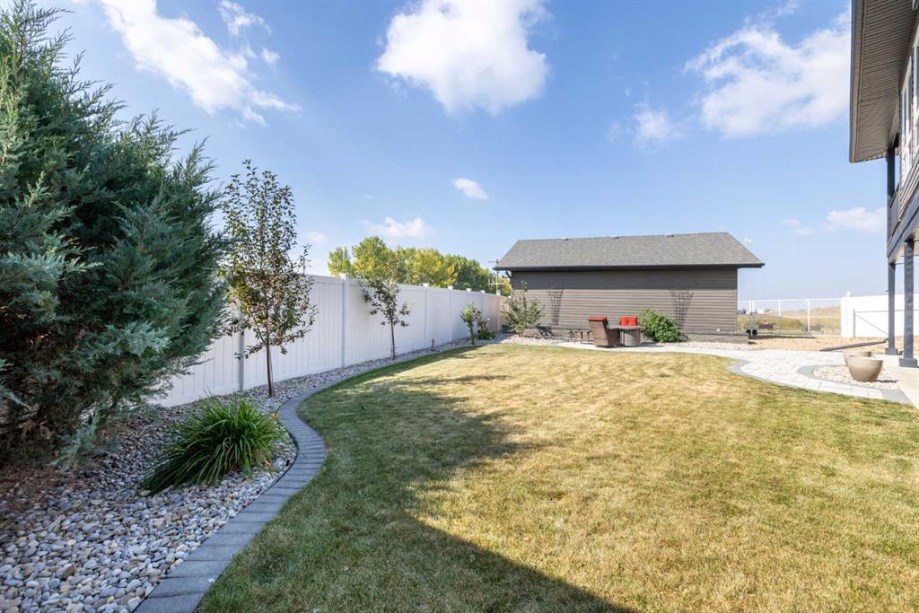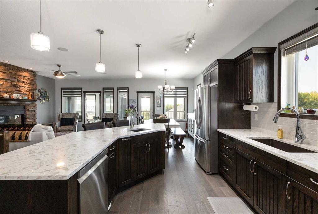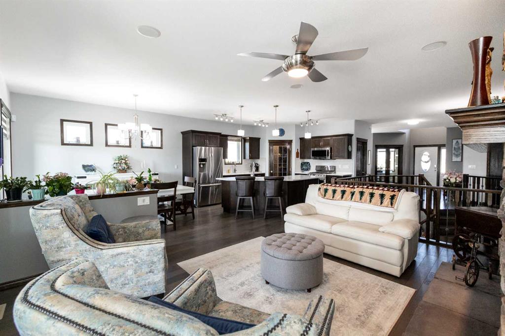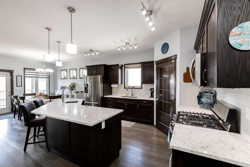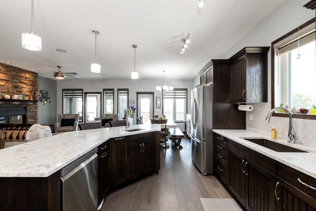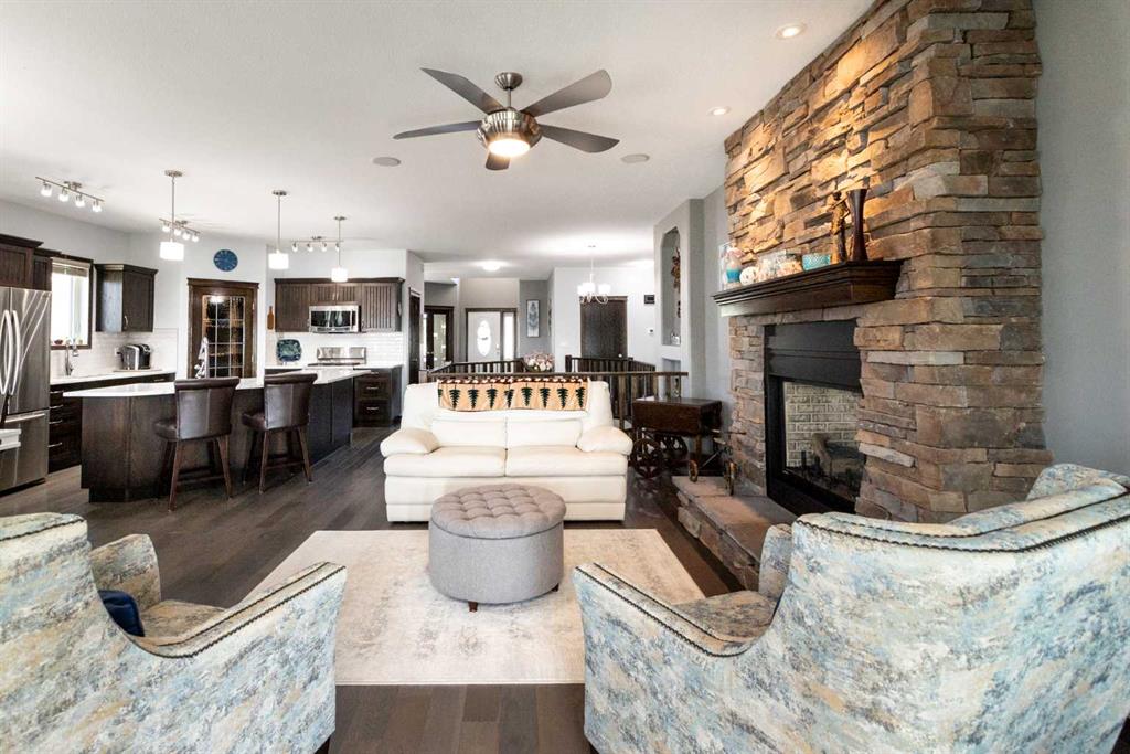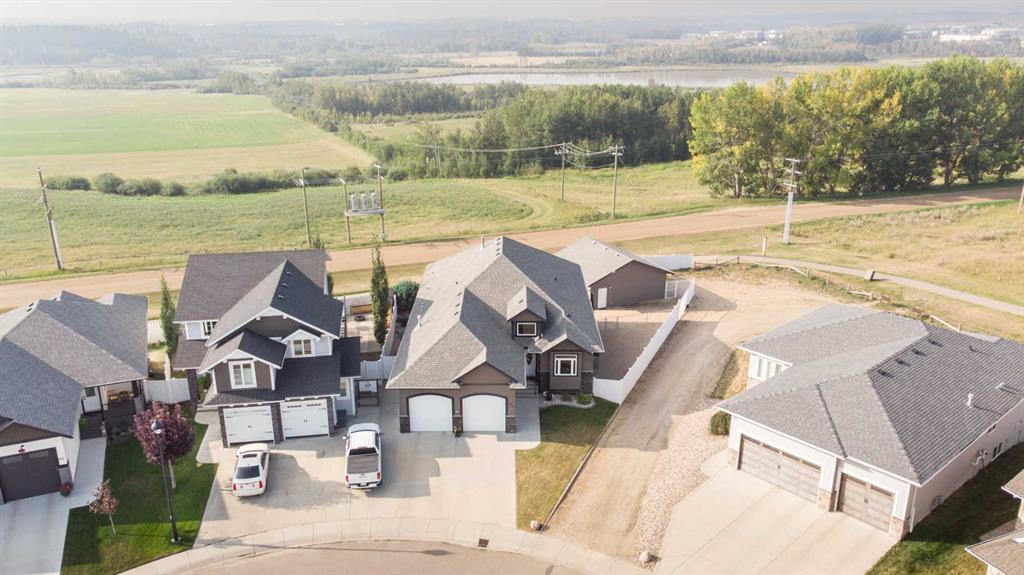Experience luxury living at its finest in this custom-built, over 4,000 sq. ft. fully finished bungalow in Blackfalds! Designed for comfort, style, and entertaining, this home boasts no rear neighbours, breathtaking views, and both a double front attached heated garage plus a huge detached heated garage with alley access and RV parking. Inside, enjoy 9-ft ceilings, triple-pane windows, in-floor heating, and expansive natural light. The main level features a spacious kitchen with walk-in pantry, large island, stainless steel appliances, and separate dining area, plus a luxurious master suite with private deck access, grand walk-in closet, and spa-inspired ensuite with jetted tub and heated tile floors. The living room impresses with a two-sided stone fireplace flowing into the all-season heated sunroom, perfect for year-round enjoyment of the views. The lower level is a true entertainer’s dream, featuring a double-insulated media/studio room, 3 additional bedrooms, and a wet bar with cozy fireplace. With ample storage and direct access to the patio and beautifully landscaped backyard, it’s perfect for hosting gatherings, enjoying summer activities, or letting pets roam freely. Additional highlights include air conditioning, hardwood floors, and a fantastic neighbourhood. This bungalow delivers exceptional craftsmanship and features rarely found in Blackfalds, offering a lifestyle of space, luxury, and convenience.