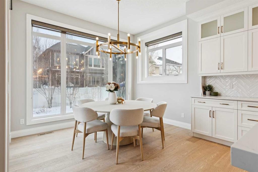This is a home that thoughtfully accommodates real family life with space for work, rest, and entertaining, beautifully arranged across more than 4,500 square feet. Situated on a convenient, walkable street in West Springs, the property is close to some of Calgary’s best schools, parks, recreation, and everyday amenities, all within easy reach. On arrival, you’re greeted by an impressive vaulted, curved-ceiling office complete with custom built-ins and a striking two-sided fireplace, a space that works equally well for focused work or relaxed conversation. From there, the main living area opens with 10-foot ceilings and expansive west-facing windows that flood the home with natural light. A full brick feature wall with oak mantle and built-ins anchors the family room, seamlessly connected to a chef’s kitchen outfitted with JennAir appliances, custom cabinetry, and generous prep space. The dining area opens directly onto the composite deck and west backyard, ideal for evening sun and family gatherings. A thoughtfully designed walk-through pantry connects the kitchen to a well-appointed mudroom with custom storage, leading to the oversized, fully finished triple garage with epoxy floors. Upstairs, soaring ceilings and skylights continue the sense of openness. The primary retreat is expansive, featuring vaulted ceilings, large west-facing windows, and an additional double-sided gas fireplace that adds warmth and character. A private lounge area with built-in bar creates separation within the suite, offering both scale and privacy. The spa-like ensuite includes heated floors, a freestanding soaker tub, and a beautifully designed oversized shower that feels more like a private retreat than a typical bathroom. The generous walk-in closet offers extensive custom storage and connects directly to the laundry room for everyday convenience. Three additional bedrooms complete the upper level - one with its own ensuite, and two sharing a well-designed bath with double sinks and a separate water closet, ideal for busy mornings. The lower level continues the thoughtful design with 9-foot ceilings and heated hardwood floors throughout. A spacious rec room, dedicated gym, and fully equipped second kitchen make this level ideal for entertaining or everyday flexibility. Just off the kitchen is a dedicated wine and storage room, adding both function and character. A fifth bedroom and full bath complete the space. Many of the home’s key spaces - including the kitchen, living area, primary ensuite, fireplaces, powder room, and garage - were tastefully updated in 2022, blending timeless design with enduring quality.