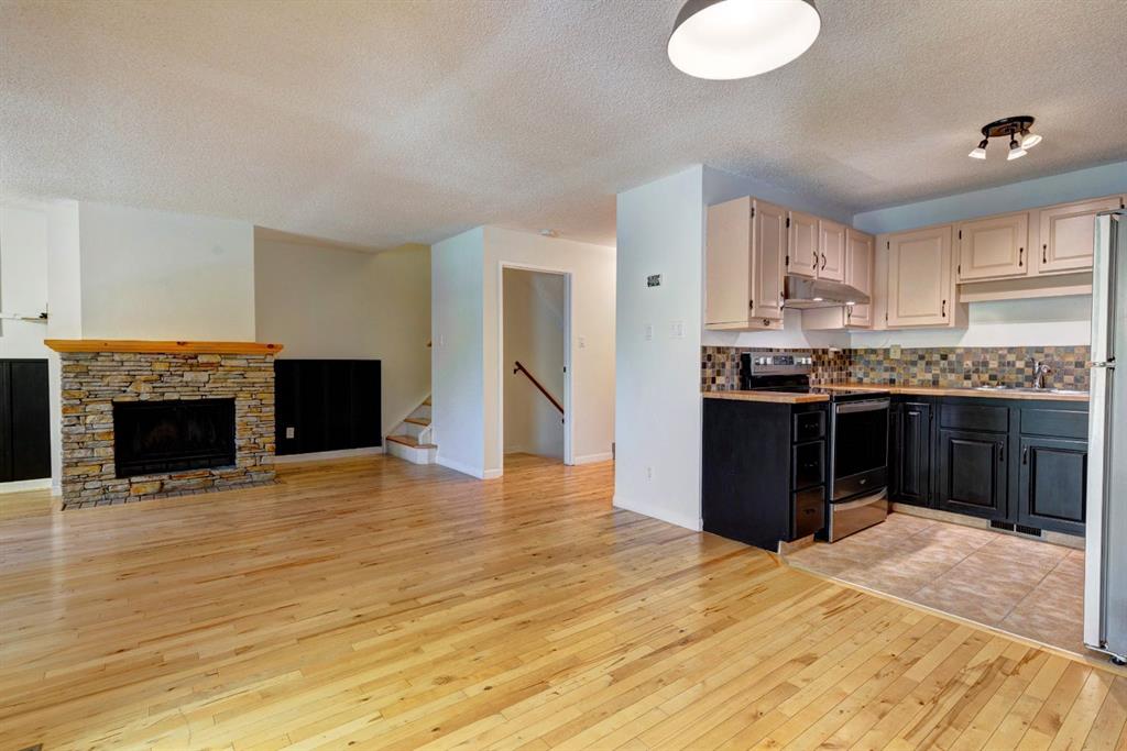 Three bedroom townhome walking distance to downtown. Thoughtfully updated and freshly painted property, offering nearly 1,800 sq ft of comfortable living across three well-designed levels. The main floor boasts a bright, functional kitchen that flows seamlessly into a spacious living room with a cozy fireplace and an inviting dining area — perfect for everyday living or entertaining. Step outside to the oversized deck, ideal for soaking up the sun or hosting relaxed outdoor gatherings. Upstairs, you'll find three generously sized bedrooms and a four-piece bathroom, providing plenty of space for the whole family. The fully developed lower level adds even more living space with a large family room and ample storage options. Additional highlights include an attached carport with room for two cars, separate storage — perfect for bikes, skis and gear. Located in a well-maintained, professionally managed complex just minutes from downtown, the Bow River and endless hiking and biking trails.