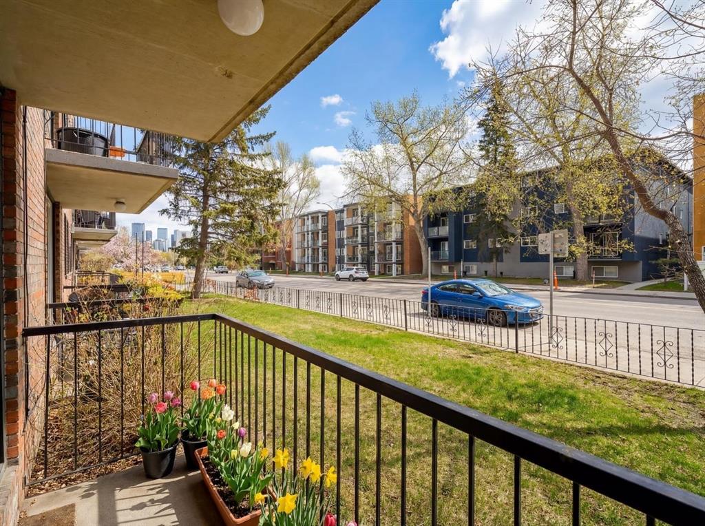 Charming and spacious ground-floor corner condo offering around 800 sq ft of comfortable, low-maintenance living in a highly walkable location. This beautifully updated 2-bedroom, 1 full 4-piece bath unit features gleaming hardwood floors and fresh paint throughout, creating a warm, move-in-ready space in Sunnyside! You’ll love the open-concept layout that seamlessly connects the renovated kitchen to the living room. The kitchen boasts granite counter tops, newer cabinets, and modern finishes, making it perfect for cooking and entertaining. The bright living room includes an elegant electric fireplace and opens onto a large, private south facing balcony – ideal for relaxing or enjoying your morning coffee. The totally renovated bathroom offers contemporary fixtures and a clean, stylish design. Additional updates include newer windows and interior doors, as well as a convenient new stacked washer and dryer in-suite. There is a handicap accessible ramp in front of the building . An assigned surface parking stall is included for your convenience. Located just a short walk to shops (Safeway), bus stops, Sunnyside LRT station, next door to Acme Pizza and nearby parks, this condo combines comfort, style, and an unbeatable inner-city lifestyle. Aggudo Coffee, Flippin Burgers, Kim’s Katsu, Regal Cat Café, Bombay Tiger, Red’s Diner.. just to name a few eateries minutes from your home. Perfect for first-time buyers, downsizers, or investors!