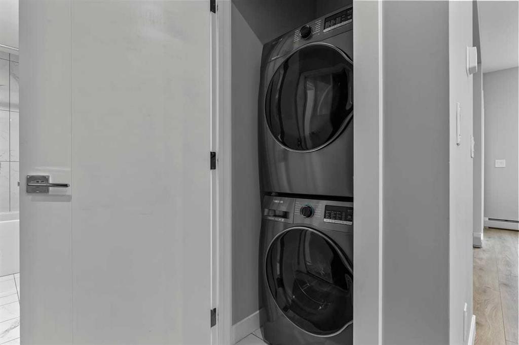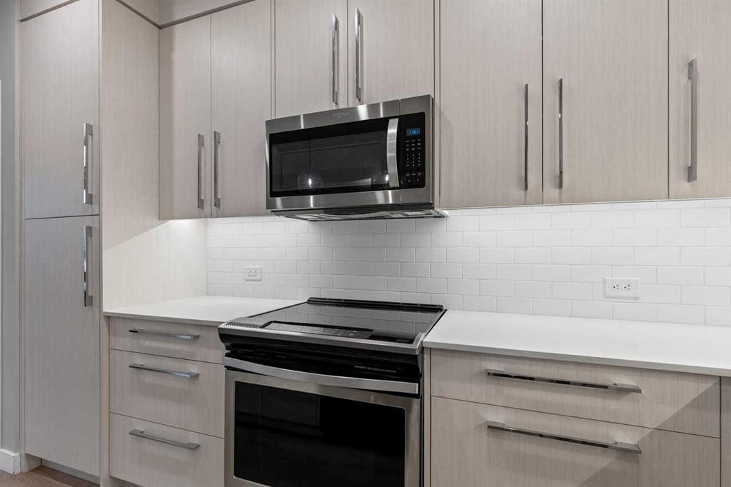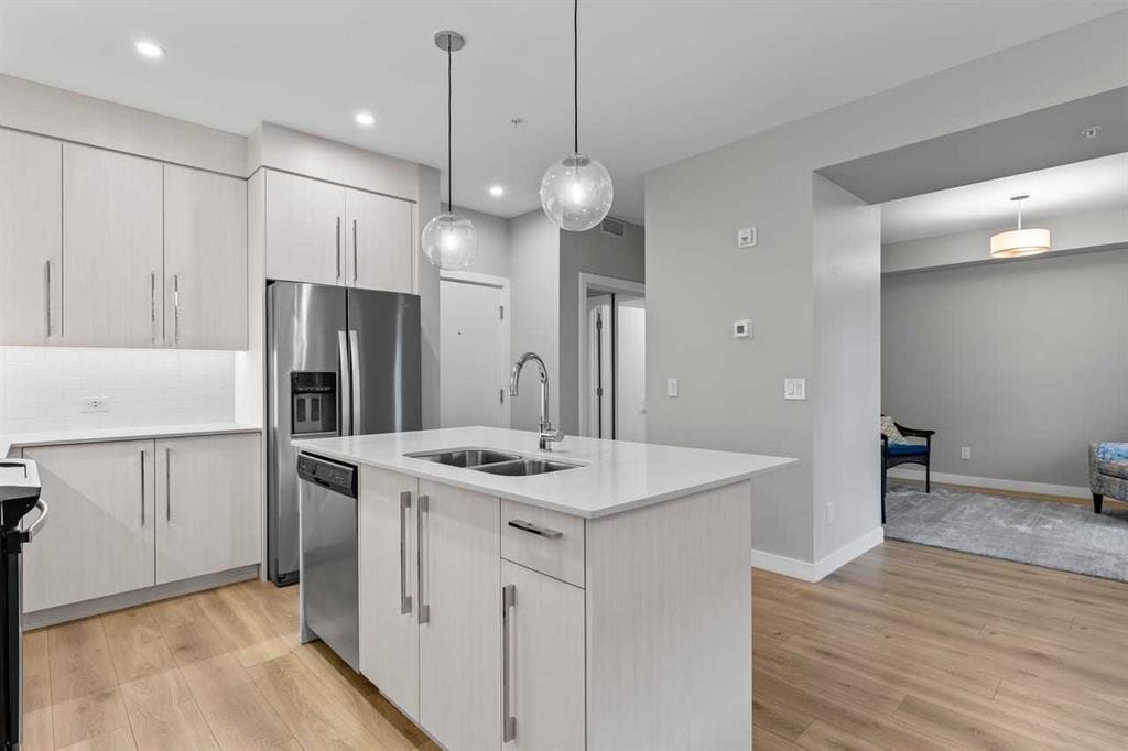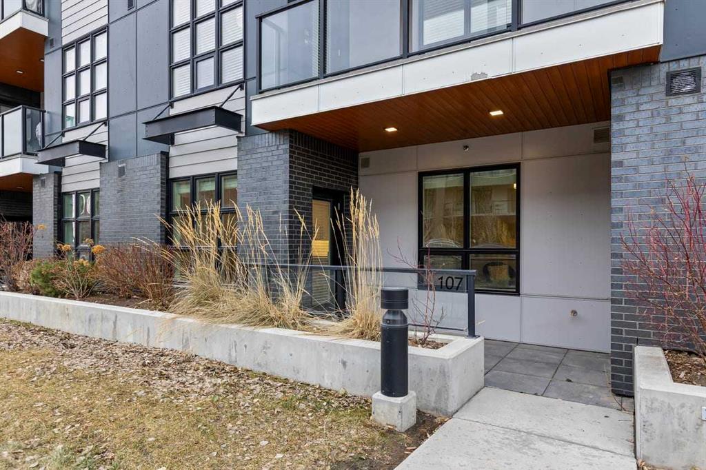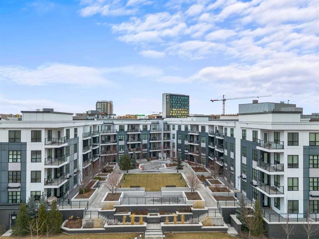 Enjoy maintenance-free living in this spacious one-bedroom condo in the sought-after 55+ Maple building, ideally located in Calgary’s vibrant University District. Built by Truman Homes, Maple offers a secure, social community with luxury finishes, perfect for those ready to simplify life without sacrificing lifestyle. Unit 107 is a convenient main-floor condo with direct access to the covered patio and walking paths; ideal for easy comings and goings or running a quick errand. This 728 sq ft home features an open-concept floorplan with 9-foot ceilings, engineered hardwood flooring, and large triple pane picturesque windows. The modern kitchen includes quartz countertops, stylish cabinetry, a designer backsplash, and stainless steel appliances. The large island is perfect for casual meals or prepping a beautiful dinner at home. The dining area is spacious and also great for hosting family visits or playing cards with the grandchildren. The kitchen and dining area open to the living room, creating a comfortable space to relax at the end of the day. The generously sized bedroom includes a walk-through closet and a spacious 4-piece ensuite. A second full bathroom adds extra convenience for any guests. This unit also includes in-suite laundry and your own titled, heated underground parking stall. The Maple building includes a heated underground parkade, plenty of visitor parking, elevators, and thoughtful “aging in place” features such as wide hallways, accessible entrances, and automated doors. Residents will also enjoy a beautifully landscaped courtyard with inviting seating areas. Living in the University District makes everyday life incredibly convenient. From groceries and banking to coffee dates and evening movies, everything is close by. Save-On-Foods, Staples, Shoppers Drug Mart, Cineplex, COBS Bread, Monogram Coffee, Market Mall, and a variety of cafés, restaurants, and shops along Main Street are all within easy walking distance. With more amenities opening all the time, the University District continues to stand out as one of Calgary’s most vibrant and walkable communities. Next door is Cambridge Manor, a neighbouring residence offering independent and supportive living services. Maple residents are able to access select lifestyle and recreation amenities at Cambridge, including a bistro café, fitness centre, and a variety of fitness classes. A hair salon is also available, along with organized social activities such as coffee club, card games, crib club, drum circles, concerts, movies and documentaries, and special holiday meals. Whether you’re looking for a lock-and-leave lifestyle or a welcoming community to enjoy year-round, Unit 107 at Maple is an outstanding opportunity in one of Calgary’s best urban neighbourhoods.