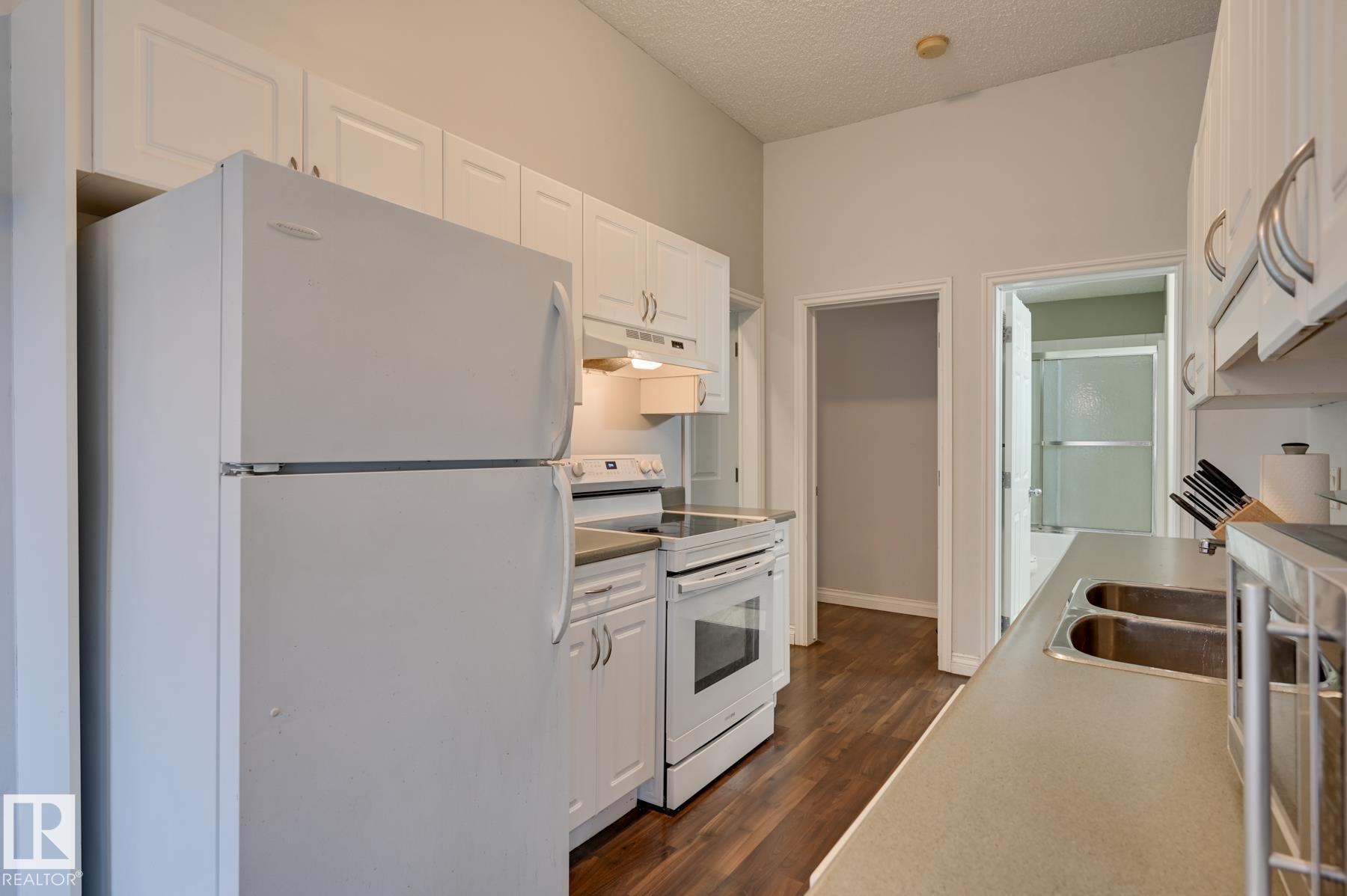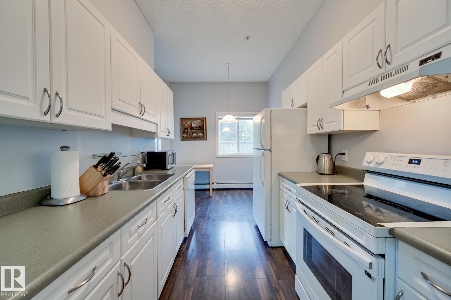 Welcome to this beautifully designed South Edmonton condo offering both comfort and convenience. The unit features 10 foot ceilings, two spacious bedrooms, two full four piece bathrooms, and in suite laundry with storage. The open concept design highlights bright kitchen cabinetry and a corner gas fireplace that creates a warm and inviting atmosphere. A standout feature of this home is the large private yard measuring 3.5 meters by 7.2 meters, complete with a patio, which is an exceptional find in condo living. The home also includes a separate titled underground parking stall for added convenience. Ideally located near schools, shopping, and public transportation, and only ten minutes to the University of Alberta, this well maintained complex in a prime location makes this home a must see. Pets are allowed but they must be registered and approved by the condo board.