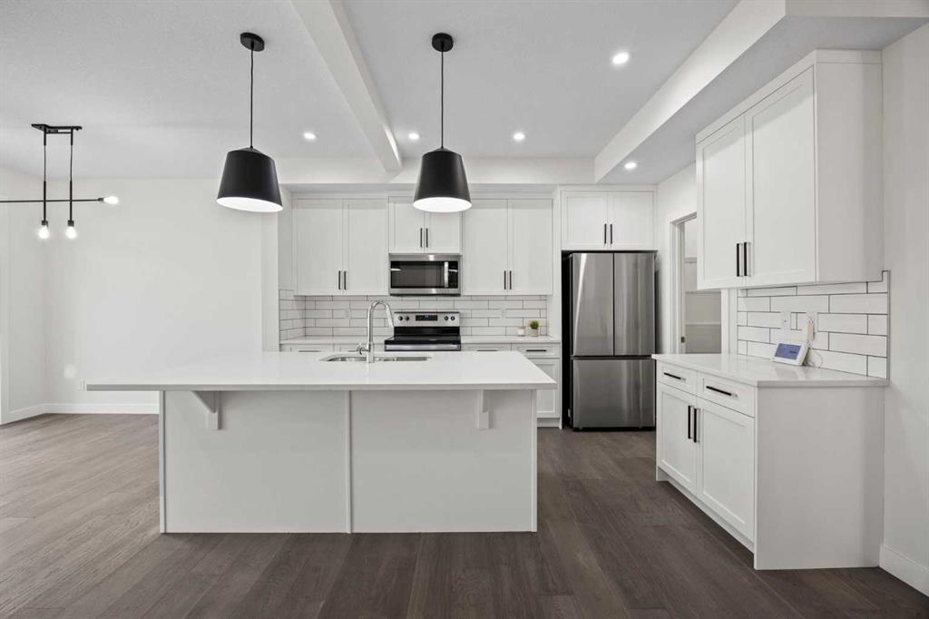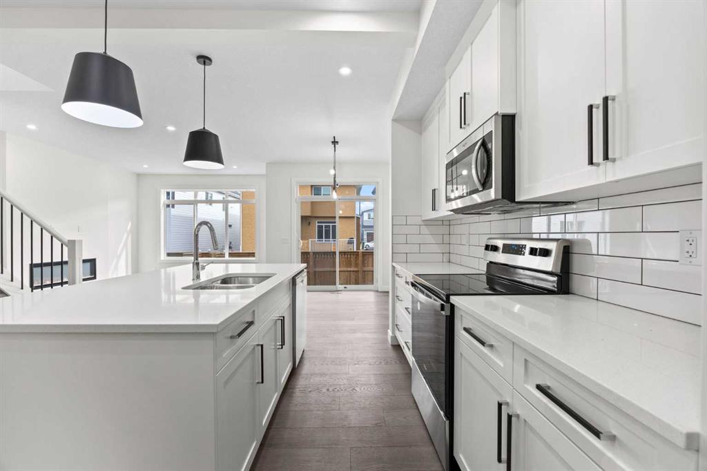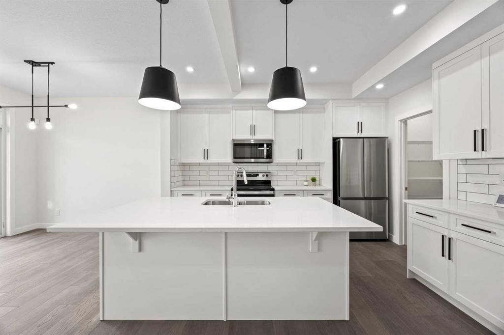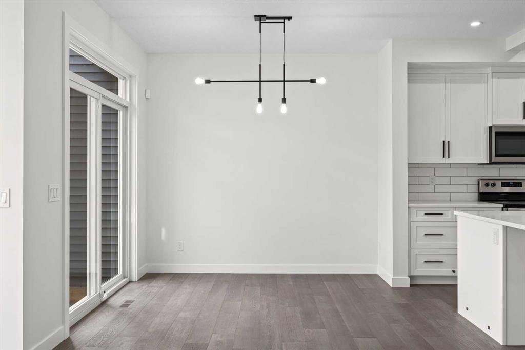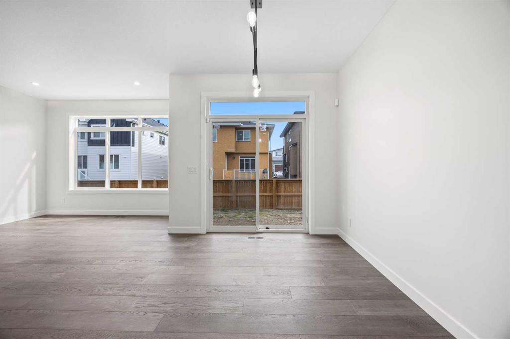 Welcome to this brand new semi-detached home with a front double attached garage, perfectly located in the desirable community of Waterford. Designed with style and functionality in mind, this home boasts numerous upgrades throughout. Step inside to a bright, open foyer leading to the main floor, featuring 9-foot ceilings and beautiful engineered hardwood throughout. The open-concept kitchen showcases quartz countertops, stainless steel appliances, upgraded light fixtures, and painted cabinetry to ceiling height. It flows seamlessly into the spacious living room with an electric fireplace and dining area overlooking the large backyard — ideal for summer BBQs and outdoor entertaining. A convenient 2-piece bathroom completes the main level. Upstairs, the home offers three generously sized bedrooms, each with ample natural light and closet space. The primary suite is a true retreat, featuring a spacious walk-in closet and a luxurious ensuite with dual vanities. The additional bedrooms are perfect for family, guests, or a home office, and share a well-appointed 4-piece bathroom. Completing the upper level is a full-size laundry room for ultimate convenience. The unfinished basement includes a separate side entrance, providing flexibility for a future living space, guest suite, or investment opportunity. Tucked away on a quiet street, this home is just minutes from all the amenities Chestermere offers, including schools, parks, shopping, and the lake