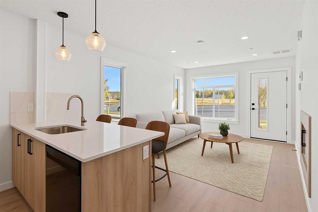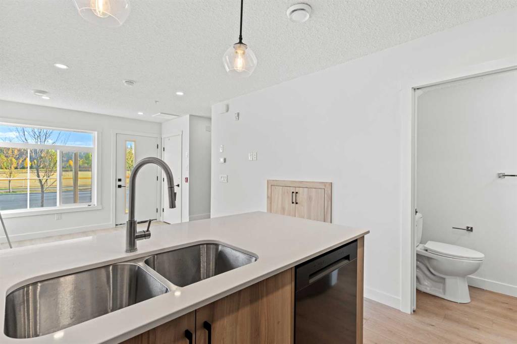 Welcome to a home where contemporary elegance meets every day comfort, coupled with an opportunity for outdoor lifestyle living. This one a kind community is your chance to have quick access to the Rocky Mountains. Stepping into the unit, you will find an open concept floorplan with 9' ceilings throughout all of the living areas, luxury wide plank flooring. Moving into the well designed kitchen, you will find quartz stone countertops with soft close drawers, upgraded stainless steel appliances, as well as an overhanging kitchen island for extra counter space. Continuing further into the unit, you will find 3 bedrooms and 2 bathrooms with contemporary plumbing fixtures, stoned tiled flooring, and quartz countertops. You will also have a titled parking stall. Sit back and relax with your sun filled waterfront views on your private deck and enjoy your evenings walking through the garden pathways and parks nearby. Being in prime location, the Greystone community will be surrounded by various large retailers including one of Canada's flagship Co-op grocery store locations - future of live, work, play in Western Canada's #1 fastest-growing region. Walking distance to Ocgrow's Greystone Place Commercial retail centre - with all of your favourite restaurants, coffee shops and amenities nearby. The Spray Lakes Sports Centre is just minutes away, pickle ball courts across the street, and the accessibility to the Rocky Mountains provides you with a great opportunity for your outdoor adventures. Don't miss out on your chance to be a part of Cochrane's fast paced growth in beautiful community of Greystone.