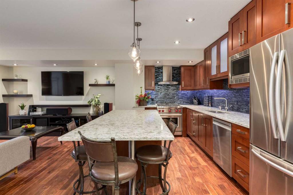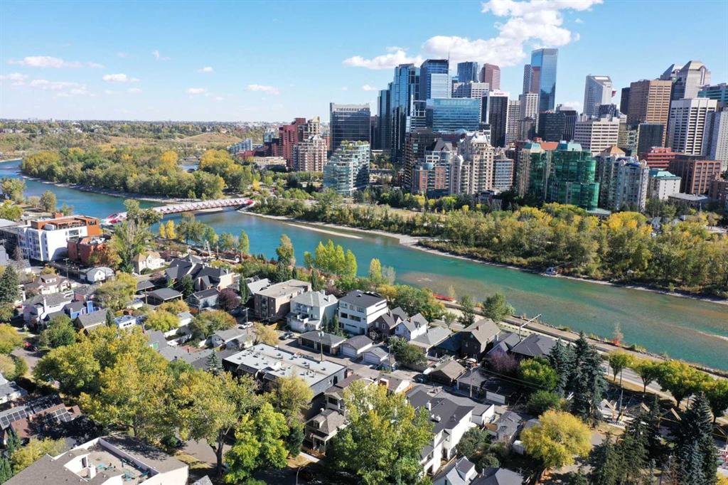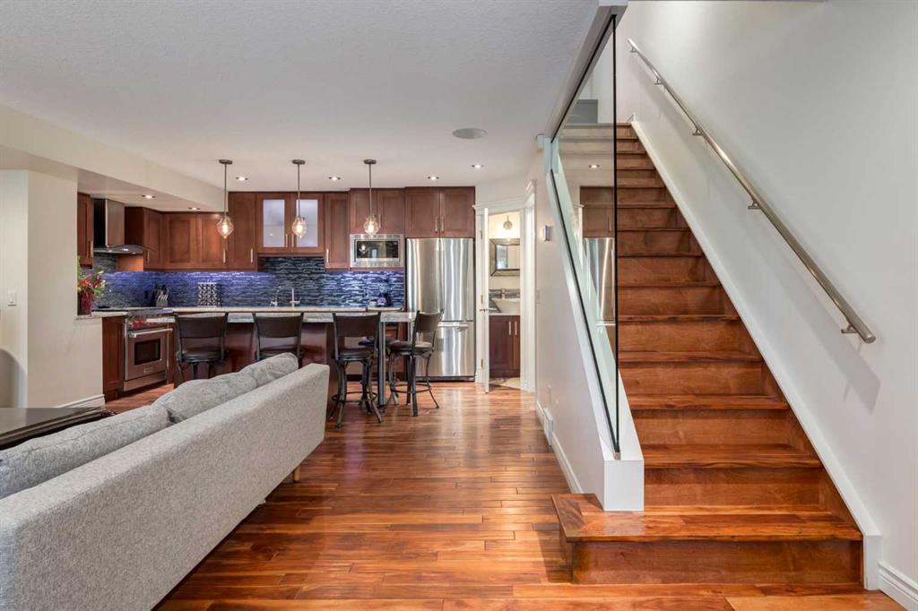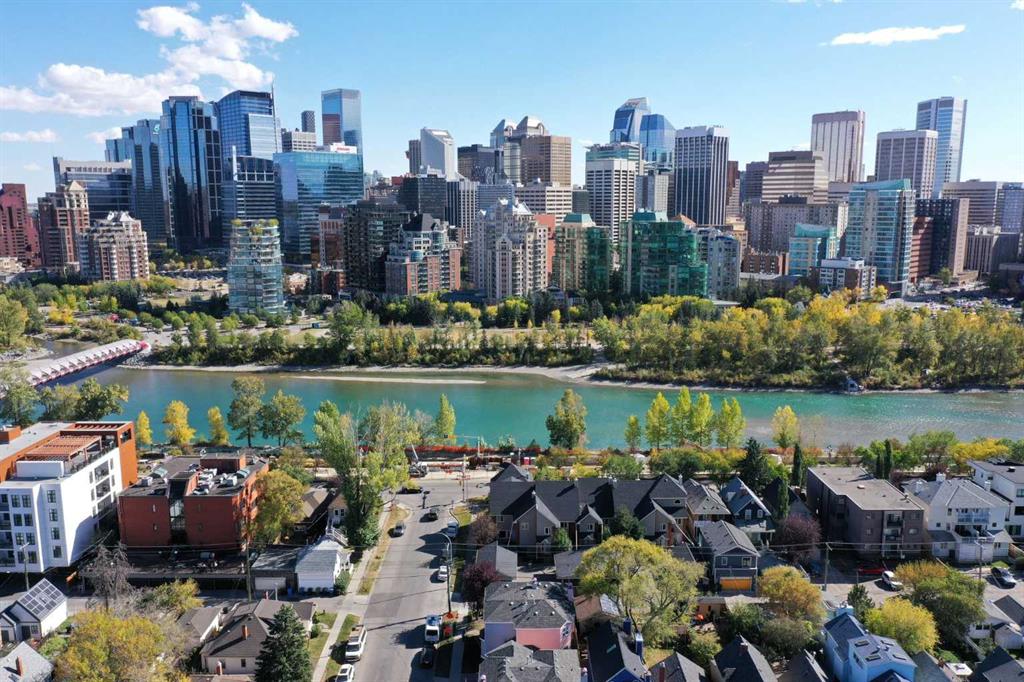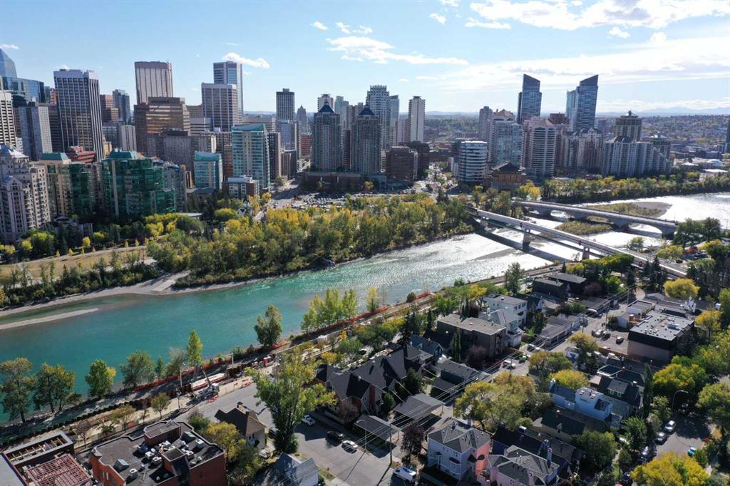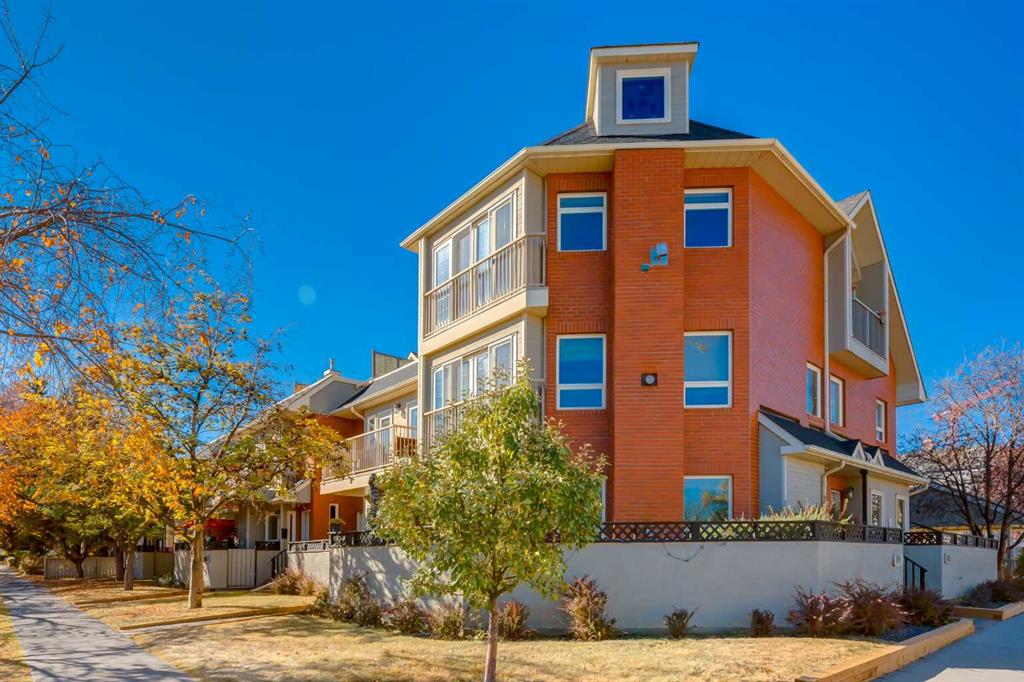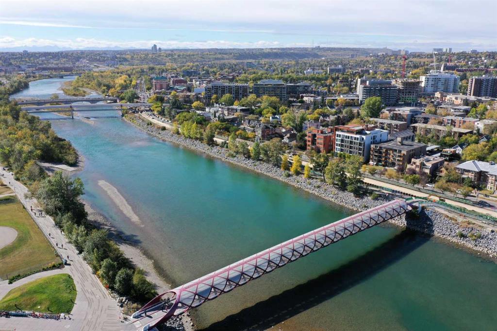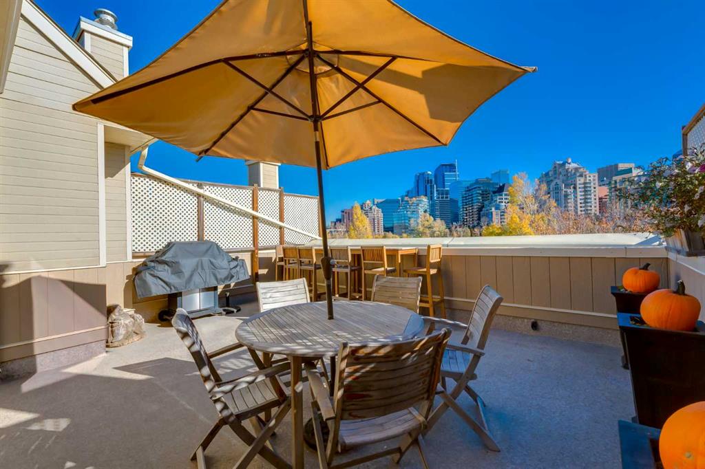 SUNNYSIDE townhome along the BOW RIVER with DOWNTOWN VIEWS. Located in a small enclave of 10 townhomes, this inner city home has had numerous updates over the past 10+ years. With 1948 square feet of living space over four levels, there are 2 bedrooms and 2.5 baths plus an exceptional top floor loft space with vaulted ceilings adjacent to an outstanding 20” x 16” roof top patio. The views of Calgary's city skyline are truly exceptional. The home has newer windows & doors, plus the decking surface has been replaced. The custom kitchen includes Makore cabinetry, large island and stainless appliances, including a Wolf gas stove. There is hardwood flooring on three levels, tile in the foyer and bathrooms, quartz countertops, chrome finish hardware, updated light fixtures, built-in entertainment cabinets in living area, air conditioning, and a two 2-sided gas fireplace with remote control. The lower level is developed, including a four piece bath. The Sierras Riverside in Sunnyside is a one of a kind condominium in a vibrant walkable and bikeable location with restaurants, retail, transit, and the Peace Bridge steps away.
