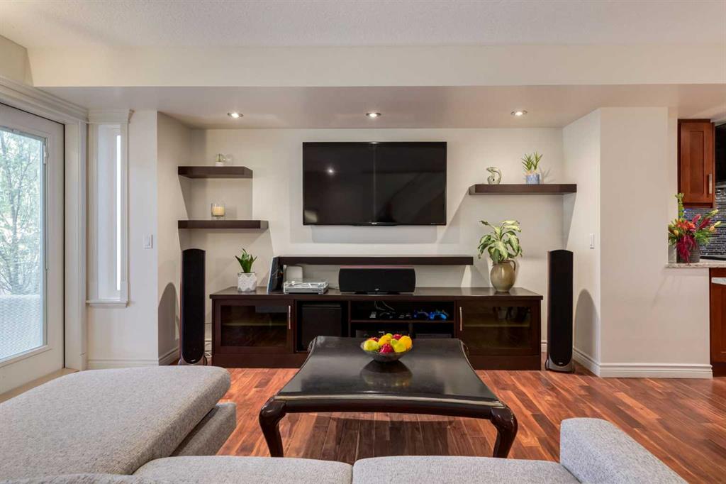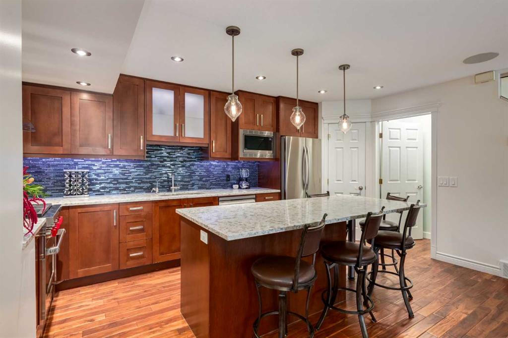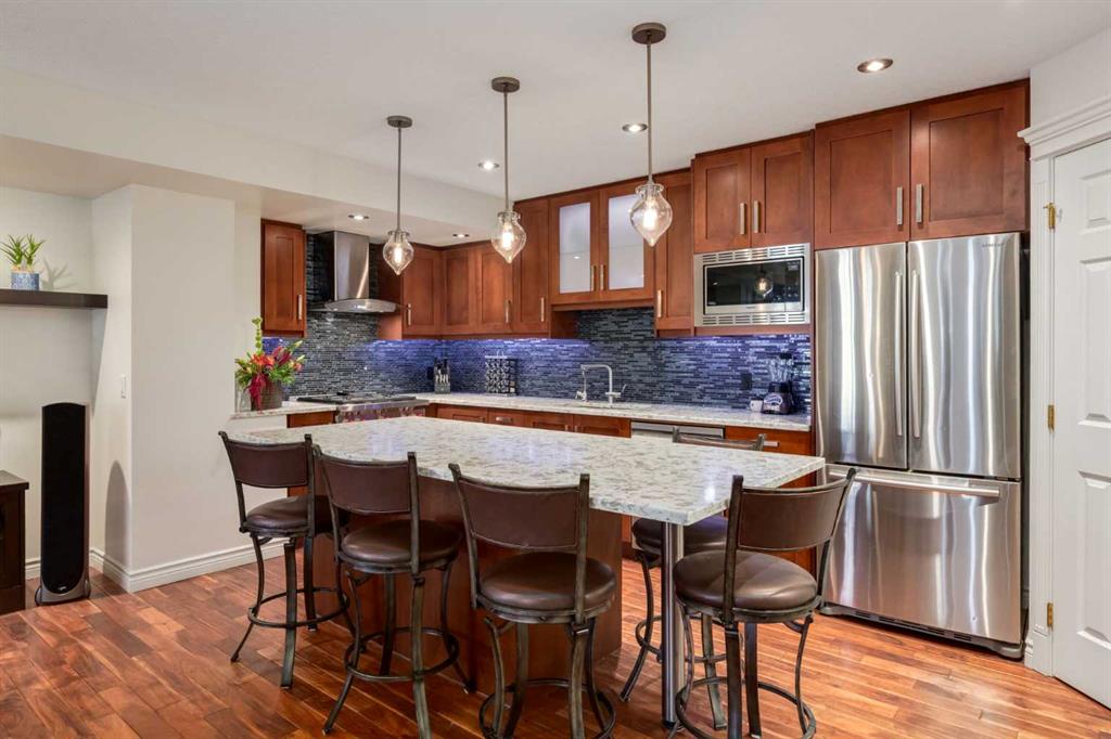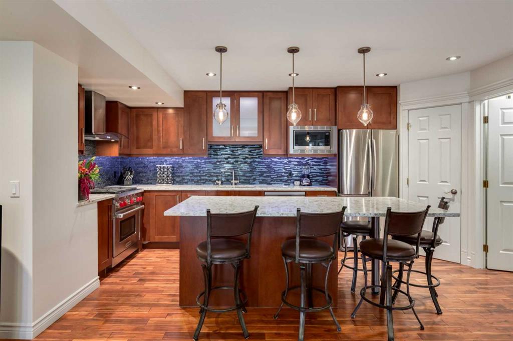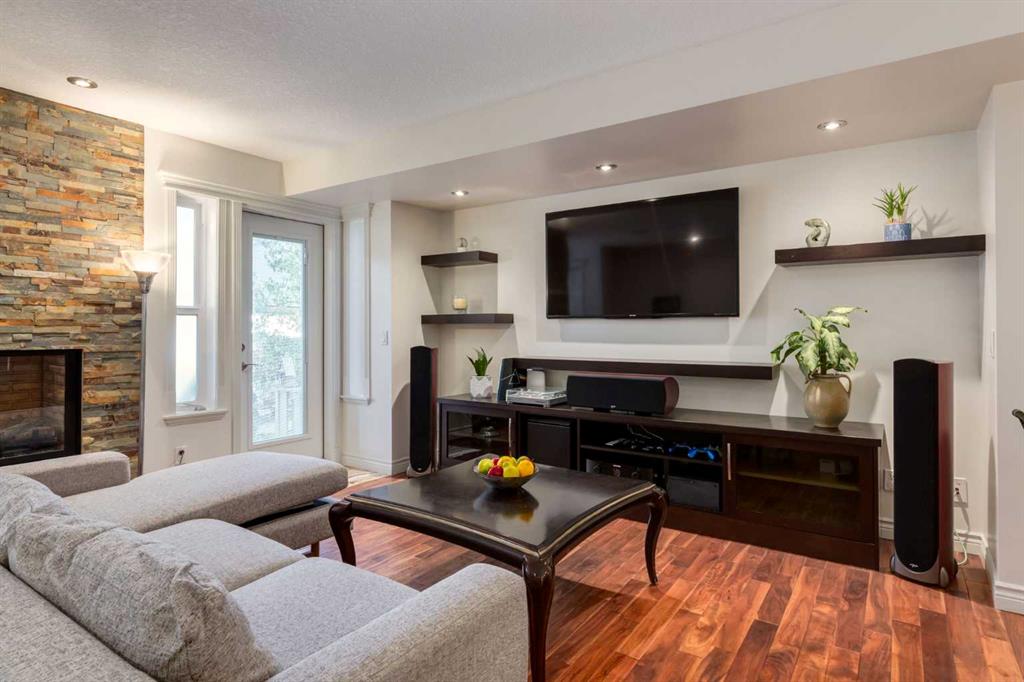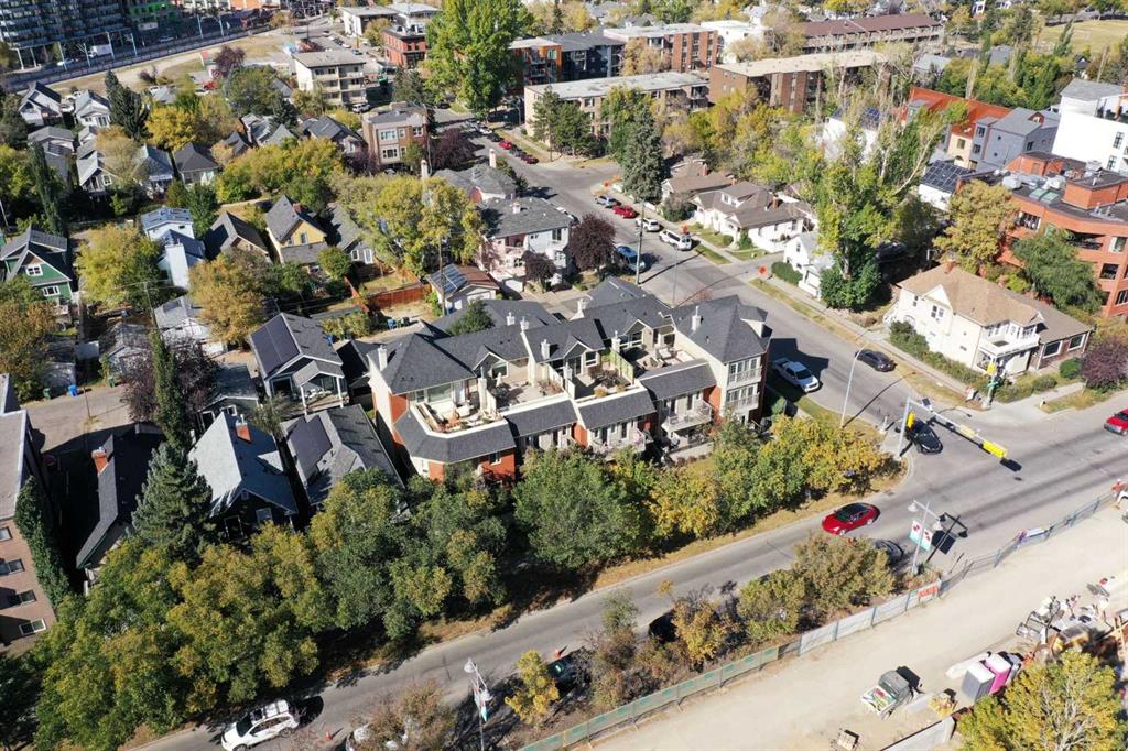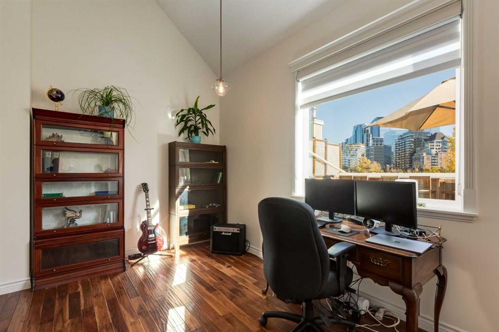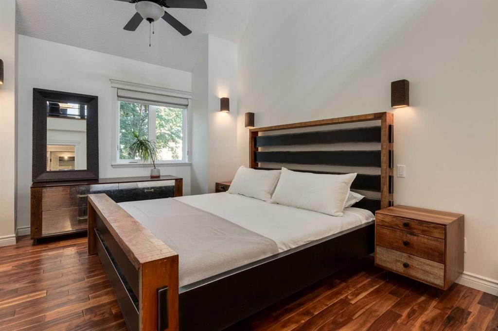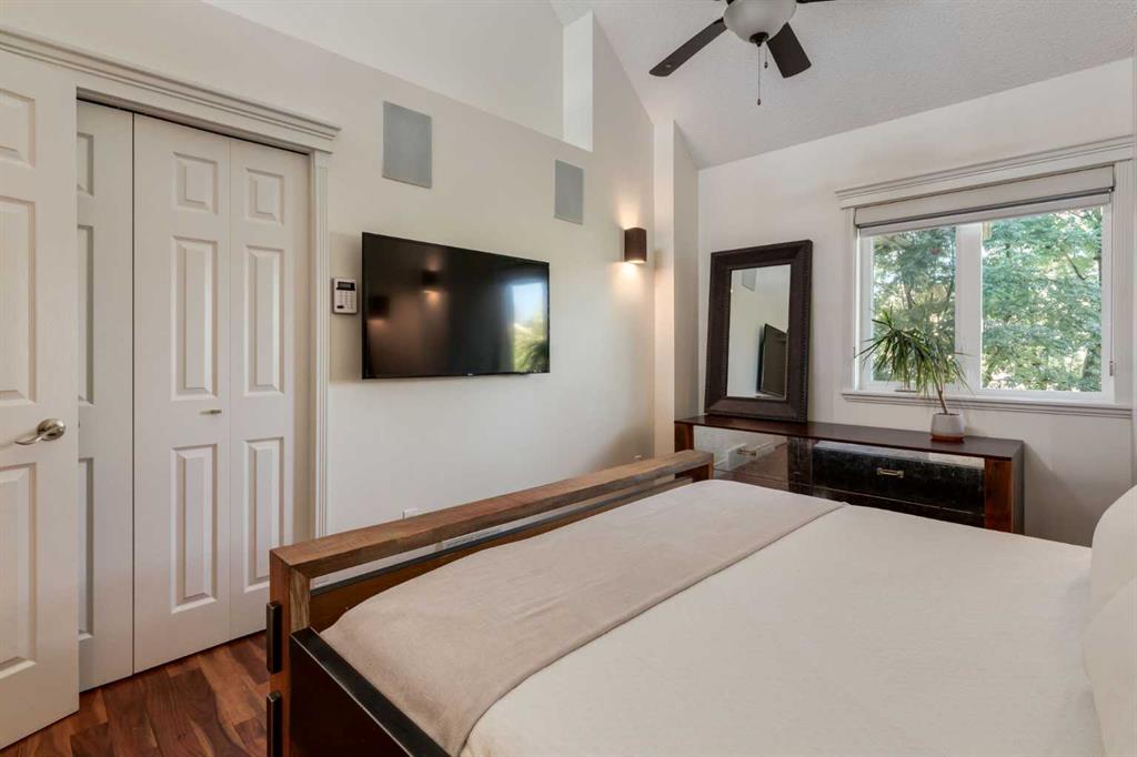 SUNNYSIDE townhome along the BOW RIVER with DOWNTOWN VIEWS. Located in a small enclave of 10 townhomes, this inner city home has had numerous updates over the past 10+ years. With 1948 square feet of living space over four levels, there are 2 bedrooms and 2.5 baths plus an exceptional top floor loft space with vaulted ceilings adjacent to an outstanding 20” x 16” roof top patio. The views of Calgary's city skyline are truly exceptional. The home has newer windows & doors, plus the decking surface has been replaced. The custom kitchen includes Makore cabinetry, large island and stainless appliances, including a Wolf gas stove. There is hardwood flooring on three levels, tile in the foyer and bathrooms, quartz countertops, chrome finish hardware, updated light fixtures, built-in entertainment cabinets in living area, air conditioning, and a two 2-sided gas fireplace with remote control. The lower level is developed, including a four piece bath. The Sierras Riverside in Sunnyside is a one of a kind condominium in a vibrant walkable and bikeable location with restaurants, retail, transit, and the Peace Bridge steps away.