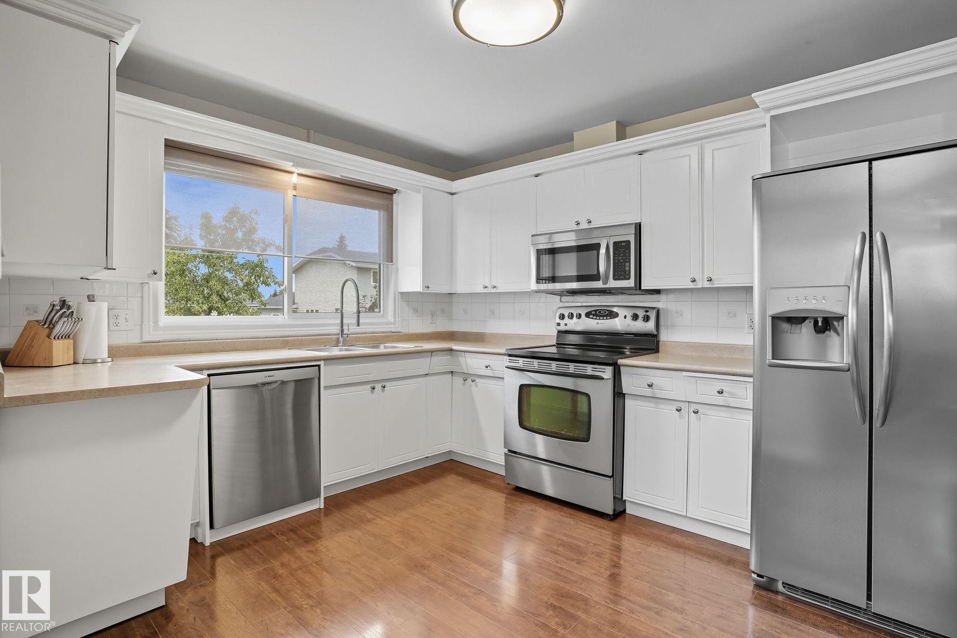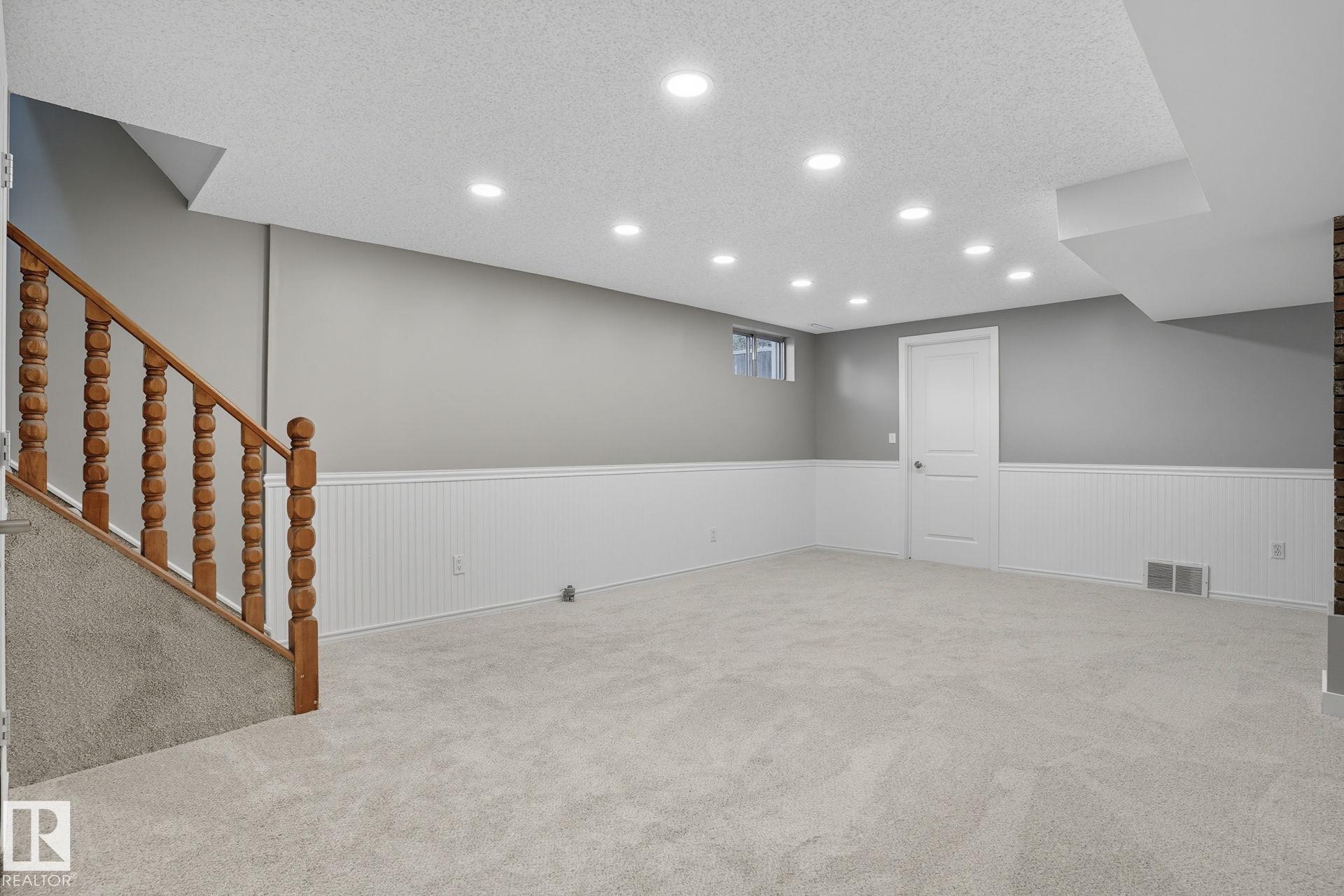 Welcome to this beautifully maintained Castle Downs bungalow, within walking distance to Beaumaris Lake. Enjoy morning walks, evening sunsets, and family bike rides right from your doorstep! This 4-bed, 2.5-bath home features vaulted ceilings, a cozy fireplace, and an open-concept main floor perfect for entertaining. The bright kitchen with eating bar flows to a sunny yard, while three spacious bedrooms — including a primary with 2-pc ensuite — and a 4-piece main bath complete the main level. Downstairs offers a fully finished basement with large rec room, fireplace, 4th bedroom, and 3-pc bath, plus a separate entrance ideal for a future income suite or in-law setup. Major updates include windows (2015), roof (2016), furnace, A/C, hot water tank, and heated garage (2017), and bathrooms (2016). Freshly painted within the past year. Close to schools, parks, transit, and the Anthony Henday — this is lakeside living at its best!