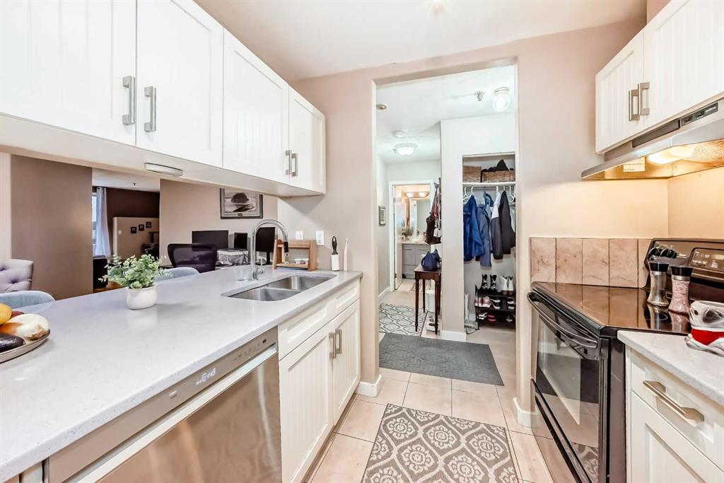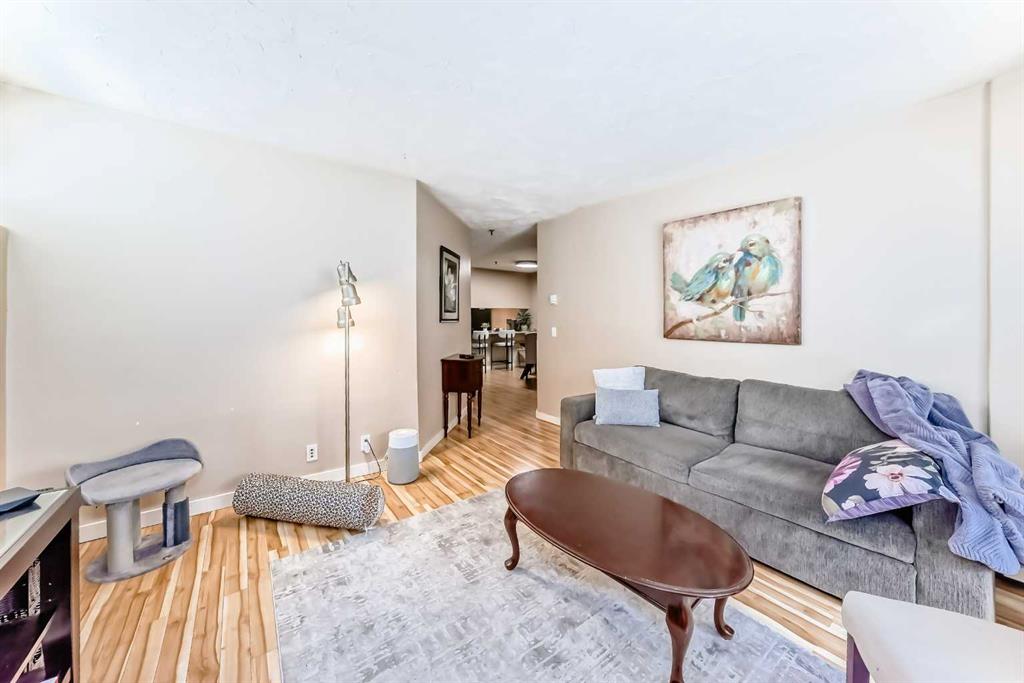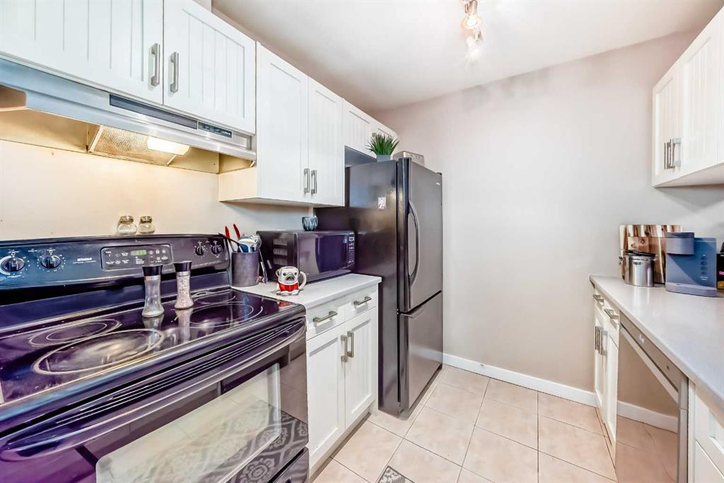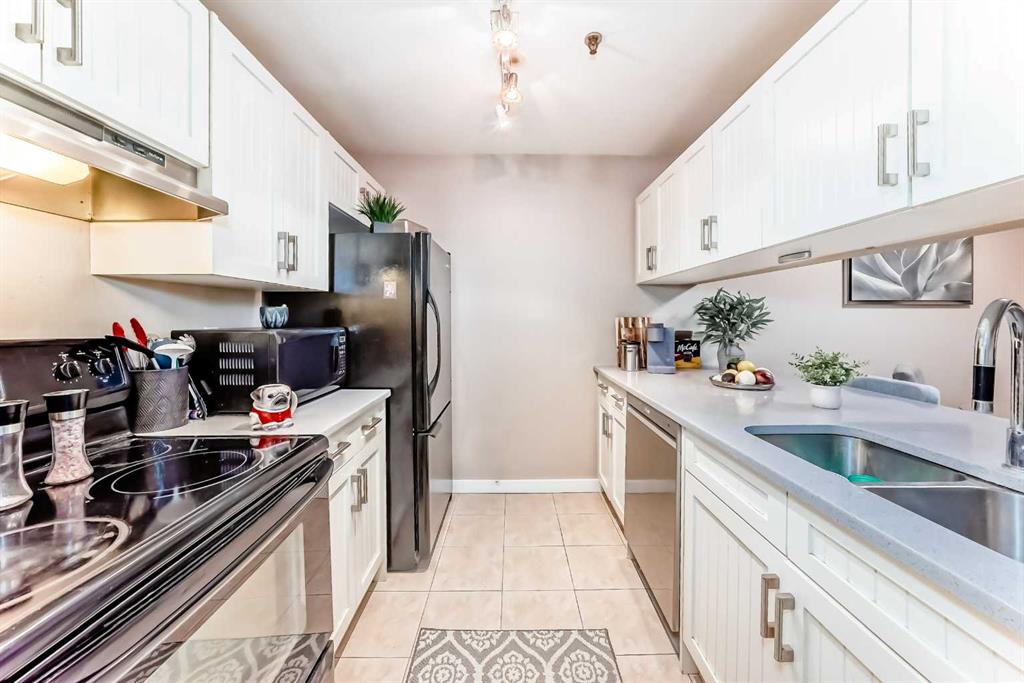Ideally situated just minutes from Chinook Centre, the Calgary C-Train, and downtown Calgary, this home offers unbeatable convenience. Enjoy easy access to Glenmore Trail, Deerfoot Trail, and Crowchild Trail, with a wide variety of amenities, shopping, and dining along Macleod Trail just moments away. This well-maintained unit features several thoughtful updates. The kitchen offers newer cabinetry, a black fridge and stove, and a newer stainless steel dishwasher. A convenient peekaboo island with an eating bar opens to the spacious living room, creating a more open concept. Flooring has been updated with ceramic tile in the kitchen and bathroom, along with newer laminate throughout the main living areas. The bright living room is finished in tasteful neutral tones and opens through sliding patio doors to a generously sized, south-facing private patio—perfect for relaxing or entertaining, with ample space for BBQs and outdoor furniture. The bedroom is well-proportioned and includes plenty of closet space. A partially renovated four-piece bathroom features a newer vanity and toilet. Additionally the building offers a clean well-maintained common laundry on the main level as well as access to the clubhouse with a cozy fireplace and space for gatherings. There is also an extra storage unit (E6) located on the main level and an assigned underground parking for added convenience. Whether you’re a first-time buyer or investor, this is an excellent opportunity. A current tenant is in place and would be happy to stay; however, notice has been given, and the unit can be vacant as of August 1, 2026.