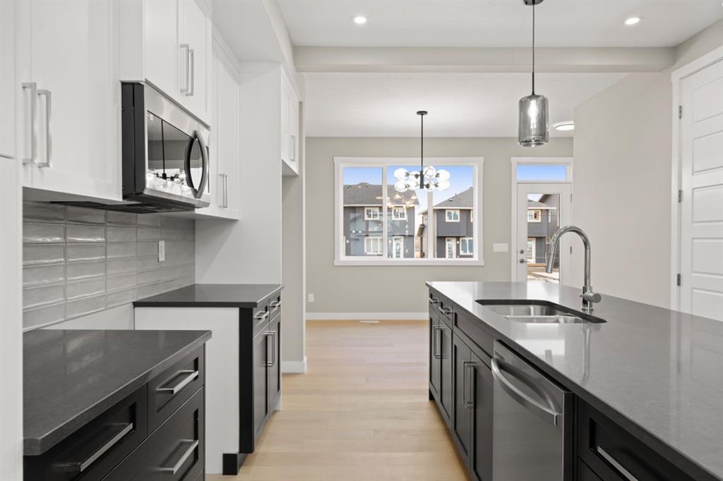 Welcome to 110 Sora Gardens! This kitchen is a standout: modern quartz countertops, stainless appliances, plus a generous island that works for meal prep, homework, or hosting friends-all while staying connected to the rest of the main floor through the open plan. Engineered hardwood on the main level adds durability and an upscale feel that stands the test of time. On the upper level, the primary suite provides a private retreat with ensuite and walk-in closet. Two additional bedrooms offer flexibility-space for kids, guests, or a home office. Upper-floor laundry makes daily routines easier. A separate side entrance to the basement provides future flexibility for expanded living space or potential for suite (subject to city approval). With no condo fees, the peace of mind that comes with a new-home warranty, and thoughtful features throughout, this home is built to give strong long-term value and low maintenance. Situated with easy access to Deerfoot and Stoney Trail, commuting is simplified. Nestled steps from the wetlands, walking paths, and green space, this home delivers a lifestyle that balances nature, convenience, and investment potential. *** The First-Time Home Buyers' GST Rebate could save you up to $50,000 on a new home! You must be 18+, a Canadian citizen or permanent resident, and haven't owned or lived in a home you or your spouse/common-law partner owned in the last four years. Terms and conditions are subject to the Government of Canada/CRA rules and guidelines.***