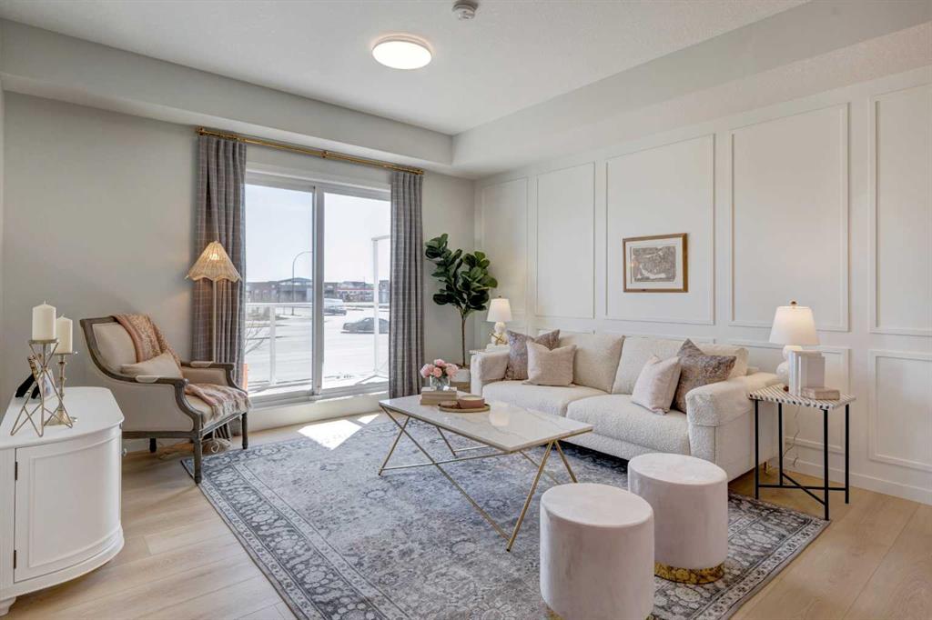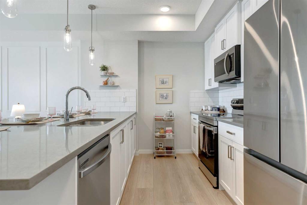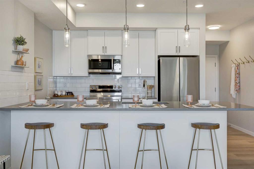 **Please contact the listing agent for information regarding available units and current inclusions - estimated completion JUNE 2026-DEC 2026*** PHOTOS ARE OF FORMER SHOW SUITE - ACTUAL UNIT FINISHES WILL VARY. Welcome to ALPINE PARK PLACE, a brand-new development by CEDARGLEN LIVING, 6x Customer Insight Builder of Choice Award winner. This “A” floor plan offers 514.21 sq. ft. RMS (565 sq. ft. builder size) with 1 bed + 1 bath, and a bright open-concept layout with 9’ ceilings and LVP flooring throughout common areas, carpet in the bedroom and closets (option to upgrade to LVP). The modern kitchen features quartz countertops, an island, stainless steel appliances, undermount sink, upgraded pot drawers and pantry, flowing into the spacious living and dining area—ideal for entertaining. The primary bedroom includes a walkin closet, and 4pc ensuite with full height tile. Additional highlights include Low-E triple-glazed windows, ERV fresh air system, A/C rough-in, BBQ gas line, in-suite laundry, sound-reducing membrane, glass patio railing, and 1 titled underground parking stall. A once in a lifetime community in Southwest Calgary. Pet and rental friendly complex.