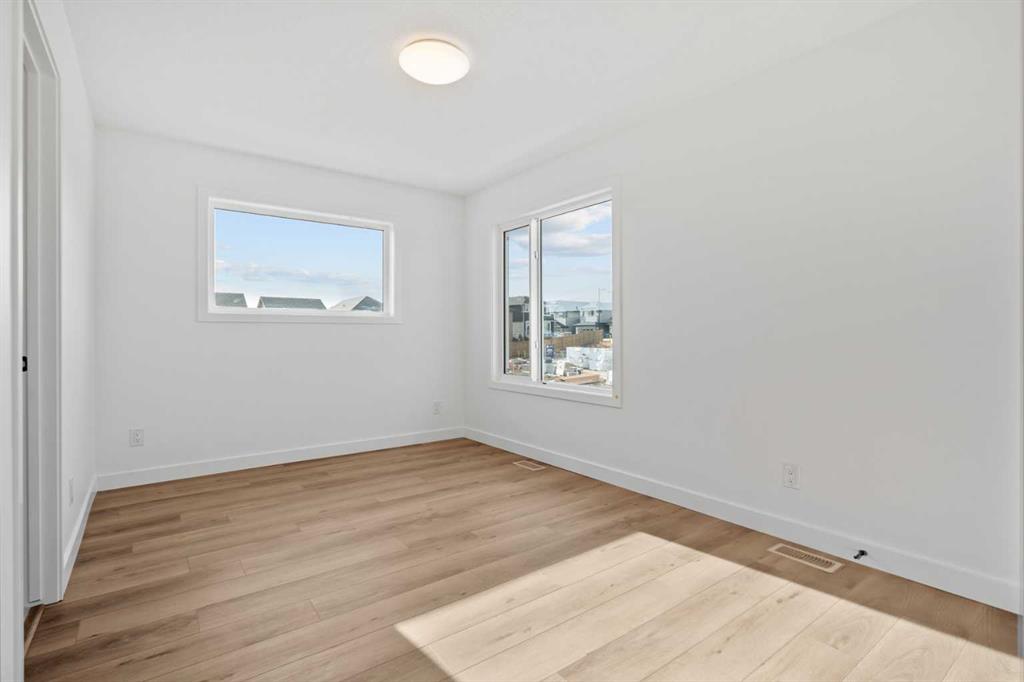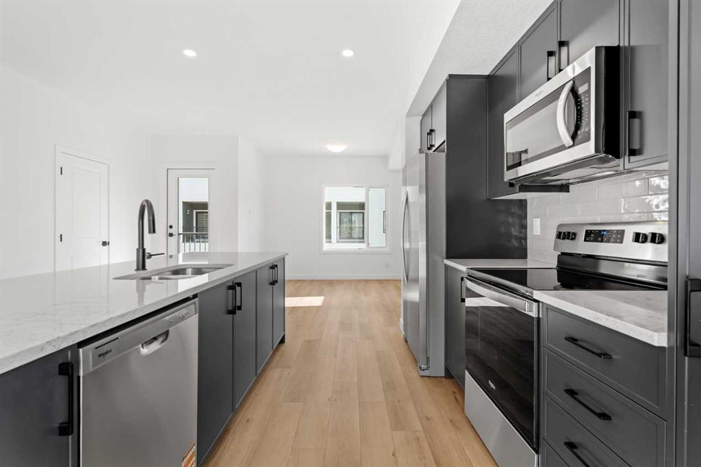 NEW BUILD TOWNHOME | LOW CONDO FEES | 4 BED (3 UP, 1 DOWN) / 2.5 BATH / 1,327 SQ FT | ATTACHED GARAGE + DRIVEWAY | IMMEDIATE POSSESSION – Welcome to the Spruce 1 townhome by Minto Communities, an award-winning Canadian builder, located in Wildflower, proudly voted Best New Community in Canada. This vibrant, master-planned community in Airdrie is designed with lifestyle and connection in mind, offering a thoughtful mix of home styles in a neighbourhood built to grow with you. This brand-new townhome offers a spacious and functional layout ideal for families, professionals, or anyone looking for extra flexibility. The main floor features a modern kitchen positioned at the centre of the home, complete with a large island, stainless steel appliances, contemporary finishes, ample cabinetry, and storage. The dining area is located at the front of the home just off the foyer, creating an inviting space for everyday meals or entertaining. Toward the back of the home, the living room provides a comfortable retreat with direct access to a private balcony, perfect for enjoying fresh air. A convenient 2-piece bathroom completes this level. Upstairs, the primary bedroom offers a walk-in closet and private 3-piece ensuite. Two additional bedrooms, a full 4-piece bathroom, and discreet upper-floor laundry complete the upper level, providing excellent functionality for growing households or home office needs. The lower level features a fourth bedroom and direct access to the oversized single attached garage, offering versatility for guests, a home gym, or workspace. A full driveway provides additional parking, adding everyday convenience rarely found in townhome living. Residents of Wildflower enjoy exclusive access to The Hillside Hub, a standout amenity centre featuring Airdrie’s first outdoor pool, a hot tub, open-air sports court, and a variety of shared indoor and outdoor spaces designed for gathering, recreation, or quiet retreat. With nearby parks, pathways, amenities, and easy access to major routes, Wildflower delivers a truly well-rounded lifestyle. Combining award-winning community planning, modern design, low condo fees, and immediate possession, this is an outstanding opportunity to own a stylish new build townhome in one of Canada’s most celebrated communities. Don’t miss your chance to make Wildflower home! Book your visit today!