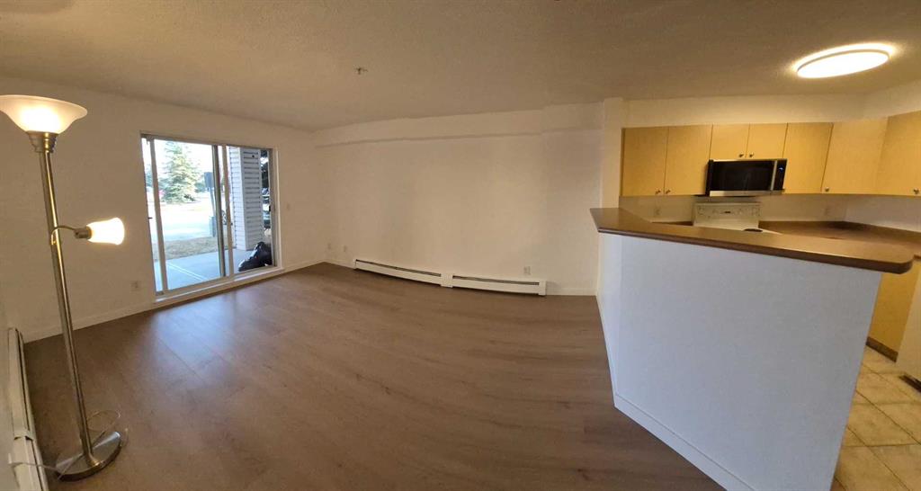 Welcome home to your easily accessible ground level, 2 bedroom 1 bath condo that includes in suite laundry. With urgent care across the street, numerous dining and shopping right next door, and many schools (catholic K-9 and public K-12) walking distance, driving becomes optional. This is a beautiful spacious east facing unit that brings in the morning sun. Freshly painted makes it a blank canvas for you to add your personal touch. Newly installed 8mm luxury vinyl plank flooring makes easy to clean and maintain, along with an amazing feel on your feet. We invite you to come see for yourself and experience a condo to call home in a great building full of community and great neighbors. Right next to main entrance and handy cap parking just off the patio. Unit has sprinklers and a main floor patio.