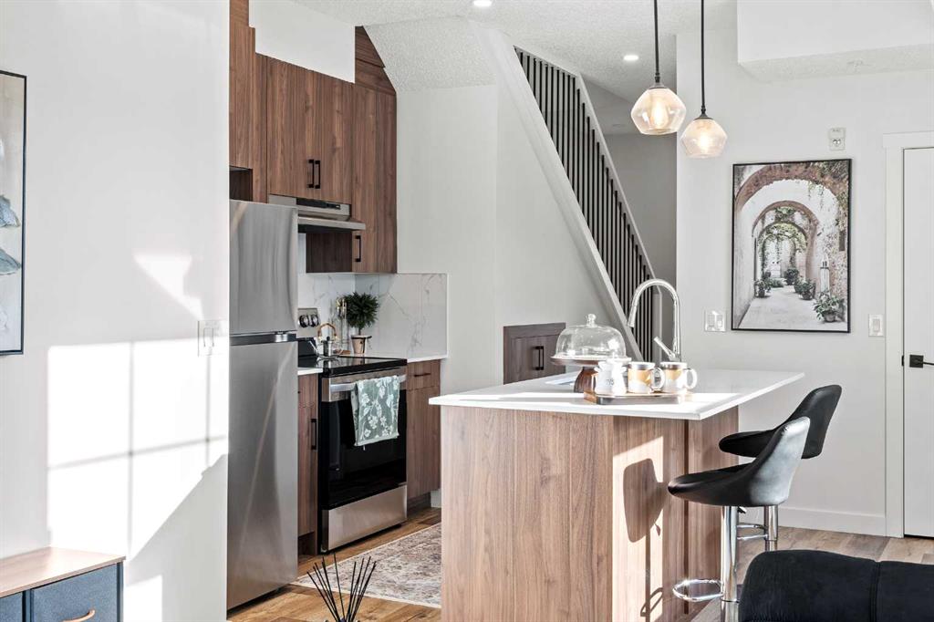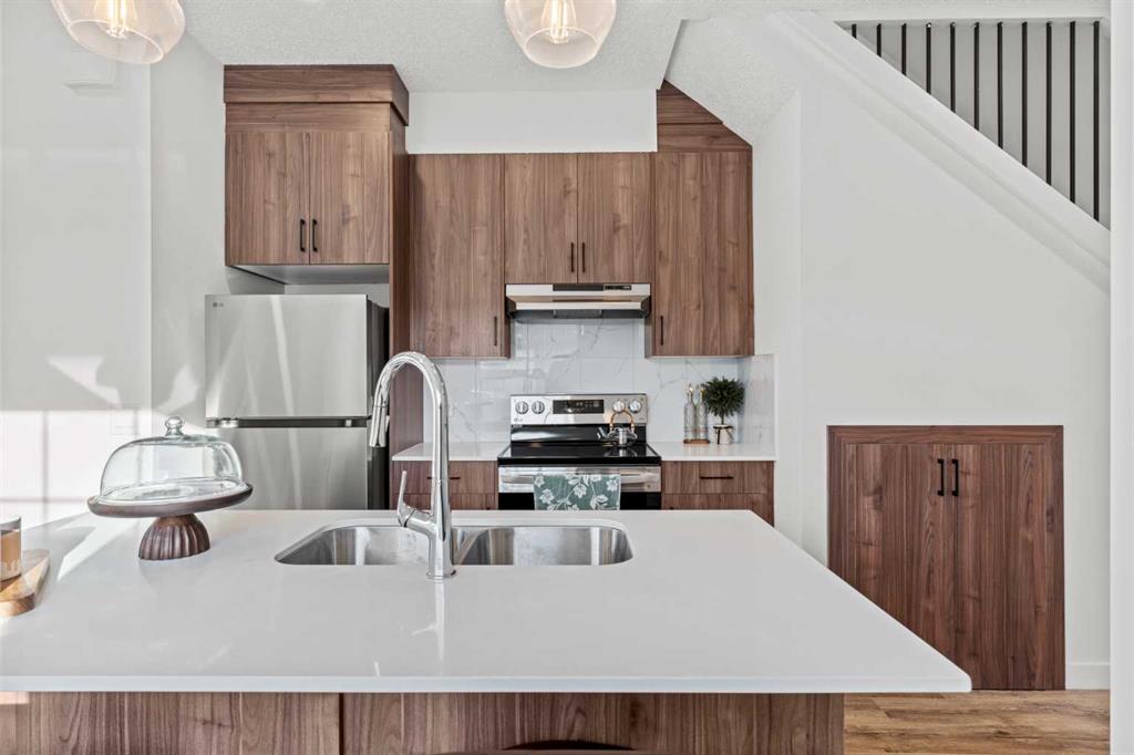 Discover the perfect balance of modern elegance and relaxed living in this stunning home, thoughtfully designed for comfort, connection, and outdoor enjoyment. Located in one of Cochrane’s most desirable new communities, this property offers a rare chance with quick access to the Rocky Mountains and all the amenities of the growing Greystone development. Step inside and you’ll be welcomed by a bright, open-concept layout featuring 9-foot ceilings and luxury wide-plank flooring throughout. The gourmet kitchen is beautifully equipped with quartz countertops, soft-close cabinetry, premium stainless steel appliances, and a spacious island perfect for casual dining or entertaining. The home features three bedrooms and two full bathrooms, each designed with modern fixtures, stone tile floors, and matching quartz vanities. Your convenience continues with a single attached garage and an additional parking pad, providing plenty of room for family and guests. Enjoy peaceful mornings on your private deck overlooking the water, or take advantage of the brand-new pickleball courts just across the street. Meandering garden pathways, green spaces, and local parks make it easy to unwind outdoors and stay active year-round. Perfectly situated within walking distance to Ocgrow’s Greystone Place Retail Centre, you’ll have access to restaurants, cafés, shops, and the upcoming flagship Co-op grocery store — everything you need right at your doorstep. Plus, with Spray Lakes Sports Centre minutes away and the Rockies within reach, adventure and leisure are always nearby. Be part of Cochrane’s fastest-growing community and experience a lifestyle where modern design meets natural beauty — live, work, and play - welcome home to Greystone.