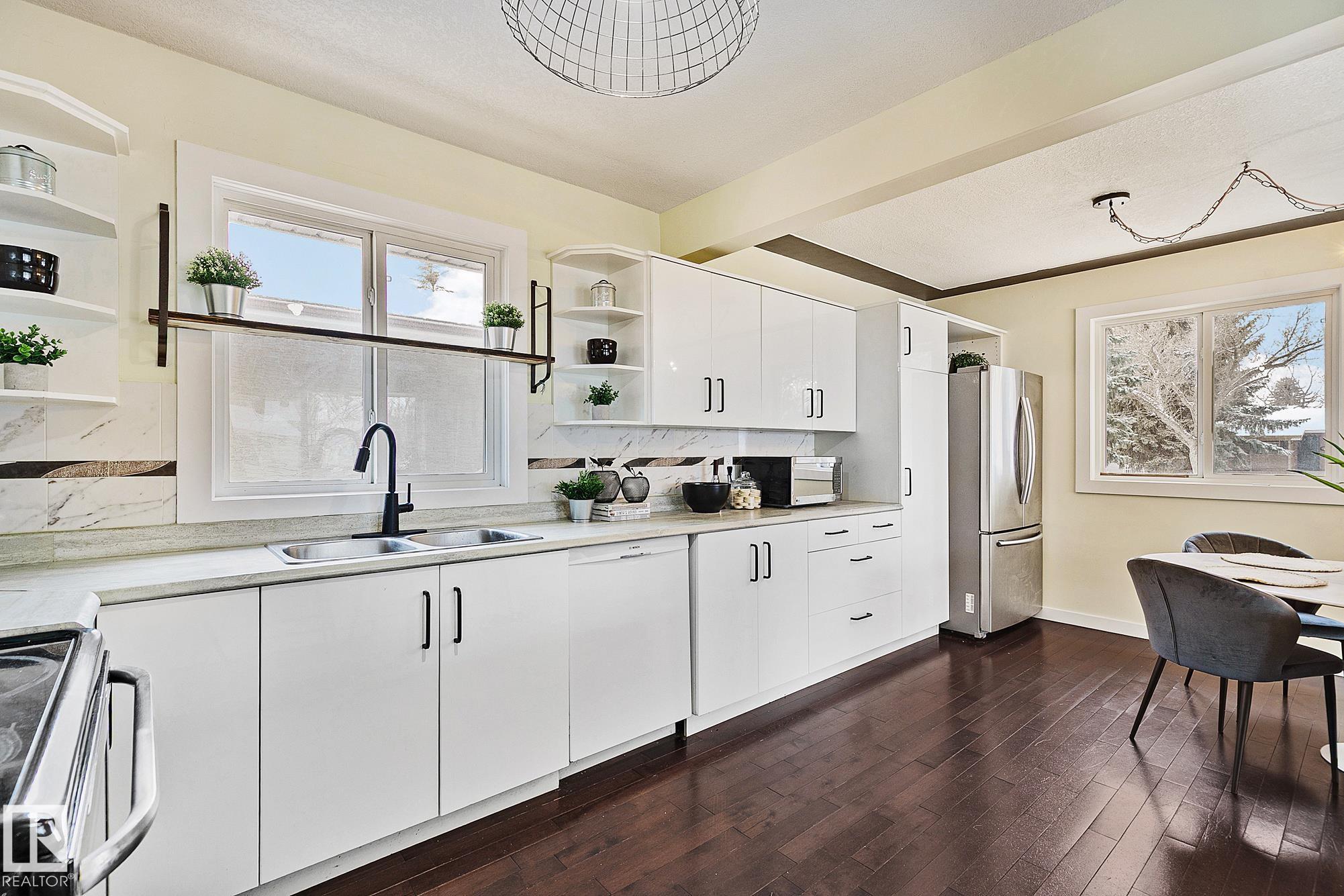Welcome home to this gloriously upgraded bungalow in the historic Highlands! This well maintained home features numerous updates over the last 10-15 years including furnace, sewer line, A/C, fence, deck, pergola, fascia, soffits &added insulation between levels. An open concept kitchen flows into bright ovrszd spaces with streetscape views framed by custom walnut built-ins & a quiet window seat. Great for entertaining. 3 beds & a full bath complete this main level. The fully developed bsmnt offers 3 additional bdrms, full bath, storage, perfectly placed laundry area & still boasts a functional rec space! Ideal for growing families with added long term flexibility on a versatile corner lot. Situated on a mature tree-lined street 3 blocks to the river valley & near Highlands golf course, Concordia, Bodega, Kind Ice Cream & a quick commute to dwntwn. A single detached garage, abundance of backyard fruit trees & private pergola space completes the package! (Fridge in the bsmnt & entertainment unit are incld)!