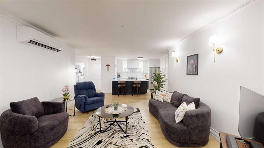 *** OPEN HOUSE - SATURDAY, MAY 2nd, 2 to 4 pm ***10k PRICE REDUCTION*** Welcome to a contemporary, modern and newly renovated EXECUTIVE ORNATE condo located in the sought after and desirable Eau Claire neighborhood. This spacious ground-floor unit offers an exceptional blend of ultra modern convenience and urban lifestyle, right in the center of Calgary’s energetic downtown. Inside you will find an open-concept living space filled with an abundance of south facing natural light, accompanied by high ceilings and large windows. The well-appointed kitchen features sleek white custom kitchen cabinetry, quartz countertops and custom backsplash, newer stainless-steel appliances, and a scintillating receptive island, excellent for casual dining and entertaining. This unit includes a spacious primary bedroom with ample closet space and a stylish bathroom featuring ultra modern fixtures. Additional highlights include newer plumbing, and upscale lighting. Smooth ceilings, crown molding, new custom high-end shutters and a newer air conditioning unit. Pipe drawer vanities with an updated fireplace surround with mantle, newer stacked LG washer and dryer, and updated closet interiors. Charming character trim work, in-suite laundry, ample storage, and secure underground titled parking with storage. This building offers amenities such as a party room, visitor parking and secured underground parking. Located only steps away from the Bow River pathways, Prince’s Island Park, fine dining, shopping, and entertainment. This property is perfect for those who want to enjoy everything downtown Calgary has to offer. Whether you’re a young professional, downsizer, EXECUTIVE or investor, this condo offers a prime location with a blend of convenience and luxury. It also provides an excellent balance between work and lifestyle. The property’s central location has quick access to major roadways, allowing seamless connectivity across the city. This is a beautifully, fully updated, and very stylish EXECUTIVE unit for the inner-city lifestyle!