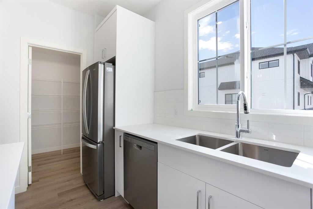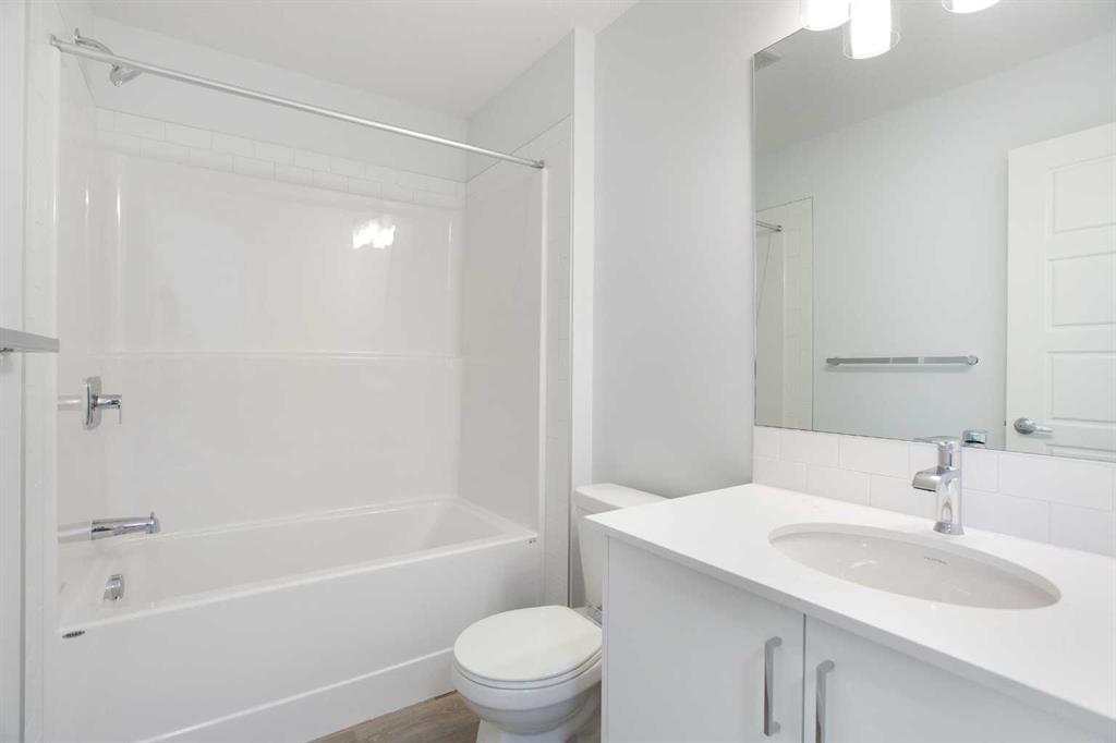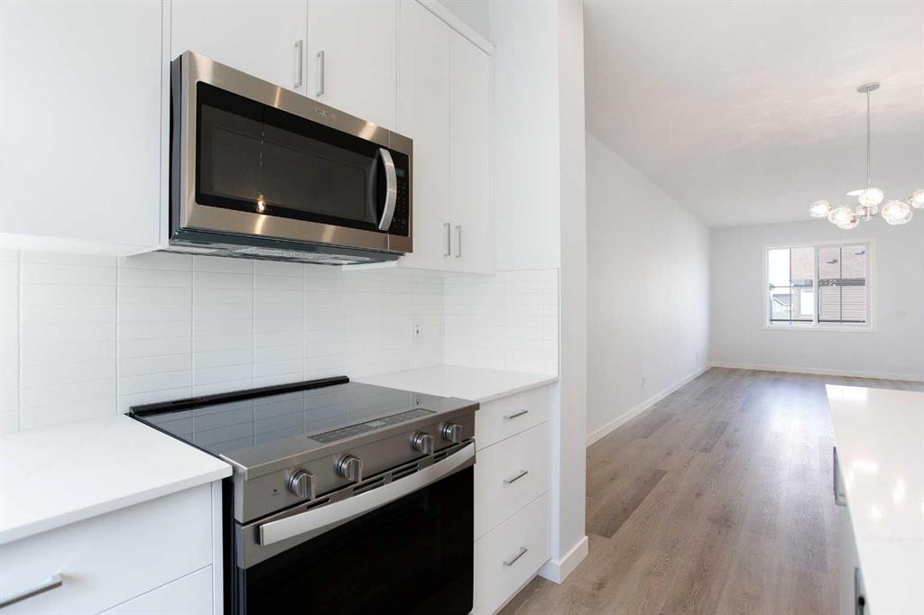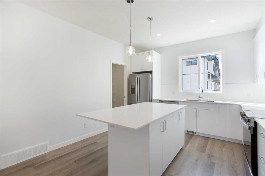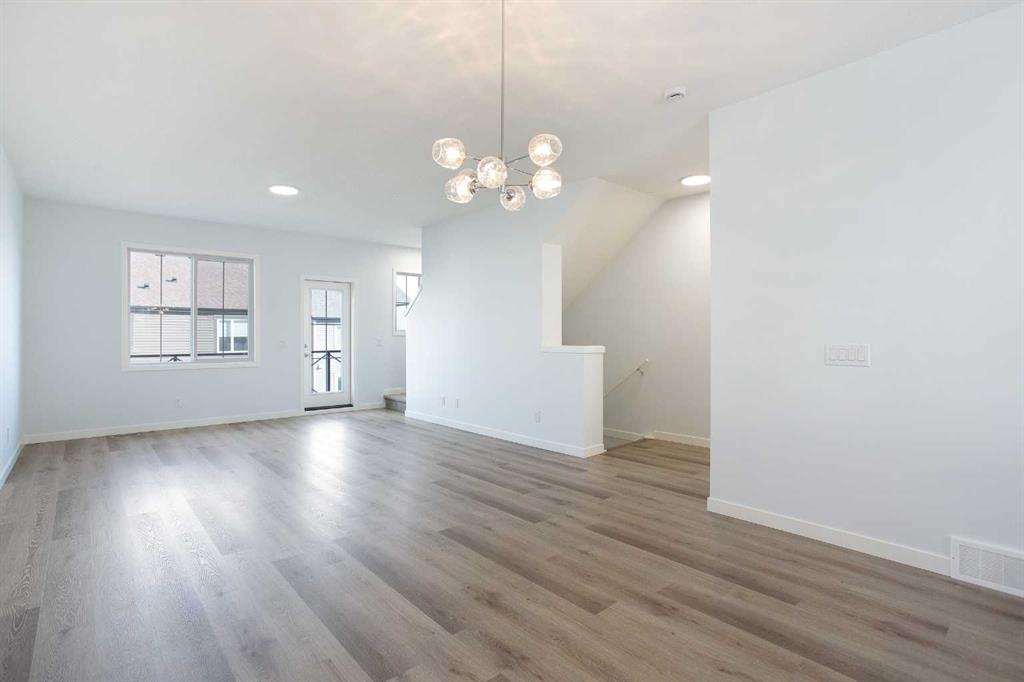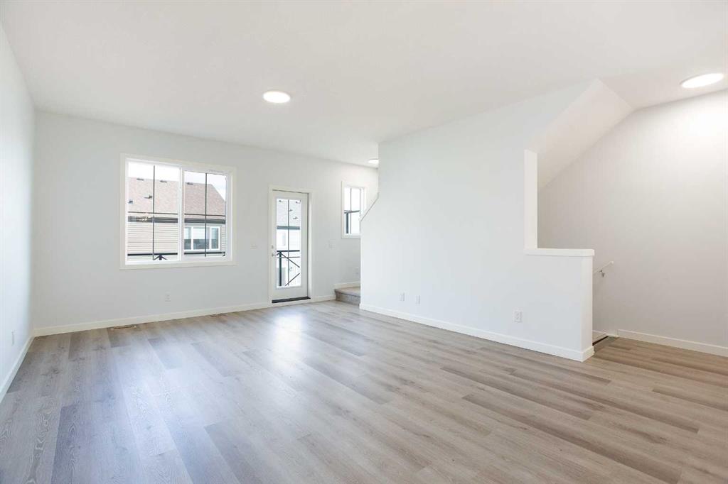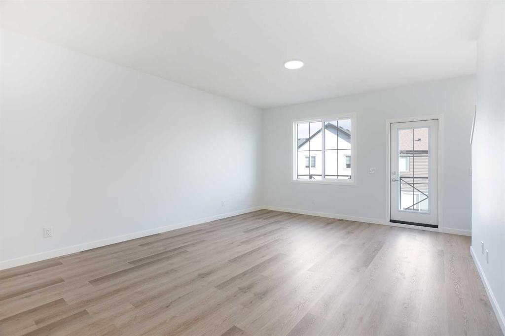 Discover this thoughtfully designed 3-bedroom + Den townhome in the vibrant community of Rangeview, offering nearly 1,700 sq. ft. of modern living space with a fresh, airy palette throughout. Perfectly positioned to face a beautiful morning sun, this home blends comfort with community from the moment you step inside. The open-concept main living space is framed by soaring 9' ceilings and large windows that flood the space with natural light. Durable luxury vinyl plank flooring runs through the kitchen, dining, and living areas, accented by contemporary finishes. The kitchen showcases slab-style cabinetry, quartz countertops, and an inviting eating bar, while the adjacent dining area is ideal for gatherings. Step out onto the upper balcony for a peaceful retreat at any time of day. Upstairs, you’ll find 3 generously sized bedrooms, with a 4th on the main level, providing flexibility for families, guests, or a home office. The primary retreat is a calming haven, while the additional bedrooms share a stylish main bath. Plush carpet with upgraded underlay, quartz counters, chrome fixtures, and tile accents add layers of comfort and quality to every detail. Everyday convenience is built in, with a two-car garage for parking and storage, plus a full-sized laundry set located upstairs for easy access. Living in Rangeview means more than just owning a home—it’s about being part of a community inspired by nature and connection. With a community greenhouse, gardens, playgrounds, and pathways right outside your door, there’s always something to enjoy. Nearby shopping in Mahogany and Seton, the South Health Campus, and quick routes via Deerfoot and Stoney Trail make life both simple and connected. This spacious 4-bedroom townhome offers exceptional value and a lifestyle built around ease, beauty, and belonging. Welcome home to Rangeview.