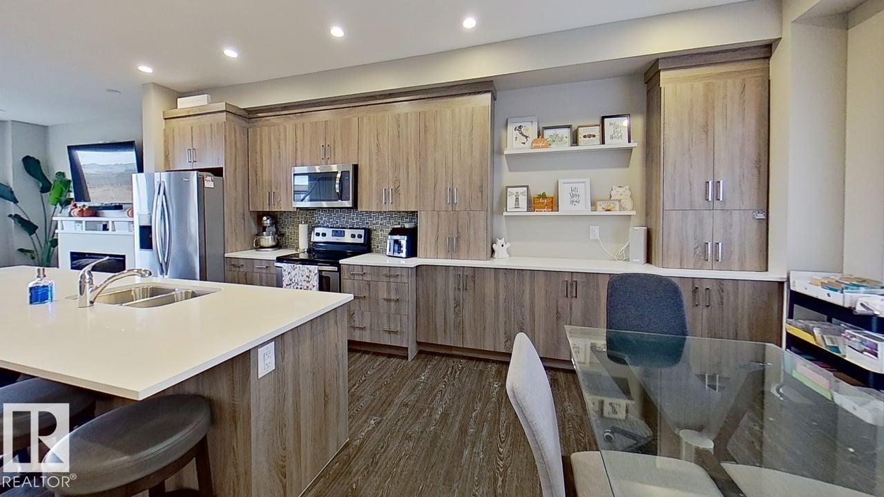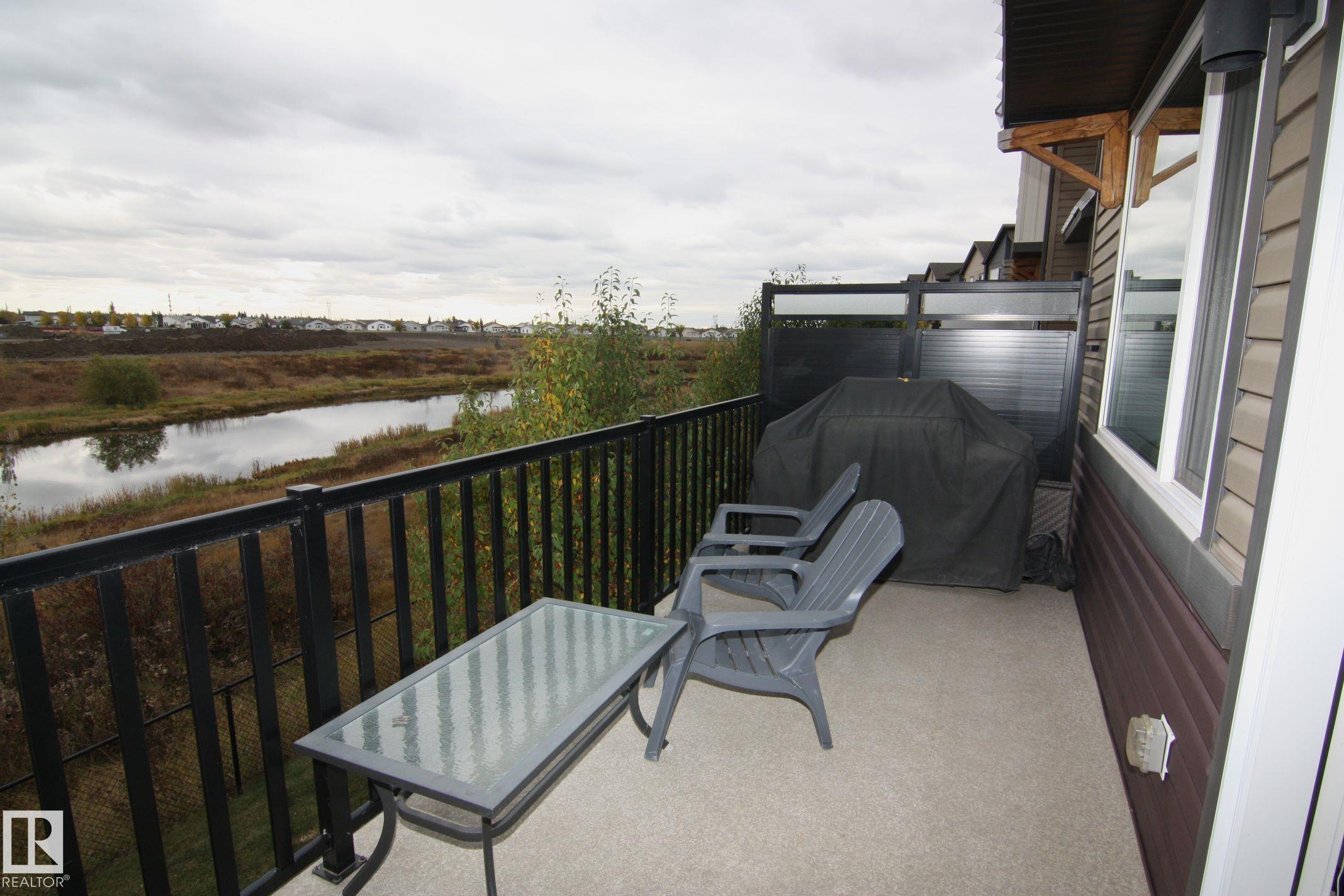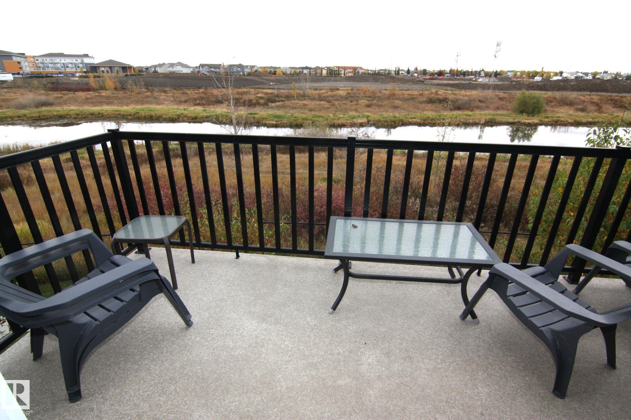 IMMACULATE, MOVE IN READY home. End unit! Large 1575 sqft townhome with double attached garage backing with a panoramic view of a beautiful pond. Premium lot! Fully landscaped yard. Visitor parking is mere steps away. The central AC will keep you cool on those hot summer days. 3 bedroom, 3 bathrooms Beautiful open concept throughout with windows reaching to the ceiling on the main floor. The cook of the family will enjoy the upgraded kitchen with custom cabinets, extensive pot drawers and a large center island with quartz counter tops throughout & high end stainless steel appliances. Relax in your family room with fireplace feature wall with built-in cabinets which leads to your private balcony backing on to the pond. A large master bedroom has a walk-in closet and 3 piece en-suite. Upper floor laundry completes this level. Main floor office on the ground level Five minutes from the Anthony Henday; makes for an easy commute. Great location, close to all amenities.Move in and enjoy this beautiful home