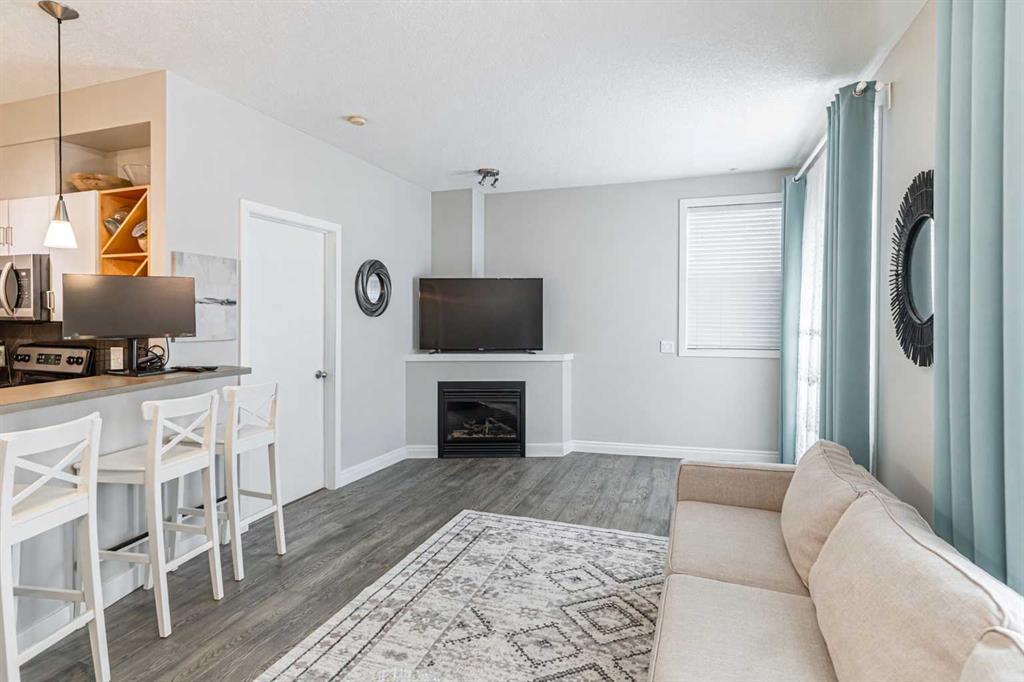 With the Altadore river park and Marda Loop just minutes away, this 2 bedroom unit with 9' ceilings in Kabo is a stylish condo in the perfect location! This property has stainless steel appliances in the kitchen, plenty of cabinets and a breakfast bar with an open concept to the living room that is ideal for entertaining. The living room has a corner gas fireplace and brand new hardwood floors that extend into the two bedrooms. The master bedroom is a nice size and has a walk-in closet that connects to a 4 piece bathroom. The second bedroom is also a good size and can alternatively be used as a home office or fitness room. This property also has insuite laundry and plenty of windows that bring in an abundance of natural light to the unit. There is a patio just off the living room that is perfect for summer relaxation and BBQs. This condo has an underground secured parking stall as well as a secured storage locker. Call to view today!