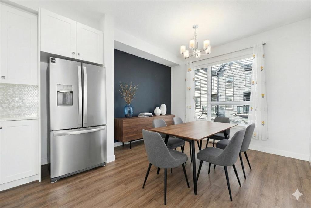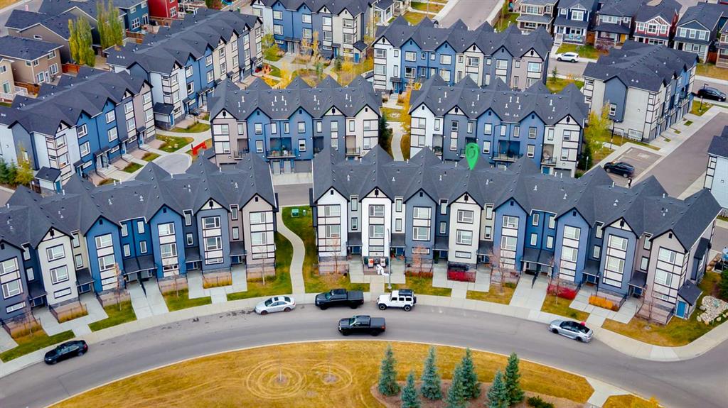 Welcome to this beautifully designed 3 bedroom, 2.5 bathroom townhouse, ideally located in the sought-after community of Evanston in NW Calgary. Perfectly positioned facing a picturesque circular park, this home offers a blend of thoughtful layout, modern finishes, and everyday convenience. The entry level welcomes you with a spacious foyer featuring direct access to the finished double tandem garage, finished with durable epoxy flooring and including dedicated utility and storage areas, providing both function and organization. From here, step outside to enjoy a private ground-level patio, ideal for relaxing, gardening, or entertaining. Additional parking available on the single driveway, ample visitor parking as well as convenient street parking in front of the home. Upstairs, the main living level showcases an open-concept design that seamlessly connects the living room, dining area, and kitchen. The centrally located kitchen is the heart of the home, anchored by a large quartz island and complemented by abundant cabinetry, multiple pantry spaces, and stainless steel appliances. On one side of the kitchen, the bright and inviting living room features large windows that flood the space with natural light and provide access to a balcony, perfect for morning coffee or evening downtime. On the opposite side, the dining area offers plenty of room for hosting family dinners or gatherings with friends. A convenient 2-piece powder room completes this level. The upper floor is thoughtfully arranged to maximize privacy and comfort. The primary suite is situated at one end and features a walk-in closet and a private 3-piece ensuite. On the other end, two additional well-sized bedrooms - one with a walk-in closet—share a full 4-piece bathroom. A convenient upstairs laundry area adds to the practicality of the layout, making daily routines effortless. Additional features include air conditioning for year-round comfort and a location that truly sets this home apart. Enjoy walking-distance access to Evanston’s shopping, schools, and nearby soccer fields, along with quick and easy connections to Stoney Trail for commuting around the city. This move-in-ready townhouse offers a rare combination of park-facing views, modern finishes, and an unbeatable location - an excellent opportunity to call Evanston home.