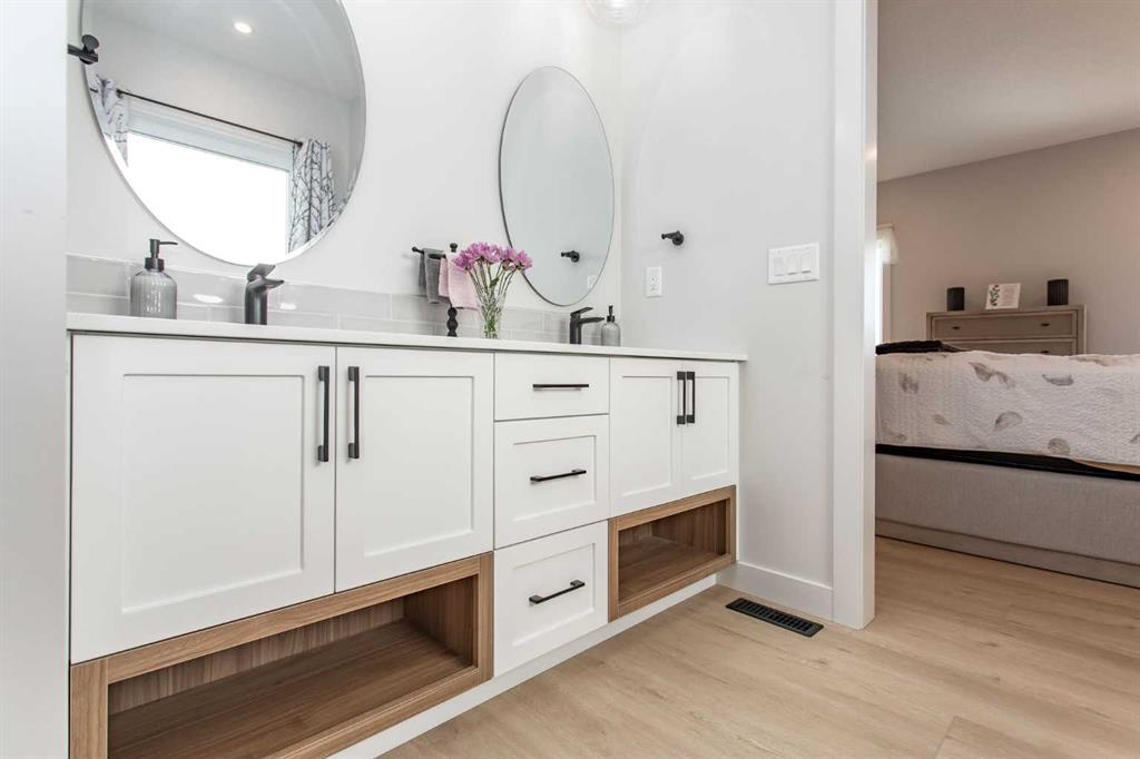 Explore this exquisite and spacious executive bungalow, featuring a three-car garage crafted by True-Line Homes. This residence showcases a unique layout that the builder has designed for the first time. Situated in the picturesque Evergreen neighborhood, this beautiful home presents an expansive open floor plan with soaring 11-foot ceilings and an abundance of south-facing windows, flooding the interior with natural light. As you step through the front door into the generous foyer, you'll immediately notice its convenient dual access with the entrance to the garage. This intelligently designed space includes a large foyer, a spacious closet, and custom shelving. The modern chef's kitchen is a culinary delight, boasting high-end appliances, ample cabinet and countertop space, and an impressive 8.5-foot island. Luxurious finishes include Quartz countertops, a Franke peak undermount granite double bowl sink, and a walk-in pantry with custom shelving for abundant storage. Attention to detail shines through with a custom wood range hood stained to match the island and stylish glass cabinet shelving. On the main floor, there's a versatile den currently utilized as an office, which could easily serve as a fourth bedroom. The spacious primary suite features a five-piece ensuite and a generously sized custom walk-in closet, expertly designed by Canadian Closet. An additional highlight is the expansive laundry room equipped with custom cabinetry and countertops, along with a pass-through window from the walk-in closet. This laundry space houses the LG 6.0 cu. ft. mega capacity Wi-Fi enabled front-load washer with the LG Sidekick mini washer in the pedestal along with a matching 9.0 cu. ft. dryer. Lastly, a two-piece powder room completes the main level. Descend the extra-wide stairs to the cozy family room, equipped with in-floor heating, ideal for movie nights or family game sessions. This level also includes two spacious bedrooms and a full four-piece bathroom, all enjoying the comfort of in-floor heating. The large storage area features durable painted floors, offering potential for an additional bedroom. This home boasts numerous upgrades, including a low-maintenance front verandah and a 10' x 18' back deck, central air conditioning, a water softener system, SunStop Low E argon-filled windows, and a fully finished heated triple garage with an epoxy-coated floor and two dry sumps. Custom Hunter Douglas blinds are fitted throughout, with motorized options in the living room, office, and primary bedroom. The professionally landscaped front and back yards feature stone elements and raised flower beds, enhancing the home's curb appeal. The Evergreen neighborhood offers extensive multi-use trails connecting to Red Deer’s extensive trail system, as well as two ponds with unique bridges and large playground and park facilities. Come and discover the elegance and comfort this remarkable property has to offer!