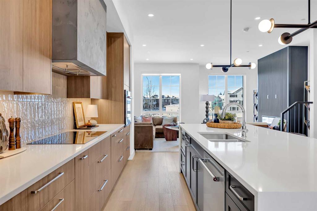 Welcome to 12 Greenwich Heath NW, the Carrara model by Partners, a distinctive four-storey Modern Brownstone directly fronting the canal in the northwest community of Upper Greenwich. Offering a rare combination of architectural presence, refined interiors, and an exceptional waterfront setting, this no-condo-fee residence stands apart within Calgary’s luxury townhome market. The exterior reflects classic brownstone architecture, while the interior has been professionally curated with elevated finish selections throughout. The home features a private four-storey elevator, rooftop patio, and an oversized heated rear-attached double garage, providing comfort, convenience, and long-term versatility for a range of discerning buyers. The entry level begins with an expansive foyer and includes a flexible office or bedroom, a full bathroom, and a mudroom with custom built-ins. Direct access to the heated garage adds everyday practicality. The main living level offers 10’ ceilings and oversized windows that frame canal views and fill the home with natural light. The kitchen is thoughtfully designed with a custom plaster hood fan and an oversized waterfall-edge quartz island. Built-in dining cabinetry adds both function and visual cohesion, while the living room is anchored by a statement fireplace. A rear deck with enclosed storage extends the living space outdoors. A powder room with floating vanity and under-cabinet lighting completes this level. The third floor is dedicated to the private sleeping quarters. The primary suite features a well-appointed ensuite with fully tiled glass shower, freestanding soaker tub, and dual vanities. Two additional bedrooms share a full bathroom finished to the same standard. A laundry room with built-in cabinetry, sink, and quartz countertops adds everyday convenience. The top floor is designed as an elevated entertaining space, complete with a wet bar and beverage fridge. From here, step onto the private rooftop patio with hot tub rough-in and open views toward the canal and surrounding community. Additional features include air conditioning, a full blinds package, and modern mechanical systems designed for comfort and efficiency. Upper Greenwich has been thoughtfully planned to offer a strong sense of character, walkability, and connection to green space. Residents enjoy immediate access to the canal and pathways, proximity to the Bow River pathway system, Calgary Farmers’ Market West, nearby shops and restaurants, sports courts, playgrounds, and WinSport. With convenient access to downtown Calgary and the Rocky Mountains, the location offers a rare balance of urban convenience and natural surroundings. This is a rare opportunity to own a canal-front brownstone offering architectural distinction, refined interiors, and an exceptional setting in one of Calgary’s most distinctive communities.