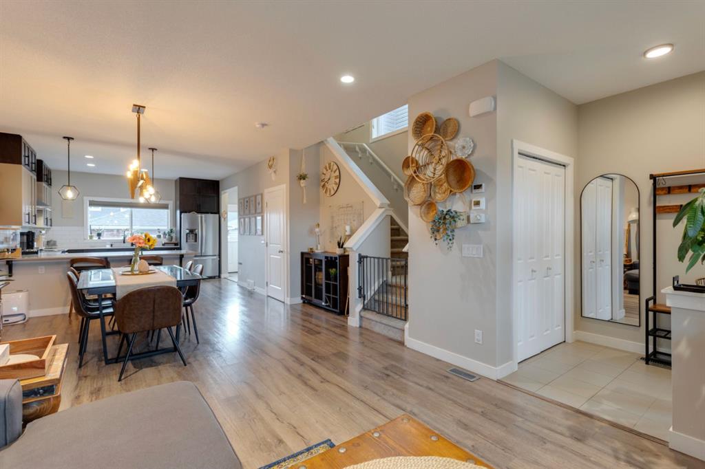 Proudly offered by the original owners, this meticulously maintained duplex in Redstone is a rare opportunity to own a fully upgraded, turn-key property in one of Calgary’s most connected and growing communities. Built by Shane Homes in 2019 and thoughtfully customized from day one, every corner of this home reflects pride of ownership and practical design. As you enter the 9-foot ceilings on the main floor welcome you, the custom 2 tone kitchen and professionally developed basement, this home offers over 2,100 square feet of finished living space with upgrades that matter. Open-concept layout connecting kitchen, dining, and living areas. Kitchen features quartz countertops, stainless steel Whirlpool appliances with water and ice fridge, hood fan, and built-in microwave in the island. Spacious primary suite with large windows, walk-in closet (with custom shelving), and ensuite featuring double shower heads (rainhead and handheld) and a private water closet. Professionally developed basement with a large flex space, recreation room with window, half bath, and two storage rooms, private side entrance with finished landing and smart lock. Detached garage: heated, insulated, drywalled, epoxy floor, upgraded electrical (suitable for compressor or welding equipment), landscaped backyard with poured concrete patio and extra tall lattice privacy fencing, new shingles, eavestroughs, and siding. Insulated garage door (new in 2025), Full servicing of furnace and AC (2025), Brand new washing machine.