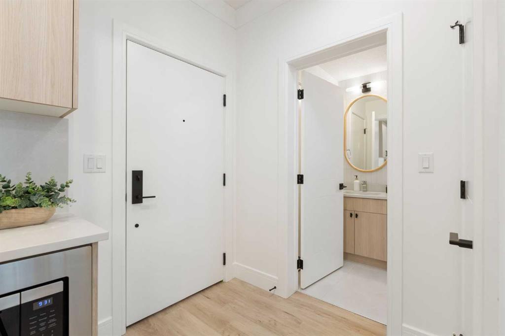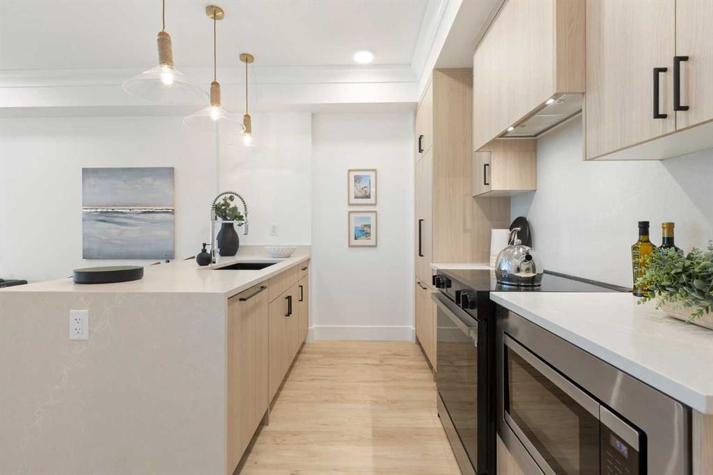 Be the very first to call this pristine, never-lived-in home your own—a sun-filled, modern retreat where every detail feels fresh, flawless, and intentionally designed for the way you live. From the moment you step inside, the open layout draws you in, anchored by a showpiece kitchen where a sleek quartz waterfall island meets premium stainless steel appliances (notice the cabinet front dishwasher and fridge!), an upgraded hood fan, and an oversized sink that makes both cooking and hosting effortless. Natural light pours through oversized windows into both the bedroom and living room, creating a warm, airy atmosphere. Your spacious bedroom easily accommodates a queen bed with nightstands. The bathroom echoes the home’s elevated design with quartz countertops and high-quality fixtures including upgraded tile from the tub to the ceiling, upgraded black rainfall shower head w/ wand & the tile backsplash spans the height of the wall above the beautiful vanity w/ quartz counters! Step outside to your private second-floor balcony—perfect for morning coffee, summer BBQs, or winding down with your favourite beverage as the sun sets. Comfort is elevated with central air conditioning, in-suite laundry, and a titled underground parking stall, plus visitor parking and secure bicycle storage for added convenience. Set within Dean’s Landing in Calgary’s sought-after University District, you’re surrounded by a vibrant, walkable community where trendy cafés, restaurants, and everyday conveniences are just steps from your door. Enjoy easy access to green spaces, bike paths, the University of Calgary, Foothills Medical Centre, and downtown—blending urban energy with neighborhood charm. This unit won’t last long! Call your favourite realtor today to book a private viewing of this beautiful condo.