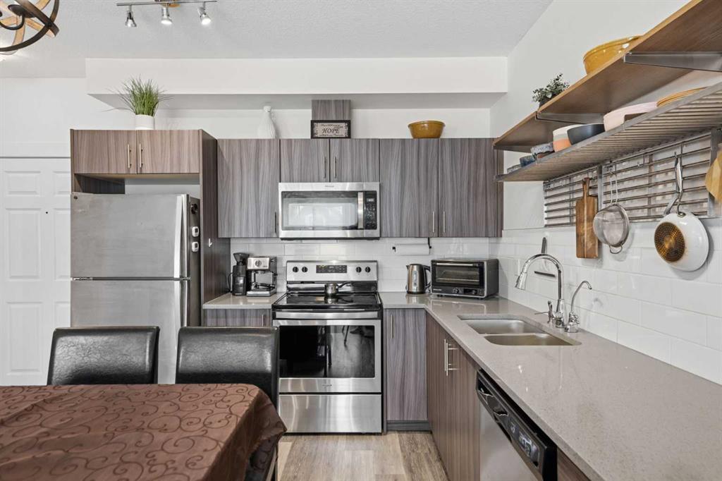 Open House Saturday April 25 1-3pm. A smart layout and clean modern finishes come together in this move-in ready 2 bedroom, 2 bathroom 2 Parking stall condo located in the growing community of Sage Hill. Everyday living feels comfortable and efficient thanks to air conditioning and an open-concept design that keeps each space connected without sacrificing definition. Gather around the kitchen where stainless steel appliances, ample cabinetry and a practical layout support both quick meals and weekend hosting, while designer lighting brings warmth to the adjoining dining area. Natural light fills the living space as patio sliders extend the footprint outward to a covered balcony that encourages morning coffee, summer barbeques or a quiet place to unwind. Privacy is well considered through a split-bedroom configuration, giving each space its own sense of separation. Unwind in the primary retreat where walk-through dual closets lead to a private ensuite with dual sinks, creating a comfortable daily routine. Flexibility continues in the second bedroom with its own walk-through closet and second access to the 4-piece bathroom, making it equally suited for guests, roommates or a dedicated workspace. In-suite laundry adds convenience while heated underground parking, a second above ground stall and a separate storage locker simplify day-to-day living. Located in the vibrant northwest community of Sage Hill, residents enjoy easy access to scenic walking paths, parks, and natural green spaces, along with nearby shopping, restaurants, and everyday amenities. With quick connections to major roadways, commuting is simple while still enjoying a peaceful, community-oriented setting. A perfect opportunity for first-time buyers, downsizers, or investors—don’t miss out!!