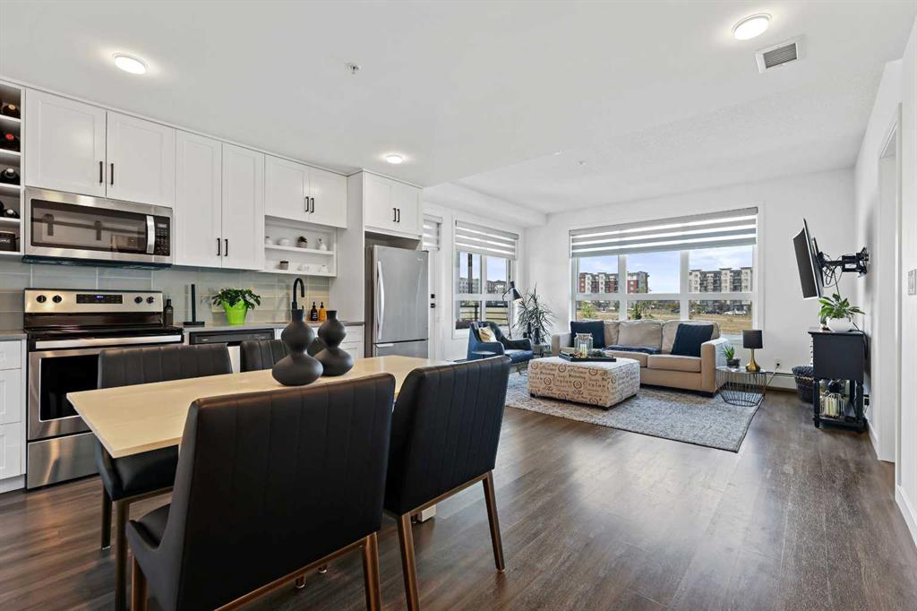 OUCH ALERT — “2” Hot To Handle Price: $349,900 Sunny south-facing balcony views, immediate possession, and two titled parking stalls make this upgraded two-bedroom, two-bath second-floor home an absolute standout in the highly sought-after community of Livingston. Located in the popular Maverick building, this bright and beautifully maintained unit offers exceptional value and modern comfort in one of north Calgary’s most vibrant neighbourhoods. With 855 RMS square feet of well-designed living space, the open-concept layout feels both spacious and inviting. The upgraded shaker-style white maple kitchen features tall upper cabinets, generous counter space, a pantry with extra storage and freezer space, full-height tile backsplash, dual-basin stainless steel sink, and a pull-out faucet. The kitchen flows seamlessly into the dining and living areas, perfect for everyday living or entertaining. Modern white-painted casings, doors, and baseboards add a crisp finish throughout, while convenient in-suite laundry with a stacked washer and dryer offers additional storage. Step outside to the impressive 26.5' x 6.1' glass-railed balcony and enjoy sunny south exposure—ideal for morning coffee or evening relaxation. Rarely do you find two titled parking stalls included at this price point, adding tremendous value and flexibility. Living here means enjoying full access to the Livingston Hub and community amenities, including a banquet hall, splash park, skating rink, tennis and badminton courts, and gym facilities. Everything you need is within walking distance, from dining and shopping to everyday essentials. With quick access to Country Hills Boulevard, Stoney Trail, and Deerfoot Trail, commuting is simple and convenient. The complex is pet-friendly with board approval, making it a perfect fit for a variety of lifestyles. Move in now and start enjoying the unmatched community experience Livingston is known for. This one checks all the boxes for location, lifestyle, and value. Call your friendly REALTOR® today to book your private viewing.