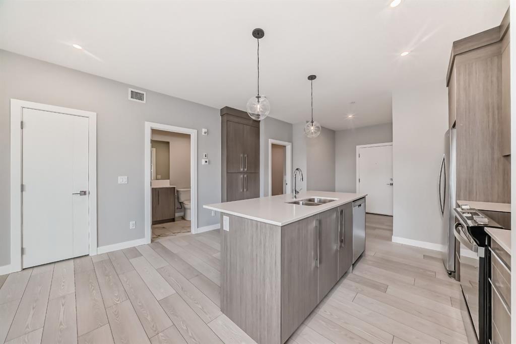 This beautifully designed 2-Bedrooms, 1-Bathroom condo is located in Lockwood at Chelsea, a vibrant and growing community in Chestermere. Enjoy the convenience of nearby playgrounds, scenic pathways, golf, and shopping, all within a welcoming neighbourhood that balances comfort and connection. Step inside to experience an exceptional living environment featuring high-quality finishes throughout. Luxurious vinyl plank flooring enhances the open layout, creating a bright and inviting atmosphere. The chef-inspired kitchen boasts full-height cabinetry with soft-close doors and drawers, a sleek stainless steel appliance package, and a pantry for all your storage needs. Elegant quartz countertops and an eat-up bar provide the perfect space for casual dining and entertaining. The primary bedroom serves as a relaxing retreat with a spacious closet, while the second bedroom offers versatility—ideal for guests, a home office, or a cozy nursery. A 4-piece bathroom and convenient in-suite laundry add everyday practicality. This bright, move-in-ready home is built by TRUMAN, reflecting their signature craftsmanship and commitment to helping you Live Better. One titled parking stall is included for your convenience.