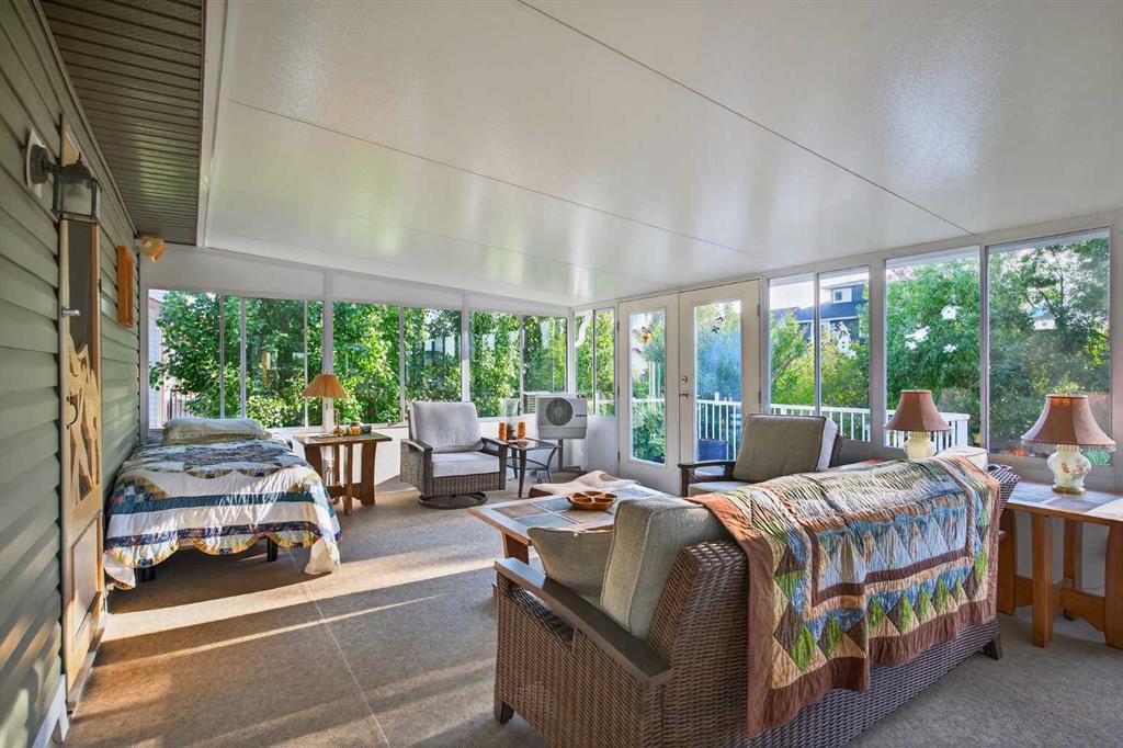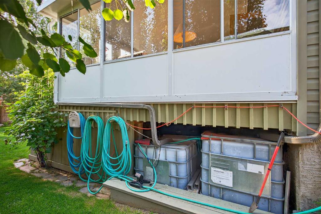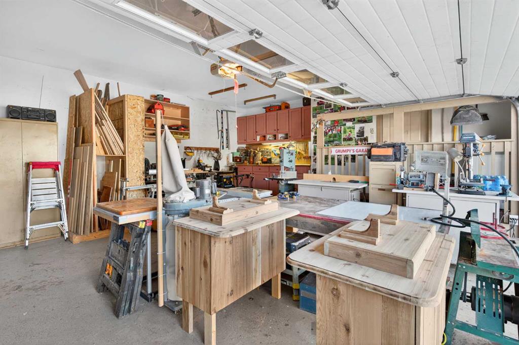 125 Copeland Close, Langdon - where space, sunshine, and small-town charm come to meet. Loved by the same family since they had it built, this 1523 sq ft bungalow is set on a massive, beautifully landscaped, sunshine lot that's ready for year-round gatherings. Imagine morning coffee on a large front porch and relaxing in the evenings in one of two, large, 3 season sun rooms. Enjoy grilling on a natural gas BBQ (included),or gathering round a fire pit on a 23 ft circular cement pad. Two 1,000 litre rain collection tanks under the deck, plus a custom built shed makes gardening easy. Inside the main floor features new hardwood, fresh paint,a bright kitchen with a solar light, and a large walk-in pantry with an upright freezer included. The kitchen boasts a 1 year old fridge/freezer, a gas stove with 220 V power behind and a built in microwave above. The super quiet dishwasher, and trash compactor complete the thoughtful extras. 4 island height bar stools are included. The main floor laundry has a new washer and dryer. The main floor 3 piece bathroom is conveniently located with garage access. The main floor also features a bright, versatile office — perfect for working from home, running a small business, or creating a quiet homework space. With its convenient location near the front entrance, it offers both privacy and easy access for clients or guests, without disturbing the rest of the household. The oversized primary bedroom has a walk-in closet, 4 piece ensuite bath, and access to one of the sunrooms. The basement is completely developed with family comfort and entertainment in mind. There are 2 large bedrooms, each with custom features and a generously sized 4 piece bath. There is a craft room and large family room with wet bar and bar fridge included. One of two natural gas fireplaces complete this well planned space. The oversized attached garage is a handyman's dream with built in cabinets, 220 V wiring, and counter top work space.