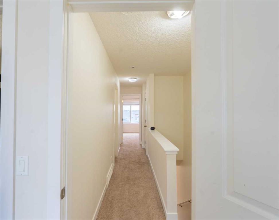 Bright, Stylish & Functional – The Perfect Family Layout From the moment you enter, this home offers thoughtful design and everyday practicality. The ground-level entry near the garage opens into a dedicated office workspace complete with built-in desk and shelving — ideal for working from home or managing busy family life. The foyer includes a spacious closet, convenient 2-piece bathroom, and direct access to the garage, where the furnace and mechanical room are neatly tucked away. Upstairs, carpeted stairs lead to a stunning main living area filled with natural light. Expansive, nearly full-width windows flood the space, highlighting the beautiful accent wall that adds warmth and character to both the living and dining areas. The open-concept design creates an inviting atmosphere perfect for entertaining or relaxing. The kitchen is both elegant and functional, featuring rich dark wood cabinetry that contrasts beautifully with crisp white quartz countertops and a central island. Stainless steel appliances complete the modern look, while sliding patio doors open onto a spacious balcony — perfect for morning coffee, evening BBQs, or gathering with family and friends. The upper level offers three generously sized bedrooms, including a comfortable primary retreat with its own 3-piece ensuite and double closets for ample storage. A convenient upper-floor laundry room with stackable washer and dryer makes daily living easier and more efficient. Outside, the fenced front yard feels like a private oasis. Low-maintenance landscaping, mature trees, and lush greenery provide exceptional privacy and a peaceful setting to unwind. Location adds even more value — with two schools nearby (including a French immersion option and an elementary school), a playground just steps away, and only 8 minutes to Walmart and the main shopping market for all your daily essentials. This home combines style, smart layout, unbeatable convenience, and low-maintenance living — a fantastic opportunity for families, professionals, or first-time buyers alike. Book your private showing today.