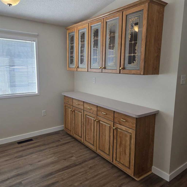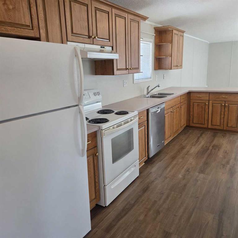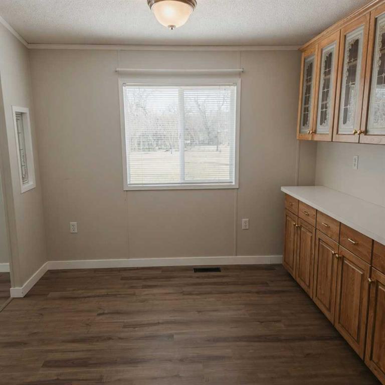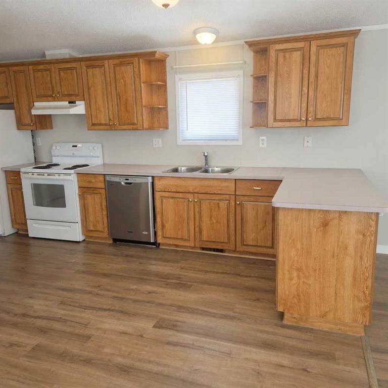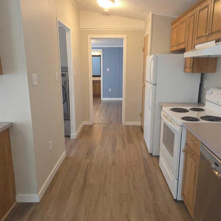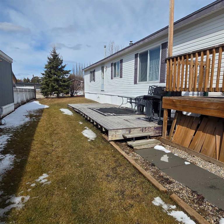 Welcome to this nicely upgraded 2000-built modular home offering a bright and functional open-concept layout with vaulted ceilings. The spacious living room flows seamlessly into a well-appointed kitchen featuring an abundance of cabinetry, pantry storage, and a dining area complete with built-in china cabinets—perfect for everyday living and entertaining. The primary suite is thoughtfully designed to accommodate king-sized furniture and includes a large walk-in closet along with a private ensuite showcasing an oval soaker tub/shower combo. On the opposite end of the home, you’ll find two additional bedrooms and a full 4-piece bathroom with a convenient oval tub/shower combination. The laundry room is equipped with upgraded appliances, ample storage space, and direct access to the backyard. Throughout the home, you’ll appreciate the neutral, modern colour palette, newer vinyl plank flooring, updated trim, and upgraded light fixtures. Shingles were replaced in 2021, adding to the home’s overall value. Step outside to a fully landscaped and fenced yard featuring a large lower deck that’s ideal for outdoor enjoyment and there’s a large shed for storing your gear. Front porch has been redone and has posts in place to support a cover if one desired. The gravel parking pad provides space for up to three vehicles. Situated in a desirable west-end location within Sunset Mobile Home Park, this property is close to schools, parks, walking trails, and shopping amenities. Move-in ready with quick possession available.