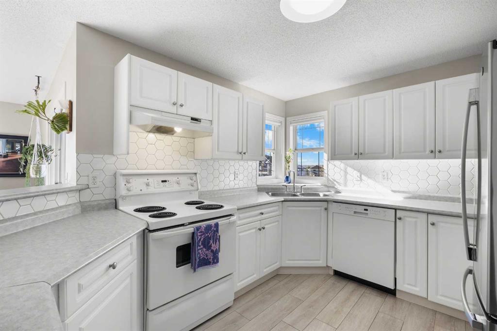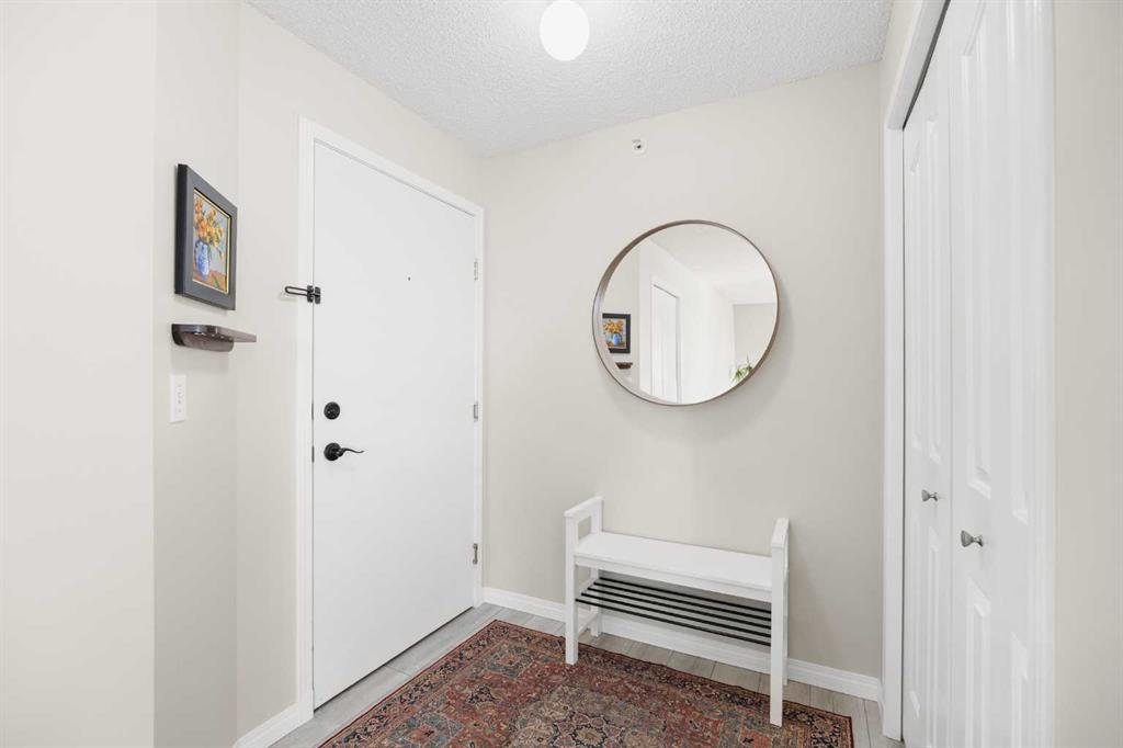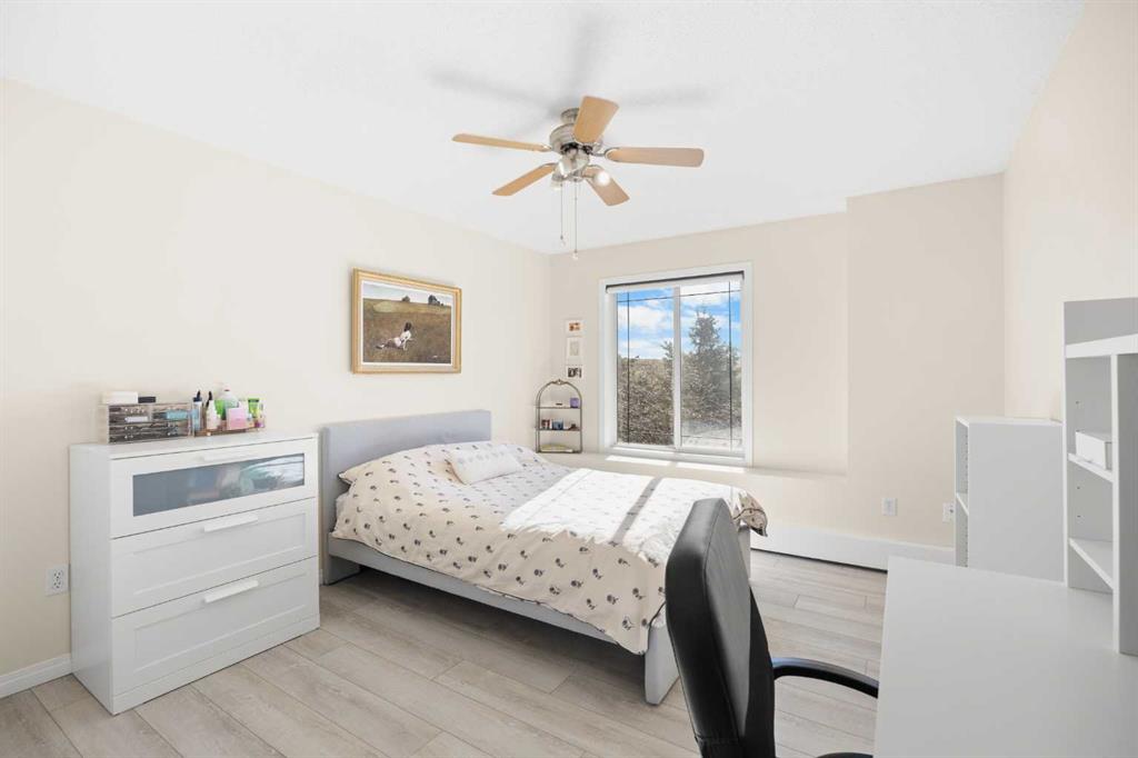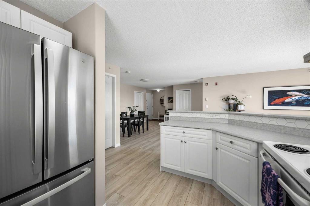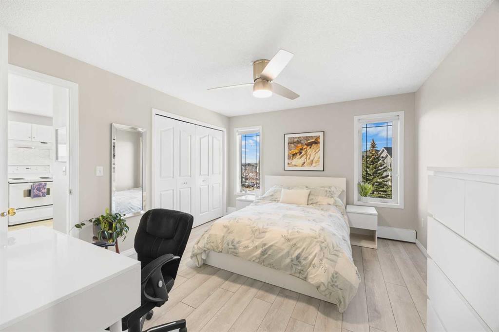 TOP FLOOR & CORNER UNIT with no one above, Mountain views, and a private Balcony, this bright and beautifully maintained condo in Tuscany offers 2 Bedrooms, 2 Bathrooms, and 1,021 sq ft of comfortable living space. Ideally located near pathways, parks, and everyday amenities, this exceptional home combines privacy, functionality, and scenic surroundings in one of Northwest Calgary’s most desirable communities. Step inside and be greeted by upgraded Vinyl Plank flooring and a spacious open-concept layout designed for easy everyday living and entertaining. The inviting Living Room is filled with natural light from its South-East-facing windows and enjoys open views toward the nearby greenspace and pathways. Patio doors lead to the private Balcony, where South-West-facing exposure provides an ideal setting to relax, enjoy the sunset, and take in the Rocky Mountain views. The Kitchen is bright and functional, featuring ample counter space, generous cabinetry, a raised breakfast bar, and a corner window that brings in additional natural light. The adjacent Dining Room offers excellent space for family meals or hosting guests while maintaining an open and connected flow to the main living area. The thoughtfully designed floorplan provides excellent bedroom separation for added privacy. The spacious Primary Bedroom features dual windows, a ceiling fan, and a private 4-piece ensuite. The second Bedroom is also well-sized with a ceiling fan and is conveniently located beside the additional 4-piece Bathroom, making it ideal for guests, family, or a Home Office. A dedicated in-unit Laundry Room with extra storage space adds everyday convenience. Recent updates include newer Paint (2025), newer Refrigerator (2023), and upgraded $2,000 Baseboard Heater Covers for a clean, modern finish. This home also includes an assigned parking stall ideally located directly in front of the building entrance for easy access. Well-managed building amenities include a Party Room and Bike Storage. Condo fees include Electricity, Heat, and Water for added monthly value and convenience. Perfectly positioned next to a Baseball diamond, Tuscarora Soccer Field, and nearby pathways leading to 12 Mile Coulee and the popular Tuscany Off Leash Area. Just short walk to Tuscany C-Train Station for easy downtown commuting. Residents enjoy close proximity to schools, shopping, restaurants, parks, and transit. Convenient access to Stoney Trail, Crowchild Trail, and Highway 1A makes commuting simple whether heading downtown or west toward the mountains. Exceptional opportunity to own a bright and private top floor condo with views, space, and an outstanding Tuscany location—book your private showing today.
