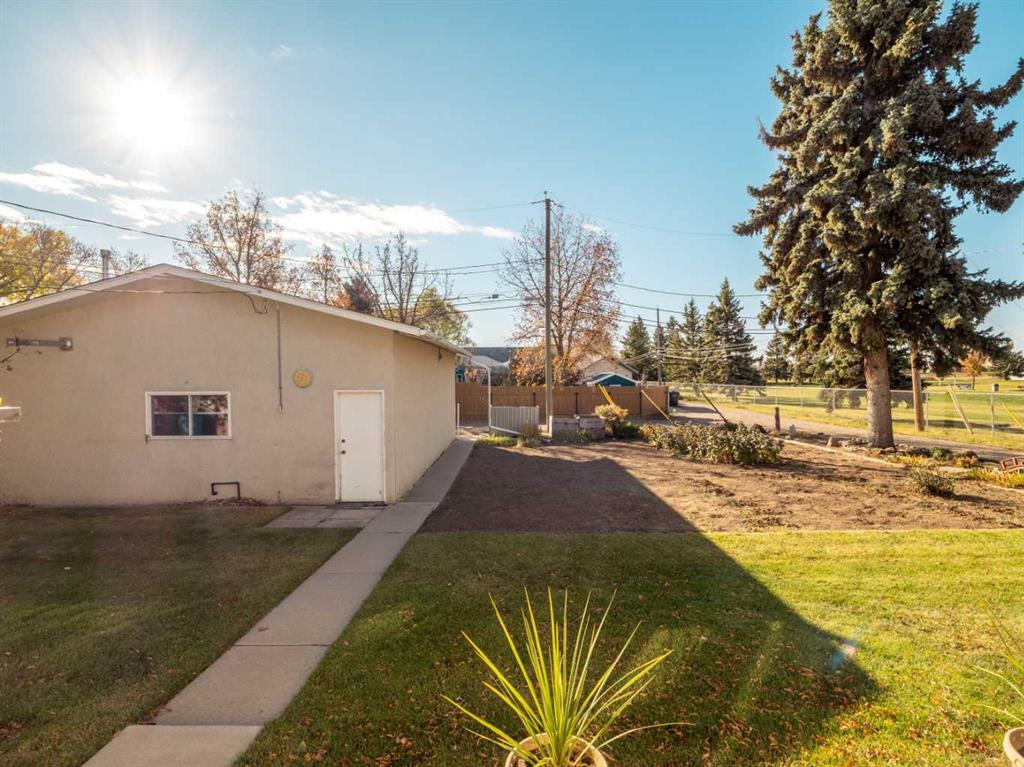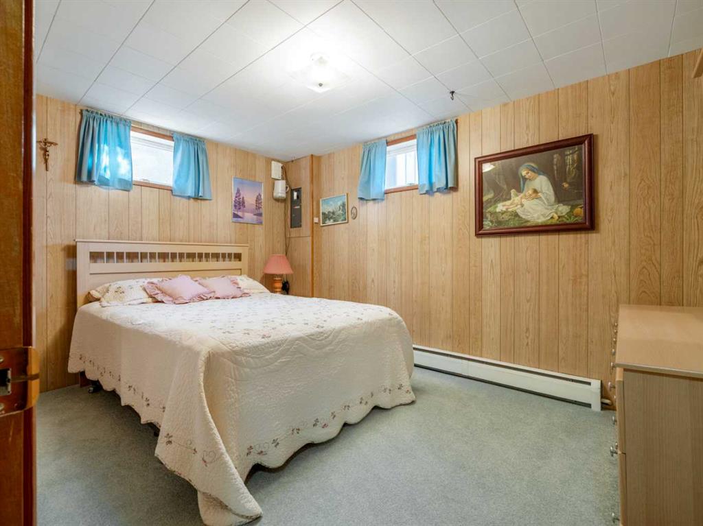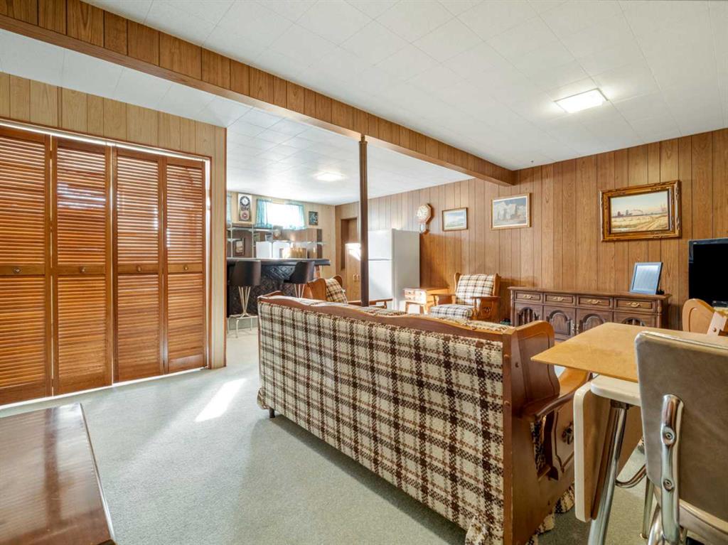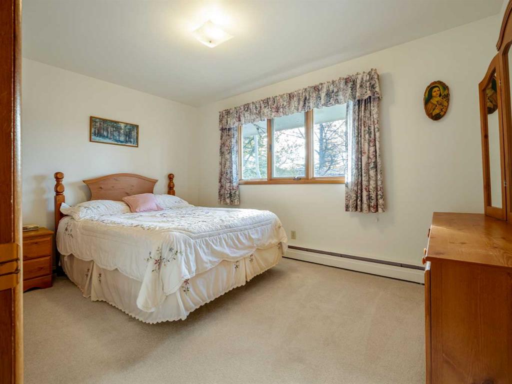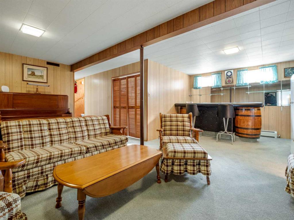 Sprawling Bungalow beside St. Joseph’s Elementary School. This spacious bungalow sits on an extra-large lot and offers both an attached single-car garage and a detached double garage — perfect for storage, hobbies, or extra parking. Inside, the main floor features a generous living room, dining area, and kitchen, along with three bedrooms and a full bathroom. Off the dining room, you’ll find a sunroom that connects directly to the single garage — ideal for enjoying morning coffee or extending your living space year-round. Downstairs, the basement includes a cozy family room with a built-in bar, two additional bedrooms, a den, full bathroom, laundry area, and a crawlspace for storage. Outside, the yard is beautifully landscaped with mature trees and greenery. A massive concrete veranda provides a great space for outdoor entertaining, and the backyard includes a garden area plus plenty of room to make it your own.