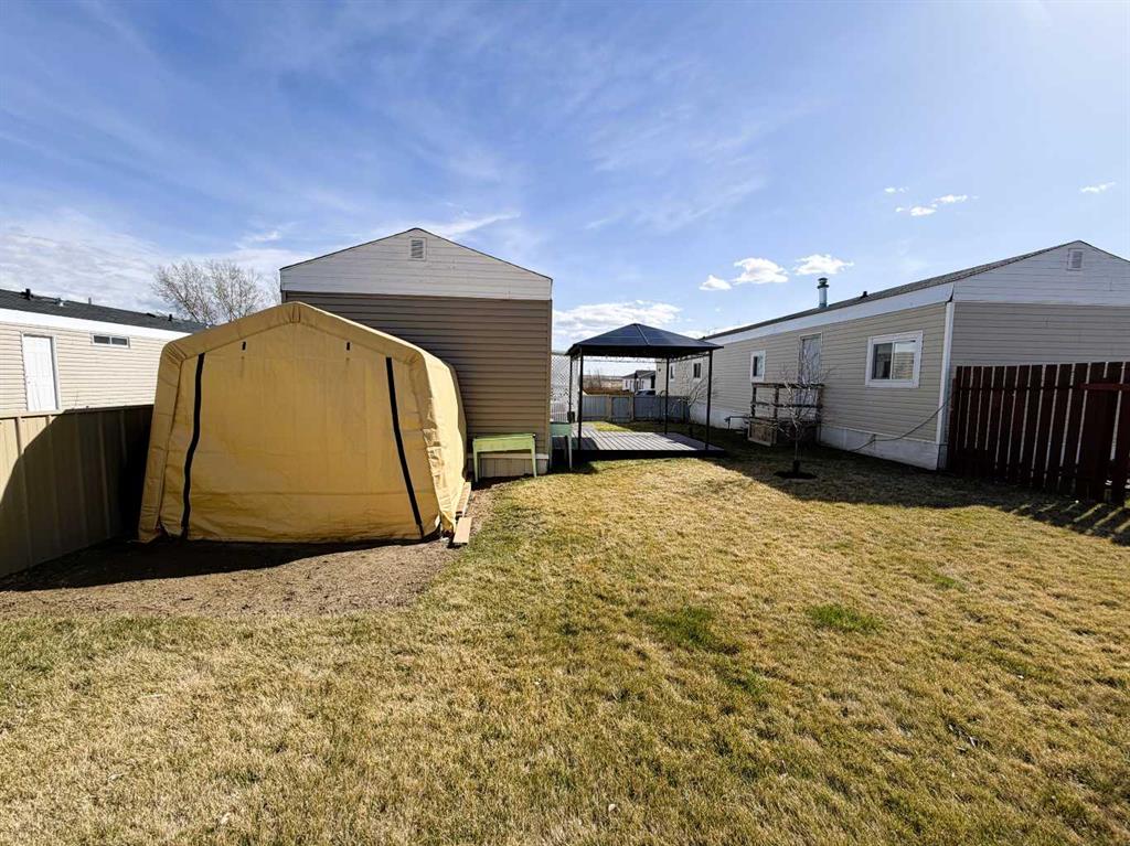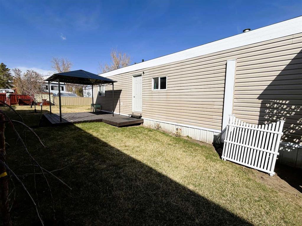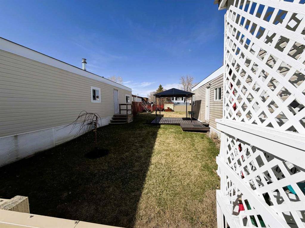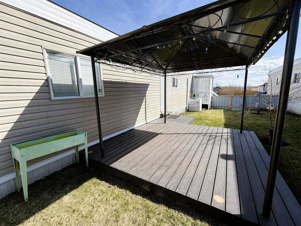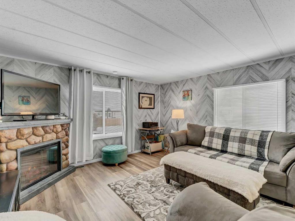 Step into this stylish and inviting 2-bedroom home, where a bright atmosphere greets you. The open-concept layout connects the kitchen, dining, and living areas, making it easy to enjoy time together. The bathroom has been thoughtfully updated, and durable flooring throughout offers low-maintenance comfort. Cozy up to the corner fireplace with a good book or a hot beverage on those chilly days or spend summer evenings beneath the spacious pergola after puttering in the fenced, roomy yard, which features plum and crab apple trees. A rechargeable lawnmower is also included with the purchase – no long chords to trip over! Newer vinyl windows have been installed as well as new blinds for most of the windows. For low maintenance and stress free living, this is the one for you! This home is located in a well maintained park that has a playground for the kids and is close to restaurants, shopping, schools, walking trails, public transit and much more! It's almost springtime planting season, so now is the perfect time to make the move! Utilities are included in the pad fee except for electricity.