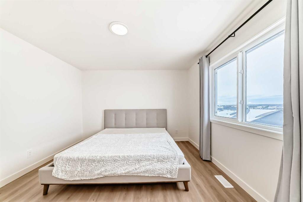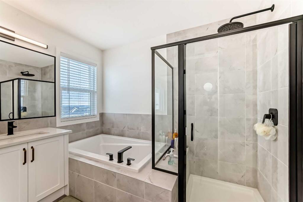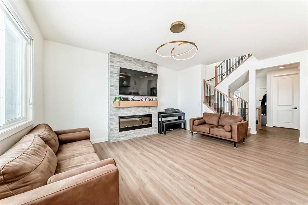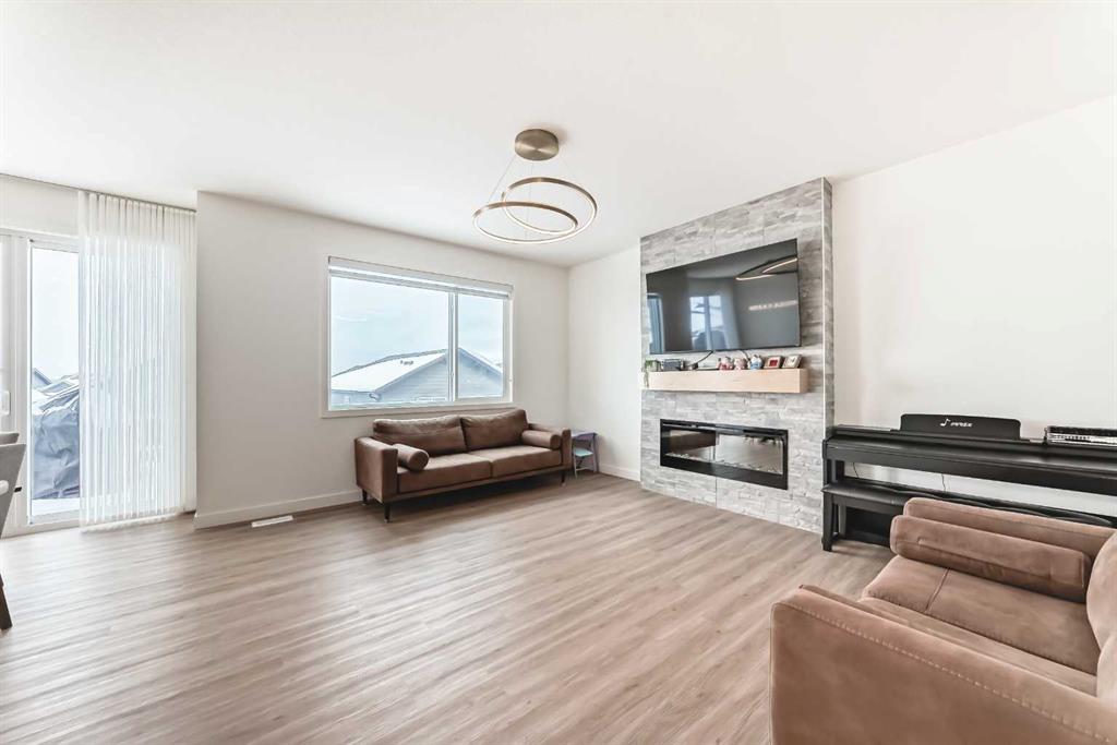 Welcome to this beautifully upgraded walkout home in the highly desirable, family-friendly community of Vermilion Hill in Alpine Park. Offering over 2,100 sq.ft. of thoughtfully designed living space, this home features over $150,000 in upgrades and showcases quality finishes throughout, including full flooring upgrades, upgraded lighting, and full-height lacquered kitchen cabinetry with adjustable LED cabinet lighting. The bright and spacious main level is filled with natural light and features a cozy fireplace, a stunning quartz island with sink and gold accents, high-end stainless steel appliances, a 36" KitchenAid cooktop with 23,000 BTU, a 36" 1300 CFM hood fan, Bosch 800 Series dishwasher, and a 3-piece bathroom. The dining and living area opens to a large rear deck, perfect for entertaining or relaxing outdoors. Upstairs, including the generous bonus room, convenient laundry, two additional good-sized bedrooms, a full 5-piece bathroom, and a spacious primary retreat with a luxurious 5-piece ensuite, and beautiful views of downtown and the Rocky Mountains. The 9-ft walkout basement offers excellent future potential. Additional features include a whole-home water softener and fully completed landscaping with concrete walkway and patio. Conveniently located close to schools, shopping, transit, and amenities, this exceptional home is one you do not want to miss.