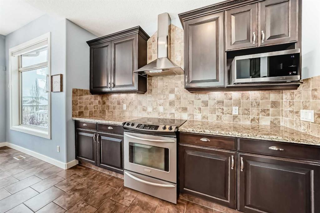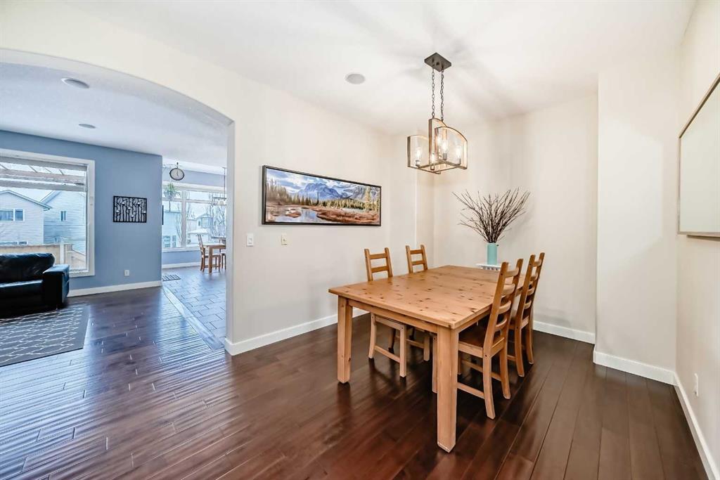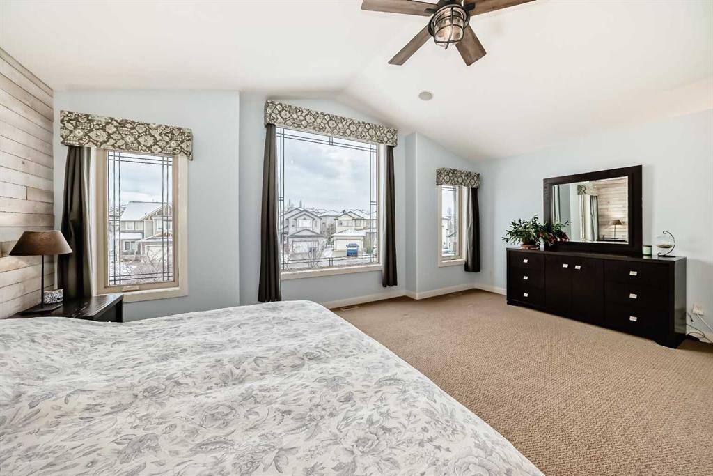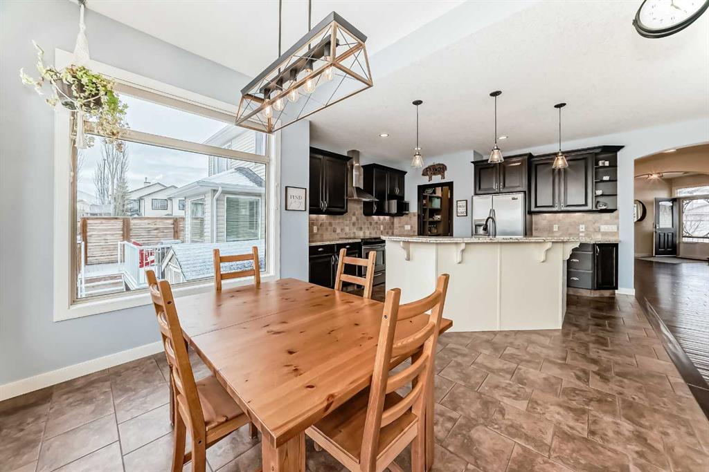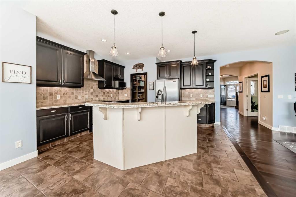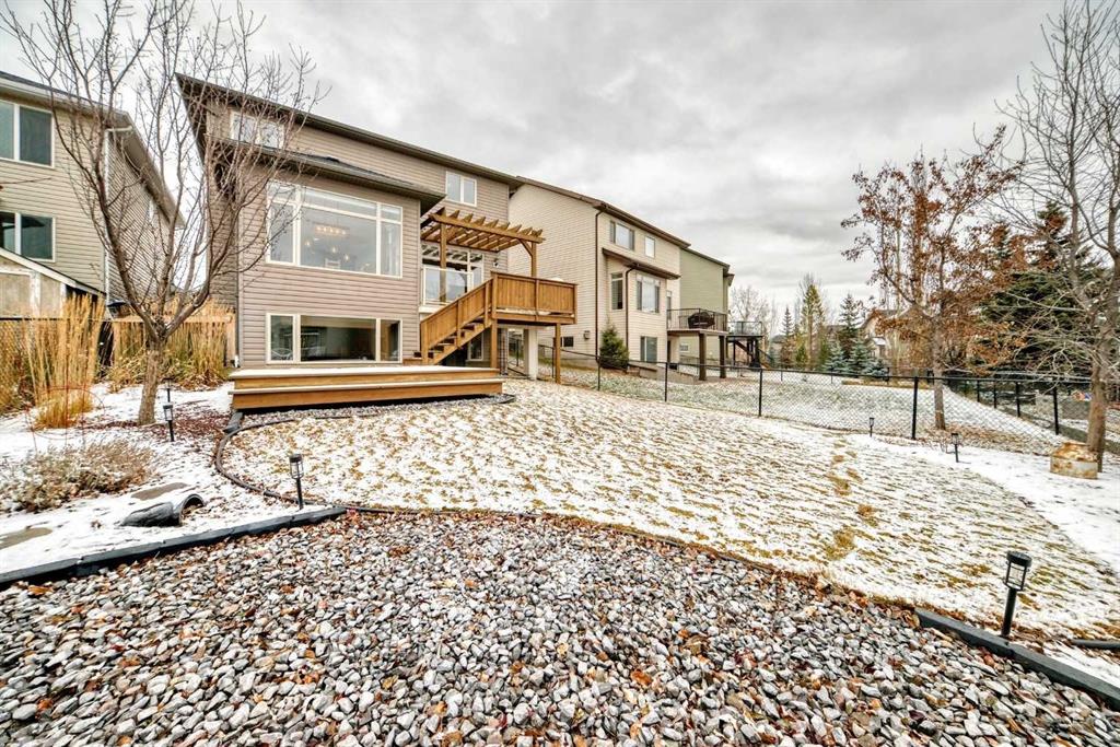 Welcome to this BEAUTIFULLY MAINTAINED custom Jensen-built home tucked into, a quiet, friendly cul-de- sac in the coveted Lower part of Sunset Ridge- a two time Best seller community. Step through the tall, light- filled entry where an expansive window opens the entire space. The main floor unfolds with an open, flowing layout surrounded by vast floor-to ceiling windows and 9-ft ceiling ceilings that fill the room with natural sunlight from morning thru evening. The kitchen features granite counter tops, a raised eating bar and spacious workspaces. From the kitchen a large walk-thru pantry with abundant shelving leads to a tucked-away mudroom and laundry area. The living room is anchored by a cozy gas fireplace and wide south-facing vistas towards the backyard. A dedicated main-floor office / formal dining room and a 2 pce bathroom completes the main floor.Upstairs, FOUR generous bedrooms offer remarkable versatility. The custom primary suite is a true retreat with tall vaulted ceilings, oversized windows framing its sunrise views. The ensuite includes a corner soaker tub/walk-in closet with smart built-ins. The additional bedrooms easily accommodate queen beds. A 5-pce bathroom completes the upper level. Epic mountain views from the back bedrooms. The professionally finished Daylight Lower level bright and open thanks to oversized windows and 9 ft ceilings. This level includes a generous wet bar with granite counter tops, additional bedroom / 4 pce bathroom. The large family room for entertainment with a gas fireplace. Double attached garage. SPACIOUS YARD. Step outside to over 400 sq ft of deck space, complete with a beautiful wooden pergola, the perfect vantage point for sunsets, mountain silhouettes, and family gatherings. The landscaped, gated yard features mature trees / a Rundle Stone Pad for a firepit. A PRIZED + PRIME LOCATION, with immediate access to Hwy-22 /Easily walk or cycle to the Ranchehouse paths and even Glenbow Pathway system/ playgrounds / outdoor fitness, and the upcoming community centre. This home EXCEPTIONAL location puts it walkable to Ranchview school (K-8) St Timonthys High School and the 6 acre pond, park and paths. Steps up the street you have a cozy community hub with a daycare/country market, pub, gas station, wine & spirit store, pharmacy, dental, medical services. This home is priced to sell.