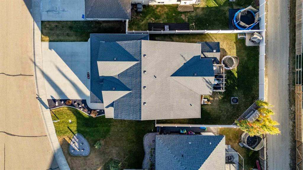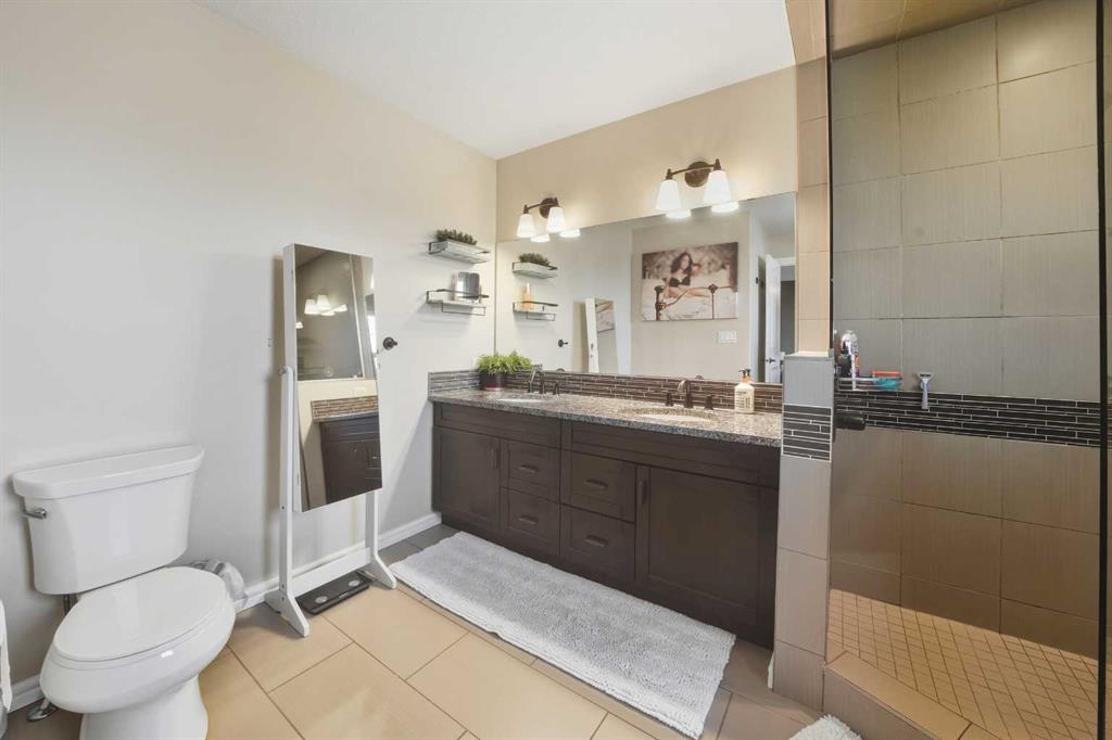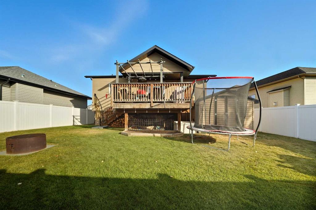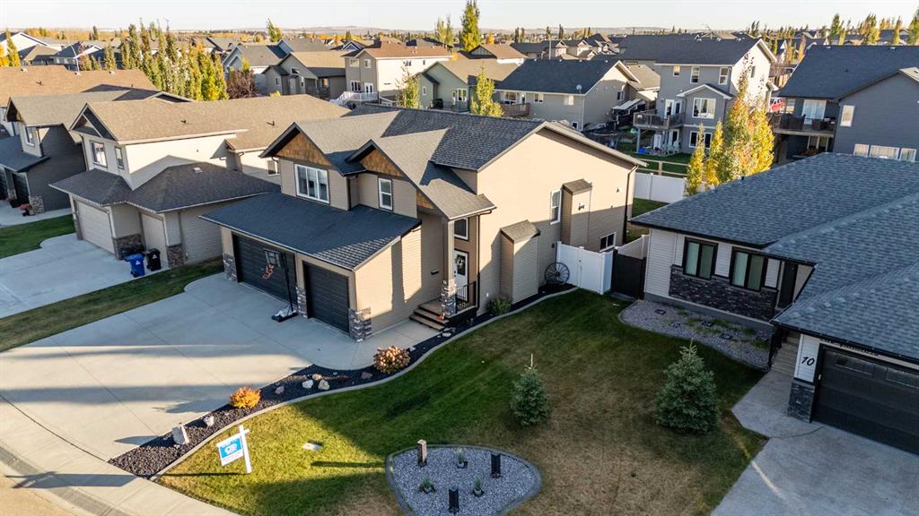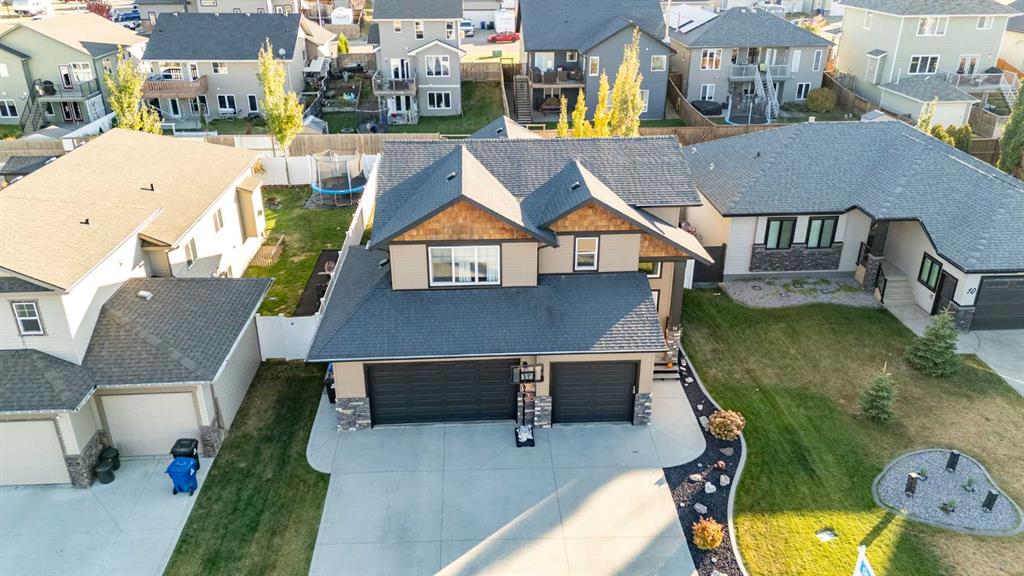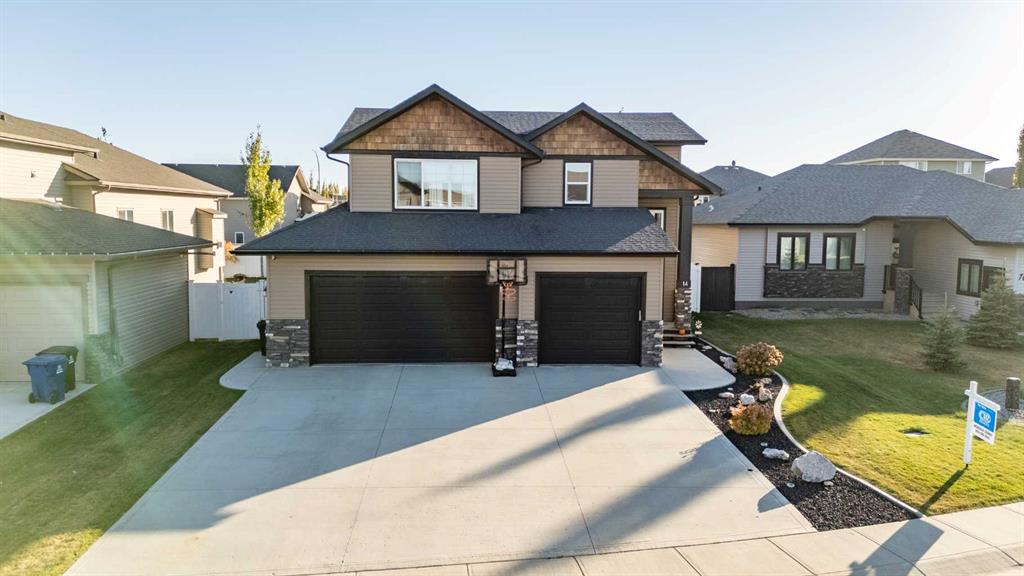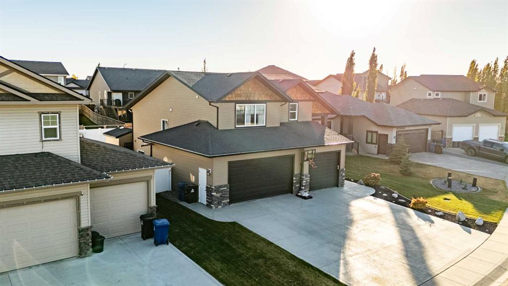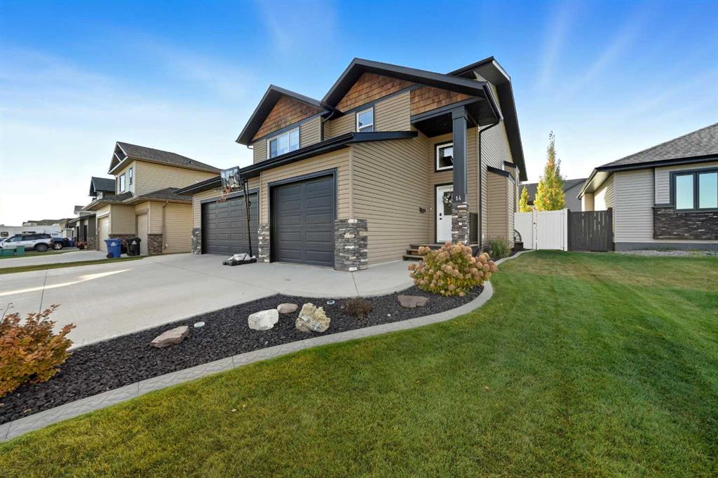 Pride of ownership is evident the moment you step inside this stunning custom-built modified bi-level. The spacious, bright foyer with tile flooring immediately sets the tone for the modern style and thoughtful design carried throughout this home. The open-concept main floor features a gorgeous kitchen with stained maple cabinetry, granite countertops, and stainless steel appliances. The living room impresses with its soaring 14-foot ceilings, creating a warm, inviting atmosphere centered around a cozy fireplace — perfect for relaxing or entertaining. This level includes two bedrooms, convenient for the kids . The primary suite is a true retreat, privately located above the garage and offering a luxurious ensuite with a soaker tub, separate shower, and a massive walk-in closet. The fully finished basement adds even more living space with an additional bedrooms, a spacious family room, a large bathroom, and the comfort of in-floor heating. Quality craftsmanship and attention to detail are showcased throughout, including matching granite in all bathrooms, central A/C, and custom blinds. Outside, you’ll find a beautifully landscaped and fully fenced yard with a storage shed, plus a heated triple garage and an oversized front parking pad — ideal for extra vehicles or toys. This home truly combines luxury, comfort, and functionality in one impressive package.