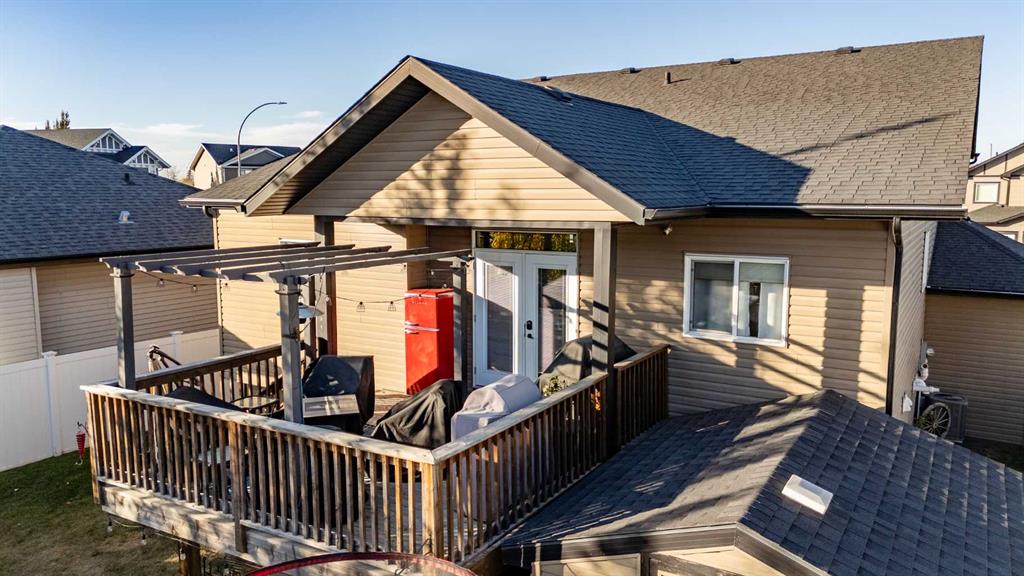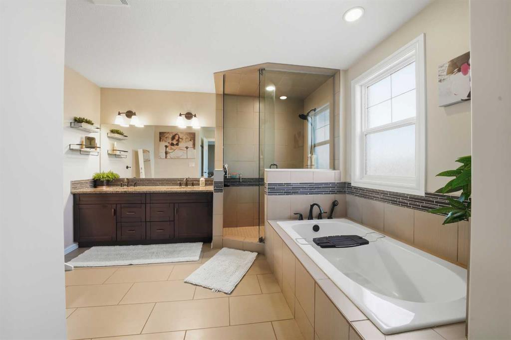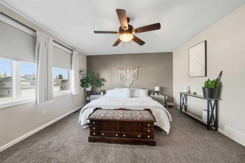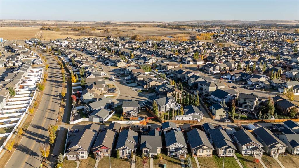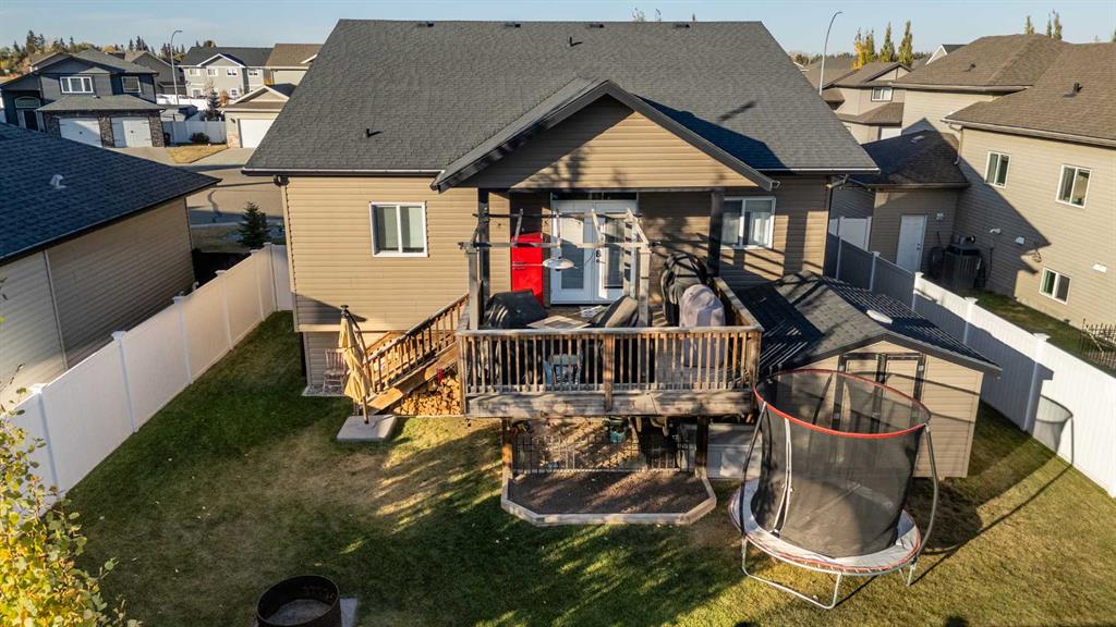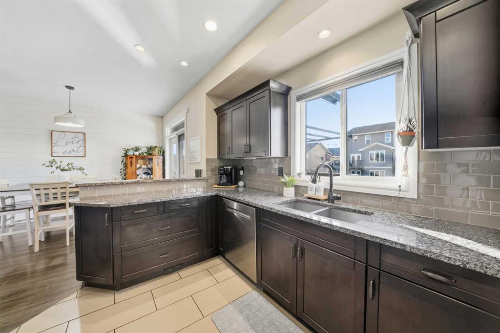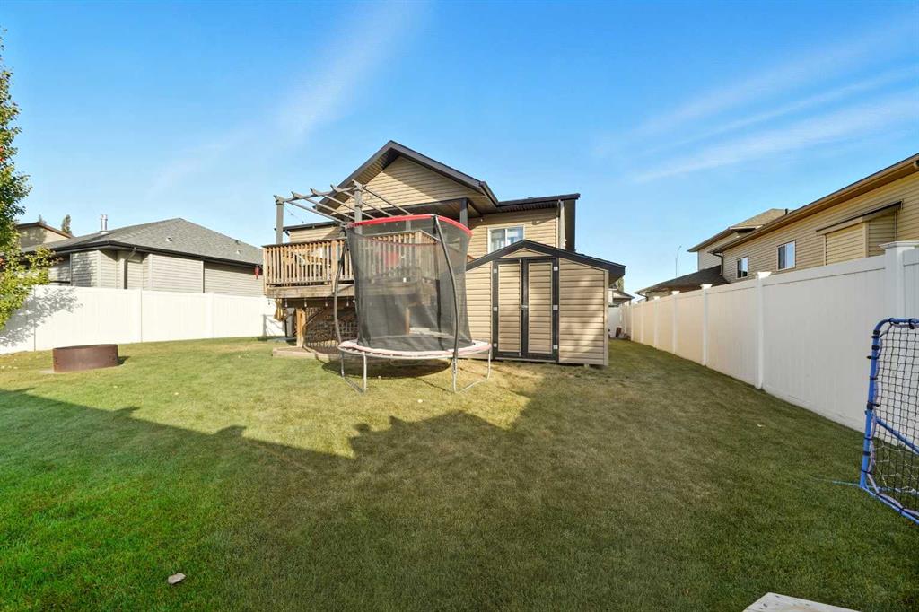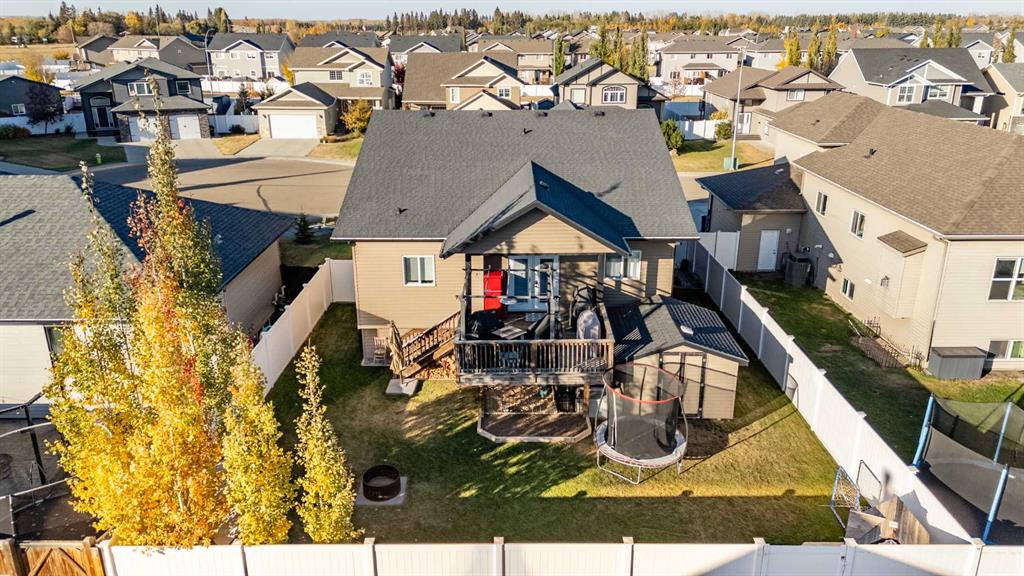 Pride of ownership is evident the moment you step inside this stunning custom-built modified bi-level. The spacious, bright foyer with tile flooring immediately sets the tone for the modern style and thoughtful design carried throughout this home. The open-concept main floor features a gorgeous kitchen with stained maple cabinetry, granite countertops, and stainless steel appliances. The living room impresses with its soaring 14-foot ceilings, creating a warm, inviting atmosphere centered around a cozy fireplace — perfect for relaxing or entertaining. This level includes two bedrooms, convenient for the kids . The primary suite is a true retreat, privately located above the garage and offering a luxurious ensuite with a soaker tub, separate shower, and a massive walk-in closet. The fully finished basement adds even more living space with an additional bedrooms, a spacious family room, a large bathroom, and the comfort of in-floor heating. Quality craftsmanship and attention to detail are showcased throughout, including matching granite in all bathrooms, central A/C, and custom blinds. Outside, you’ll find a beautifully landscaped and fully fenced yard with a storage shed, plus a heated triple garage and an oversized front parking pad — ideal for extra vehicles or toys. This home truly combines luxury, comfort, and functionality in one impressive package.