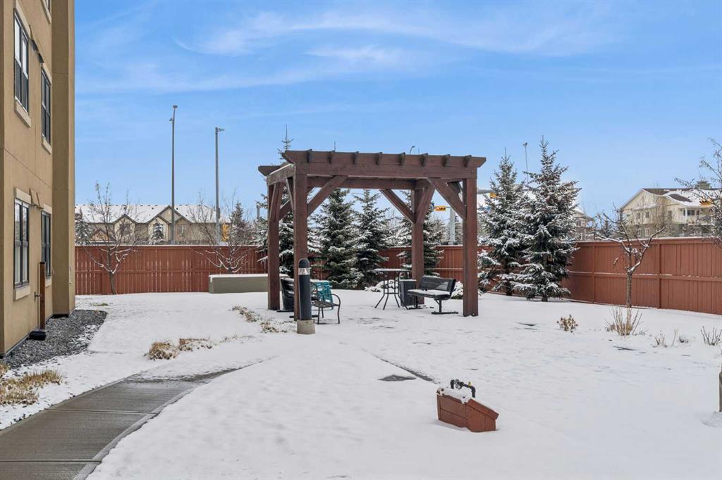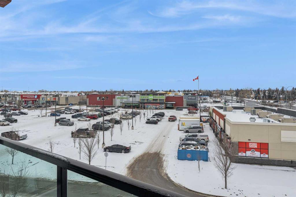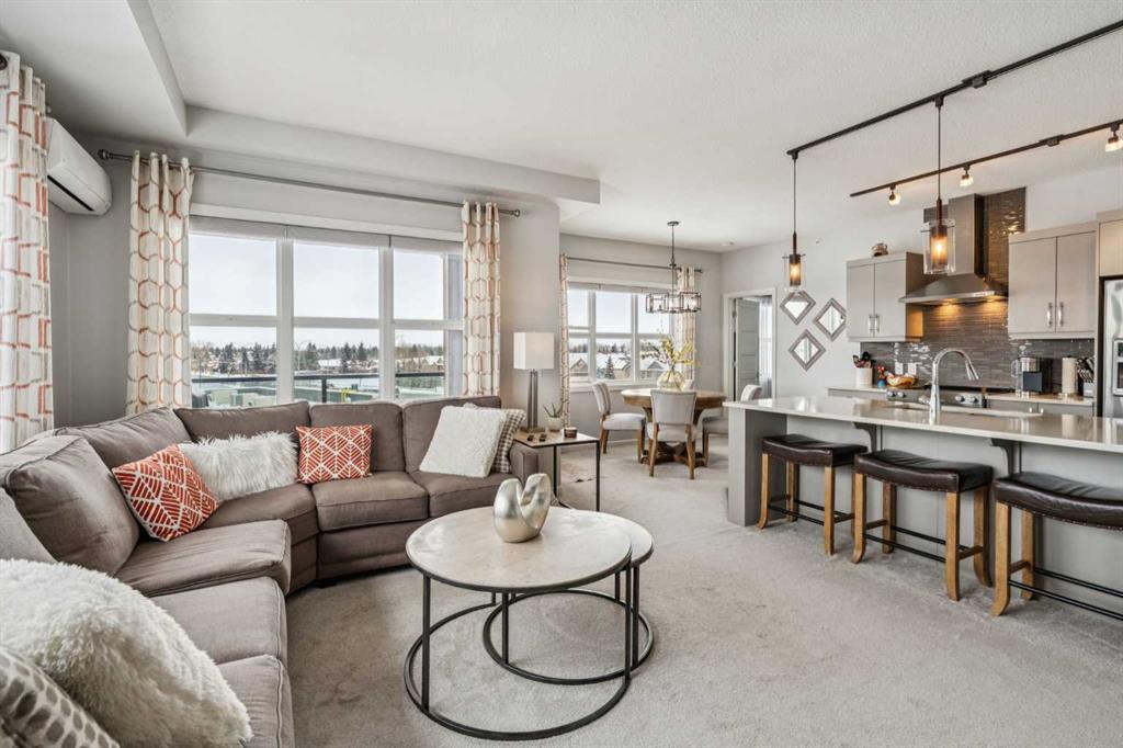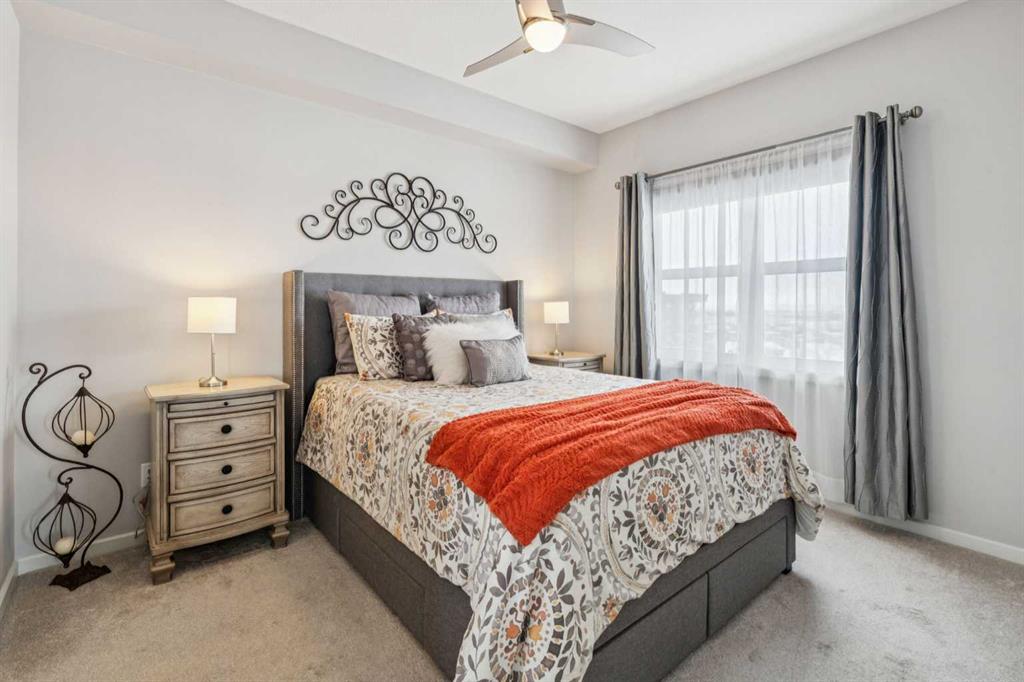 CHECK OUT OUR 24/7 VIRTUAL OPEN HOUSE. Welcome to The Chateaux, Airdrie’s premier 55+ complex, thoughtfully designed for comfortable, low-maintenance living in a vibrant community setting. This top-floor corner unit offers over 900 sq. ft. of bright, open living space with 2 bedrooms and 2 bathrooms, including a primary suite with private ensuite. The open-concept floorplan is perfect for everyday living and entertaining, featuring quartz countertops and over $50,000 in upgrades. The kitchen is a standout with a premium stainless steel appliance package, custom hood fan, and a microwave built seamlessly into the island. Additional upgrades include a stylish fireplace, air conditioning, high-quality blinds, upgraded light fixtures, and a convenient screen door for added comfort. Step outside to your covered private deck with gas BBQ hookup, the perfect spot for morning coffee or evening relaxation. This home also includes a titled underground parking stall with a storage cage above, providing both convenience and security. Residents of The Chateaux enjoy exceptional amenities, including a beautifully landscaped courtyard, a welcoming amenity/social room available for private bookings, and a secure underground workshop for woodworking enthusiasts. The building also features secure underground access, elevator service, bike storage, and a welcoming lobby, all within a well-maintained complex with in-floor heating for year-round efficiency and comfort. Ideally located within walking distance to groceries, shopping, restaurants, medical services, and banking, this home also offers easy access to Deerfoot Trail, especially with the convenient new 40th Ave exit. Enjoy nearby access to the Genesis Place recreation complex, East Lake walking/biking paths, and a dog park nearby in Kings Heights too. This pet-friendly community (two pets permitted, with size restrictions) offers the perfect balance of comfort, convenience, and community for those looking to enjoy an active, maintenance-free lifestyle. Book your viewing today!